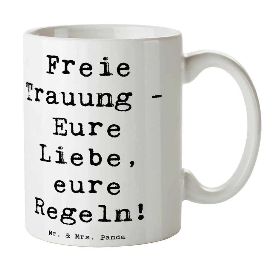 Die Tasse "Freie Trauung - Eure Liebe, eure Regeln!" aus der Hochzeit-Kollektion von Mr. & Mrs. Panda ist das perfekte Geschenk für frisch Verheiratete oder für all jene, die sich das Ja-Wort geben möchten. Sie ist aus hochwertiger Keramik gefertigt und brilliert mit einem bezaubernden Spruch, der die Individualität und die freie Entscheidung jedes Paares feiert.