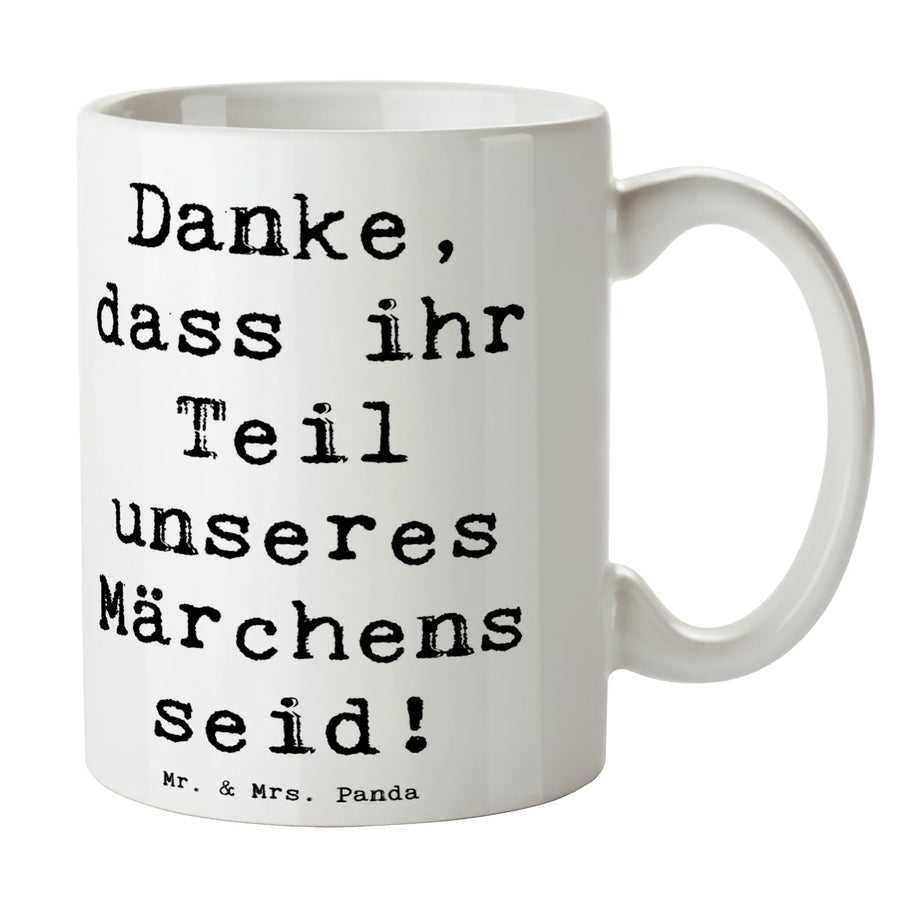 Die wunderschöne Tasse "Danke, dass ihr Teil unseres Märchens seid!" von Mr. & Mrs. Panda ist das perfekte Geschenk für Deine Hochzeitsgäste! Mit einem Füllvermögen von 325 ml bietet diese Keramiktasse nicht nur Platz für köstlichen Kaffee oder Tee, sondern ist auch ein charmantes Andenken an einen der schönsten Tage Deines Lebens. Unsere Tasse ist fantasievoll gestaltet und bringt genau den richtigen Hauch von Romantik in jede Tasse.