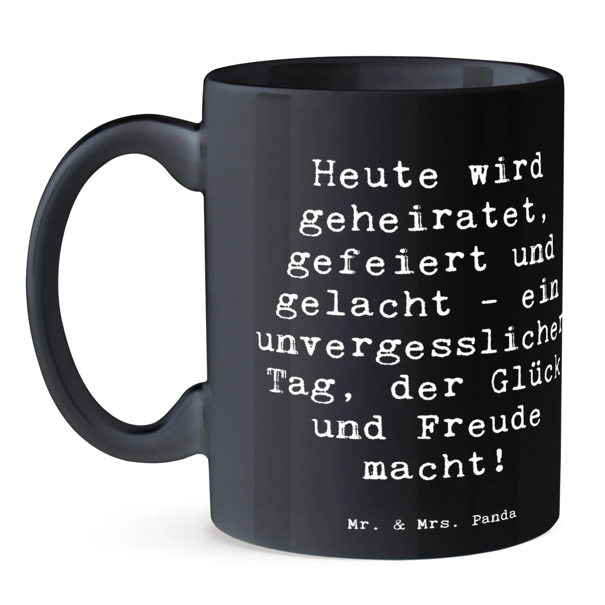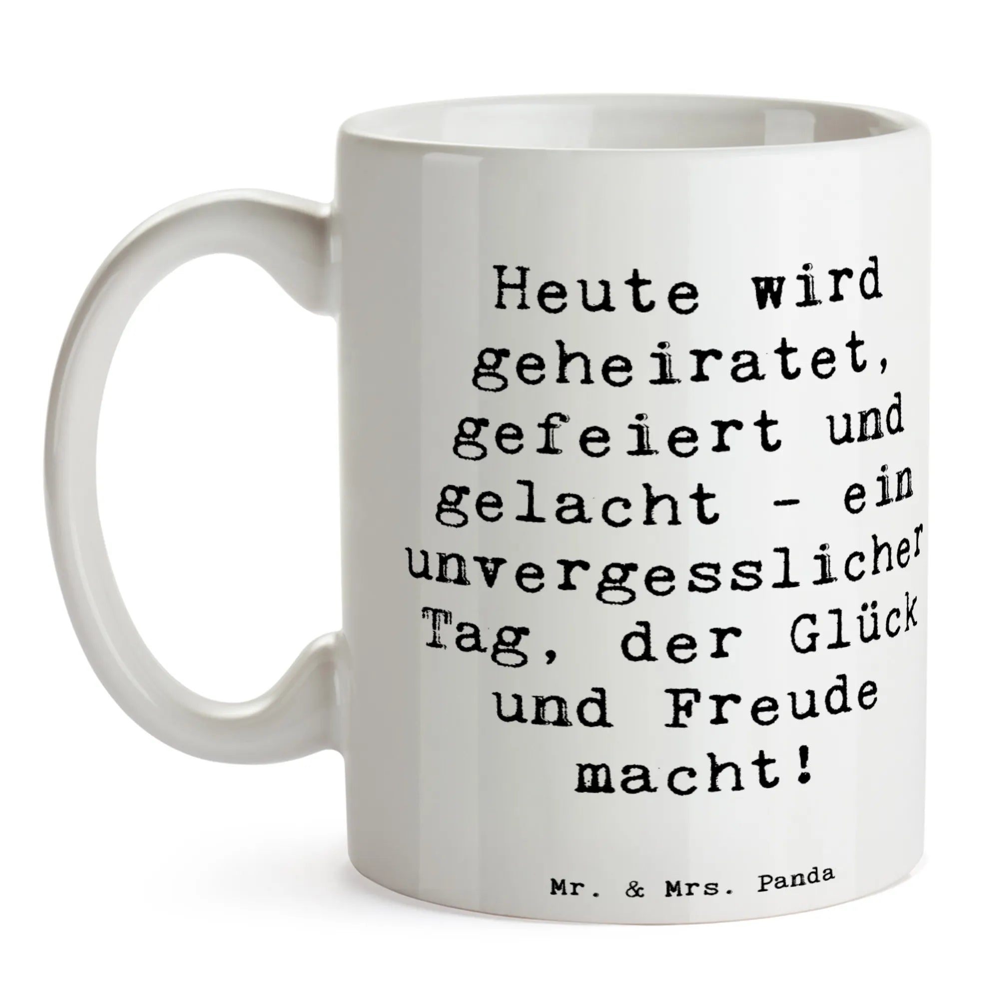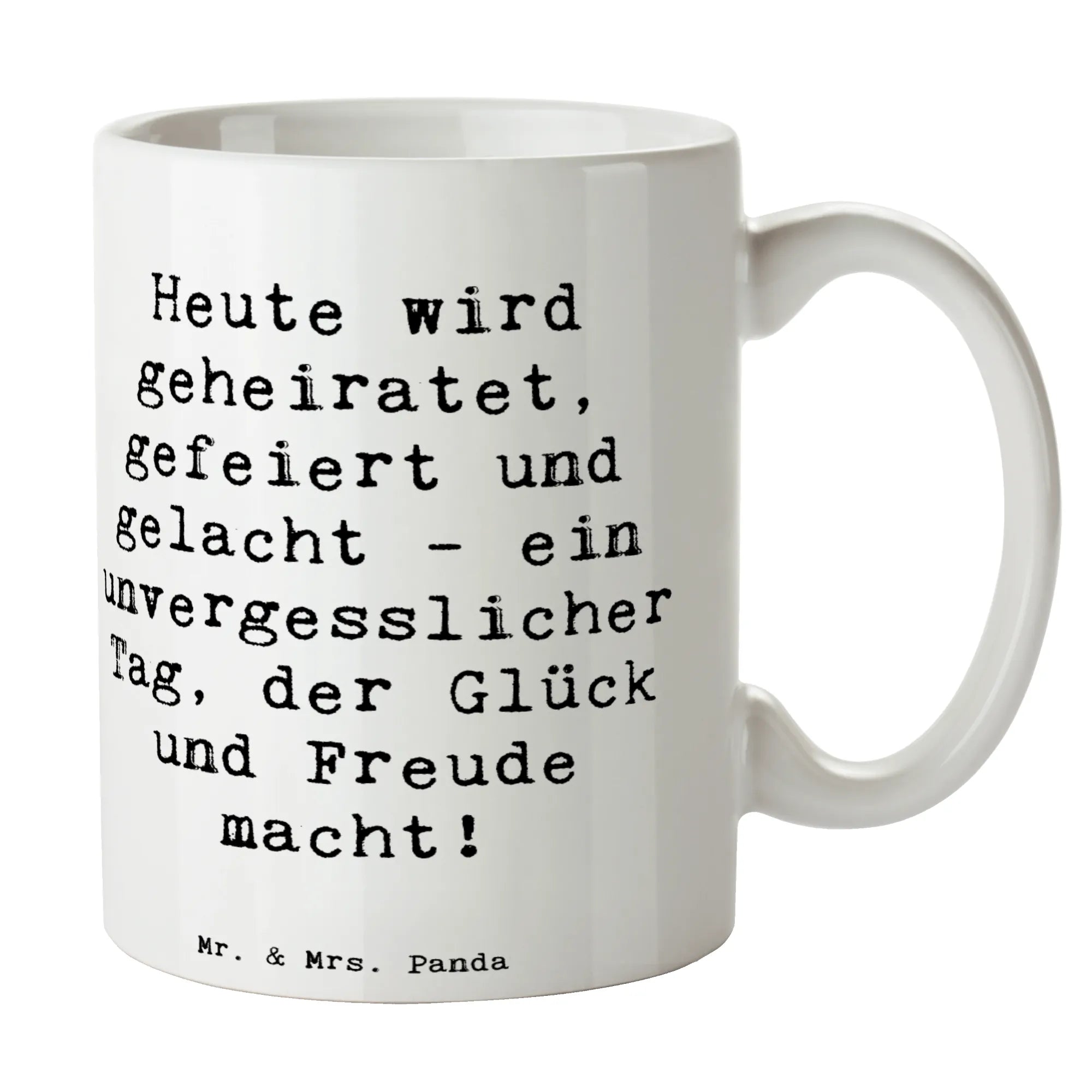 Liebhaber von Hochzeiten aufgepasst! Diese zauberhafte Tasse aus der Hochzeitskollektion von Mr. & Mrs. Panda ist das ideale Geschenk für alle, die den schönsten Tag ihres Lebens feiern. Mit dem motivierenden Spruch "Heute wird geheiratet, gefeiert und gelacht - ein unvergesslicher Tag, der Glück und Freude macht!" bringt diese Kaffeetasse nicht nur Freude, sondern auch unvergessliche Erinnerungen.