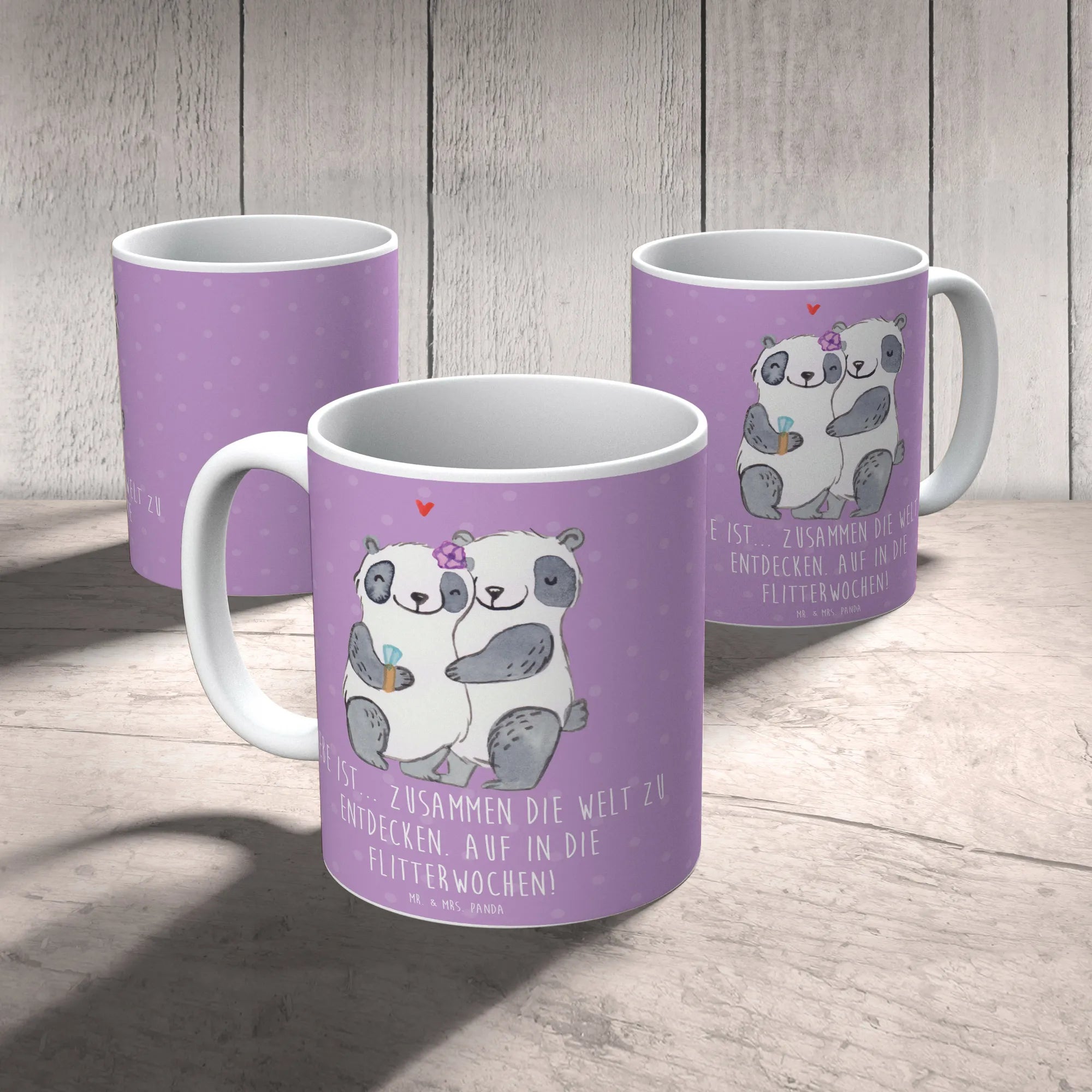 Die wunderschöne Tasse "Flitterwochen" von Mr. & Mrs. Panda ist das perfekte Geschenk für frisch verheiratete Paare und die, die es bald werden. Mit dem liebevollen Spruch "Liebe ist... zusammen die Welt zu entdecken. Auf in die Flitterwochen!" wird jeder Morgen zu einem besonderen Erlebnis.