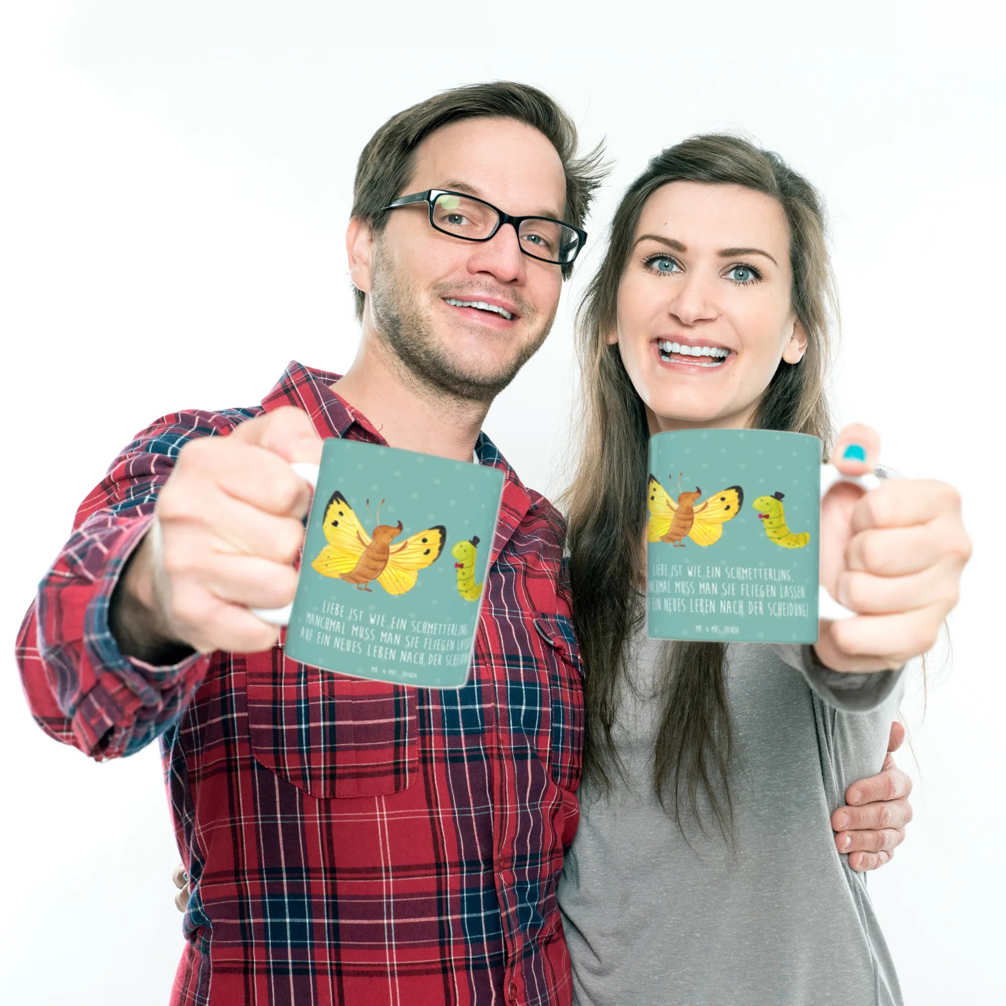 Entdecke die perfekte Tasse für dich oder deine beste Freundin in einer neuen Lebensphase! Die bezaubernde Keramiktasse von Mr. & Mrs. Panda mit dem liebevollen Spruch "Liebe ist wie ein Schmetterling, manchmal muss man sie fliegen lassen. Auf ein neues Leben nach der Scheidung!" bringt ein wenig Licht und Freude in die Zeit nach einer Trennung.