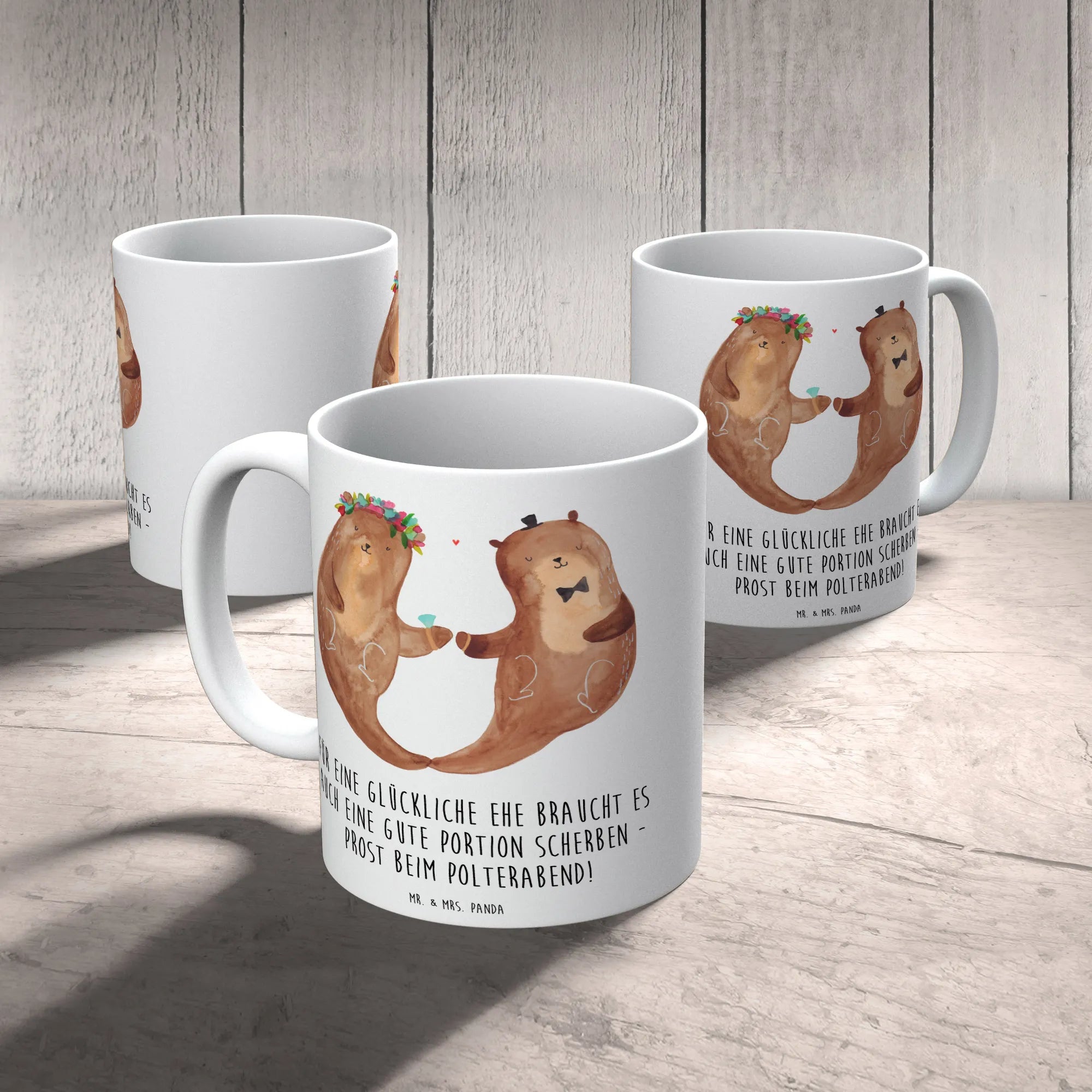 Die wunderschöne Polterabend-Tasse von Mr. & Mrs. Panda ist das perfekte Geschenk für alle, die kurz vor ihrer Hochzeit stehen und eine unvergessliche Feier erleben möchten! Mit dem liebevollen Spruch 'Für eine glückliche Ehe braucht es auch eine gute Portion Scherben - Prost beim Polterabend!' bringt diese Keramiktasse nicht nur ein Lächeln ins Gesicht, sondern auch eine Prise Humor in jeden Schluck. Ob du sie dem Brautpaar schenkst oder für dich selbst behältst, diese Tasse ist ein echter Hingucker!