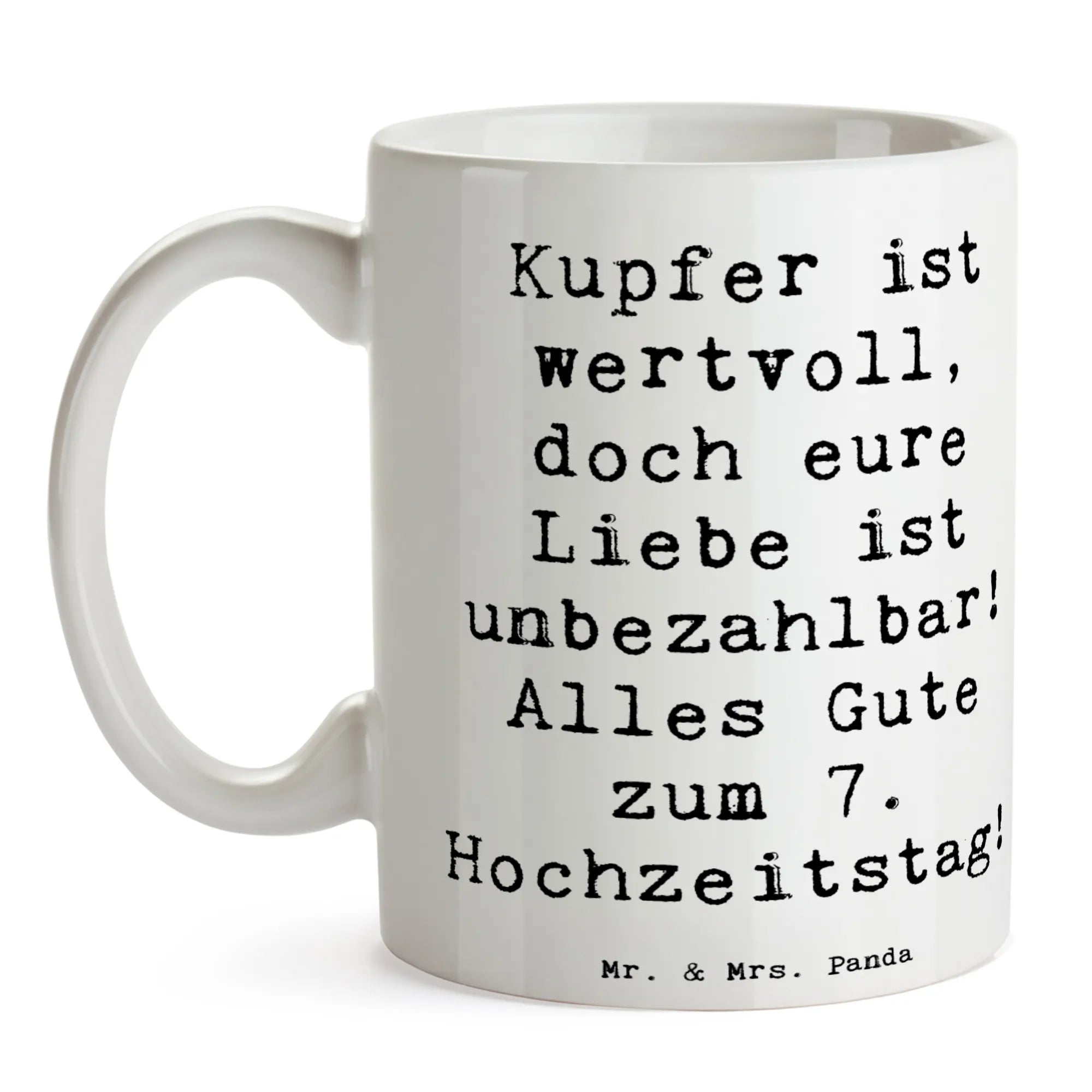 Entdecke die bezaubernde Tasse zum 7. Hochzeitstag aus der exklusiven Hochzeitskollektion von Mr. & Mrs. Panda! Mit dem liebevollen Spruch "Kupfer ist wertvoll, doch eure Liebe ist unbezahlbar! Alles Gute zum 7. Hochzeitstag!" ist diese Keramiktasse das perfekte Geschenk für Paare, die diesen besonderen Jahrestag feiern.