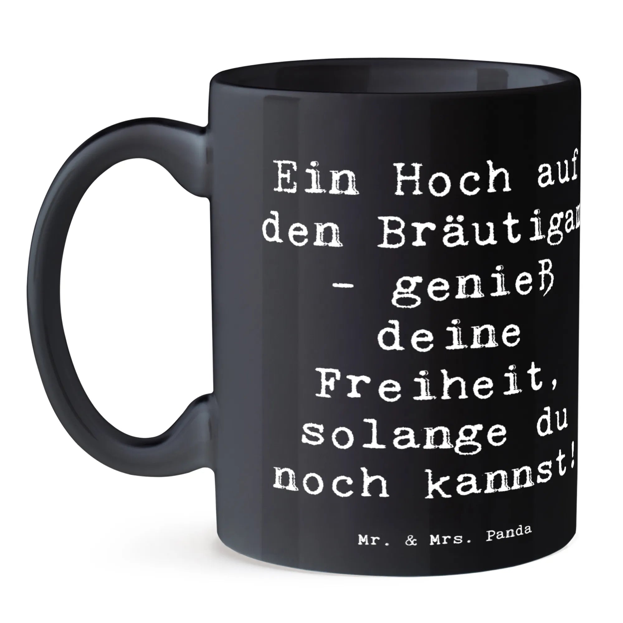 Mit dem lustigen Spruch "Ein Hoch auf den Bräutigam - genieß deine Freiheit, solange du noch kannst!" zaubert diese Tasse jedem ein Lächeln ins Gesicht. Sie ist die ideale Geschenkidee für Freunde und Familie, die bald den Schritt in die Ehe wagen.