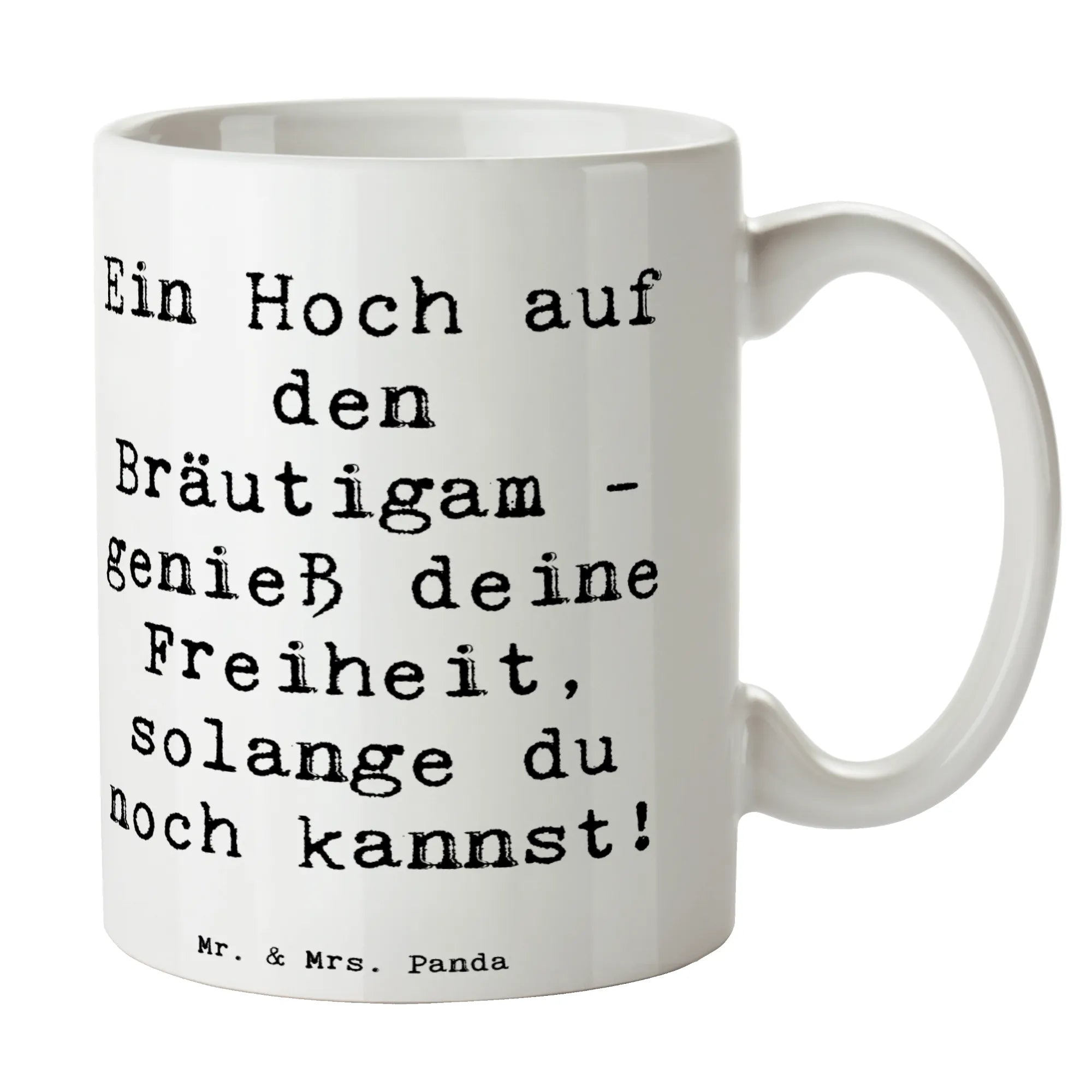 Du suchst nach dem perfekten Geschenk für einen Junggesellenabschied? Diese wunderschöne Keramiktasse von Mr. & Mrs. Panda ist genau das Richtige! Ob zum Prosit auf den Bräutigam oder als liebevolles Andenken für die letzten Tage in Freiheit, unsere Kaffeetasse mit dem Spruch 'Ein Hoch auf den Bräutigam - genieß deine Freiheit, solange du noch kannst!' bringt Freude und Erinnerungen in jeden Schluck.