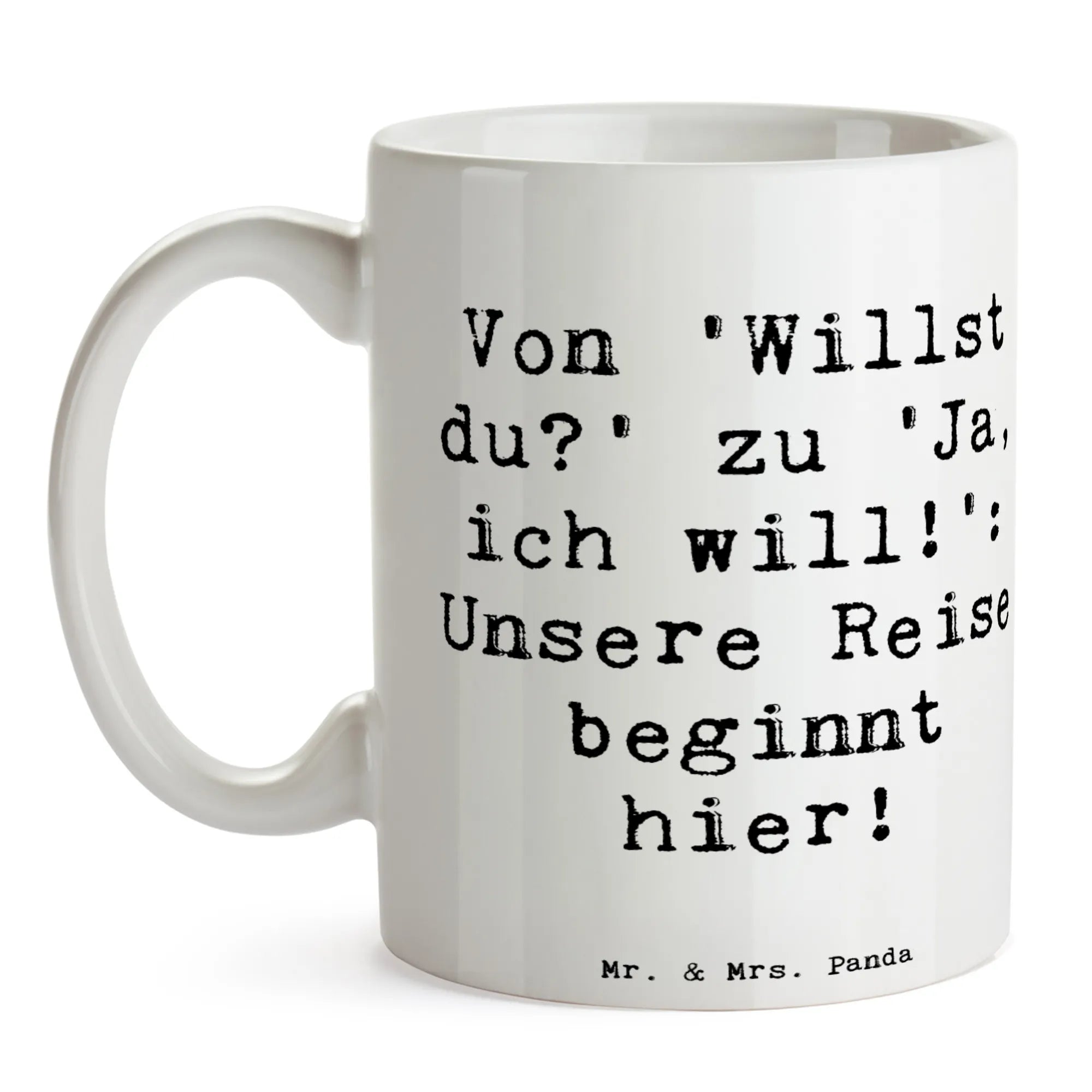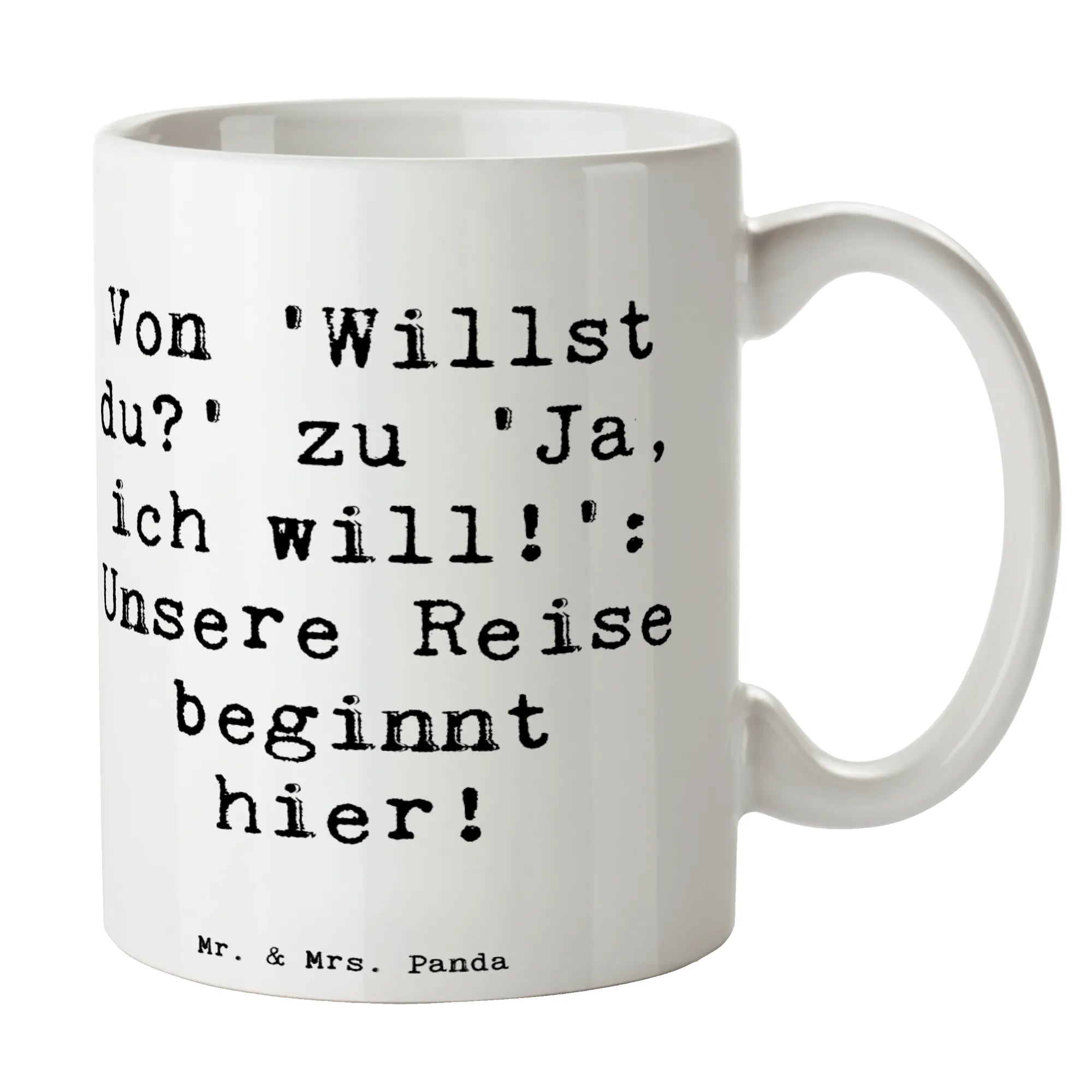 Entdecke die perfekte Tasse für Verlobte und frisch Verheiratete! Unsere wunderschöne Keramiktasse mit dem liebevollen Slogan 'Von 'Willst du?' zu 'Ja, ich will!': Unsere Reise beginnt hier!' ist das ideale Geschenk für jeden, der sich in den aufregenden Vorbereitungen zur Hochzeit befindet.