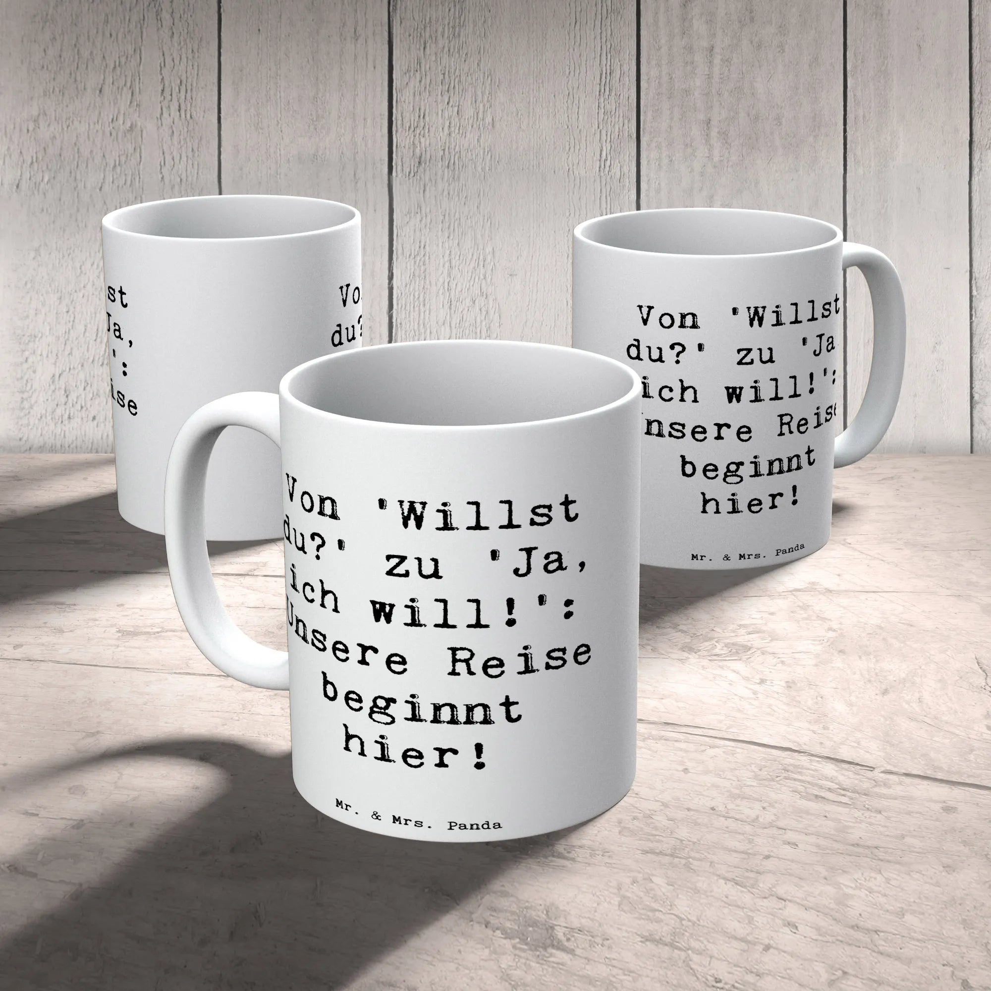 Entdecke die bezaubernde Verlobungs-Tasse aus der Hochzeit Kollektion von Mr. & Mrs. Panda! Diese wunderschöne spülmaschinenfeste Keramiktasse ist der perfekte Begleiter für all eure gemeinsamen Kaffeepausen und Teestunden. Mit dem liebevollen Spruch 'Von 'Willst du?' zu 'Ja, ich will!': Unsere Reise beginnt hier!' wird jeder Schluck zu einem besonderen Moment des Erinnerns und Vorfreuens. Ob als Geschenk zur Verlobung, als persönliches Erinnerungsstück oder einfach für dich selbst – diese Tasse ist ein echtes Must-Have!