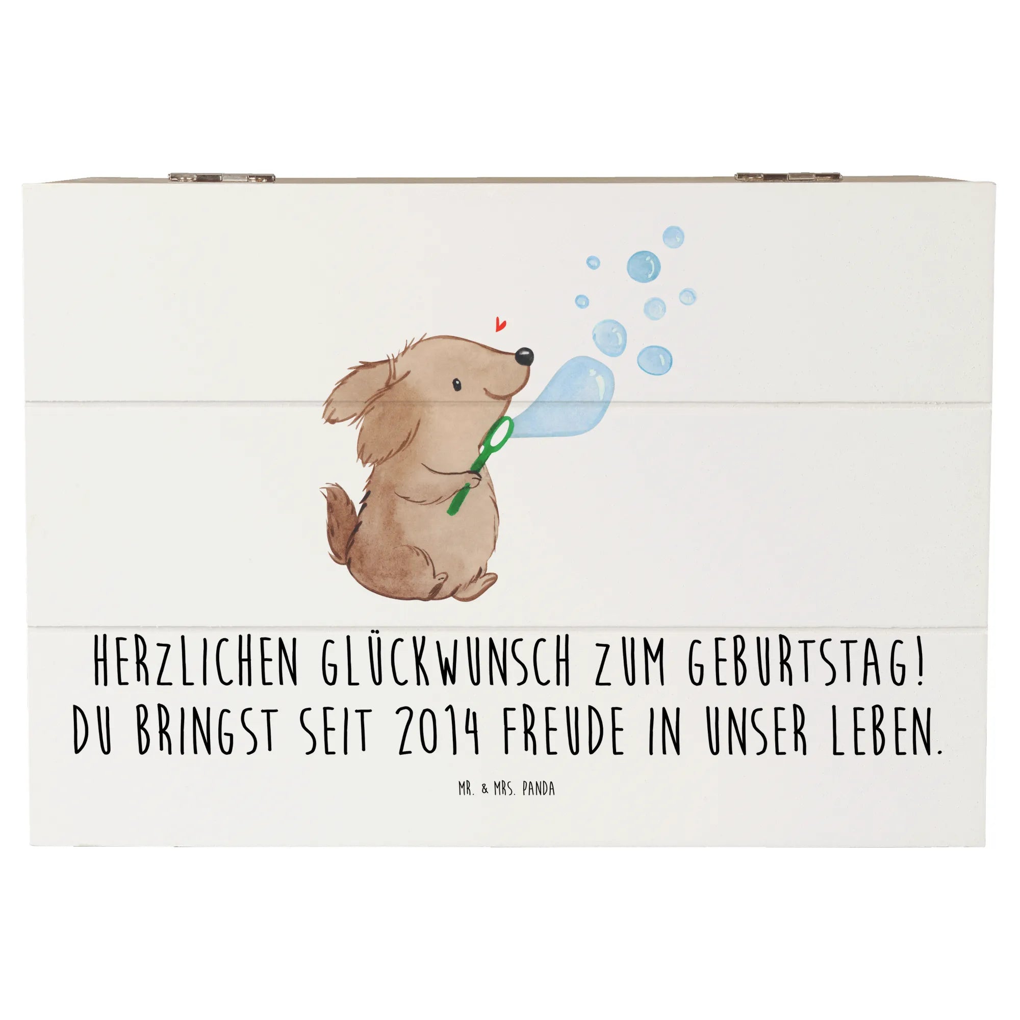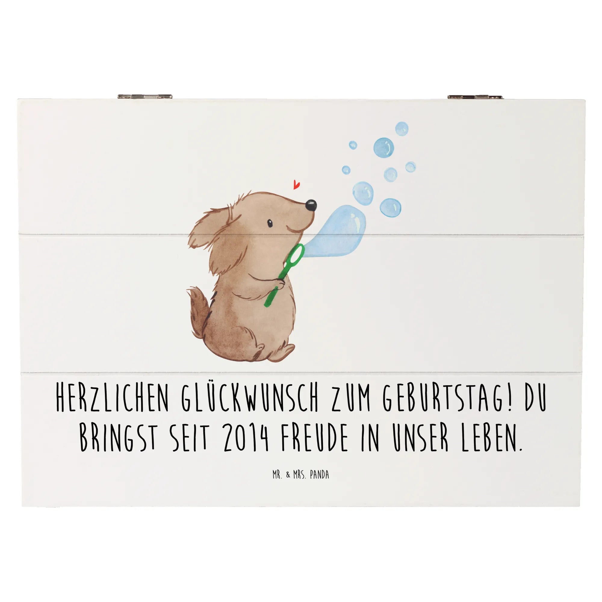 Entdecke die bezaubernde Holzkiste 2014 von Mr. & Mrs. Panda, die das perfekte Geschenk zu jedem Geburtstag darstellt. Mit dem liebevollen Slogan 'Herzlichen Glückwunsch zum Geburtstag! Du bringst seit 2014 Freude in unser Leben.' ist diese Kiste nicht nur ein wunderschönes Deko-Element, sondern auch ein wichtiger Aufbewahrungsort für all die kostbaren Erinnerungen des Lebens.