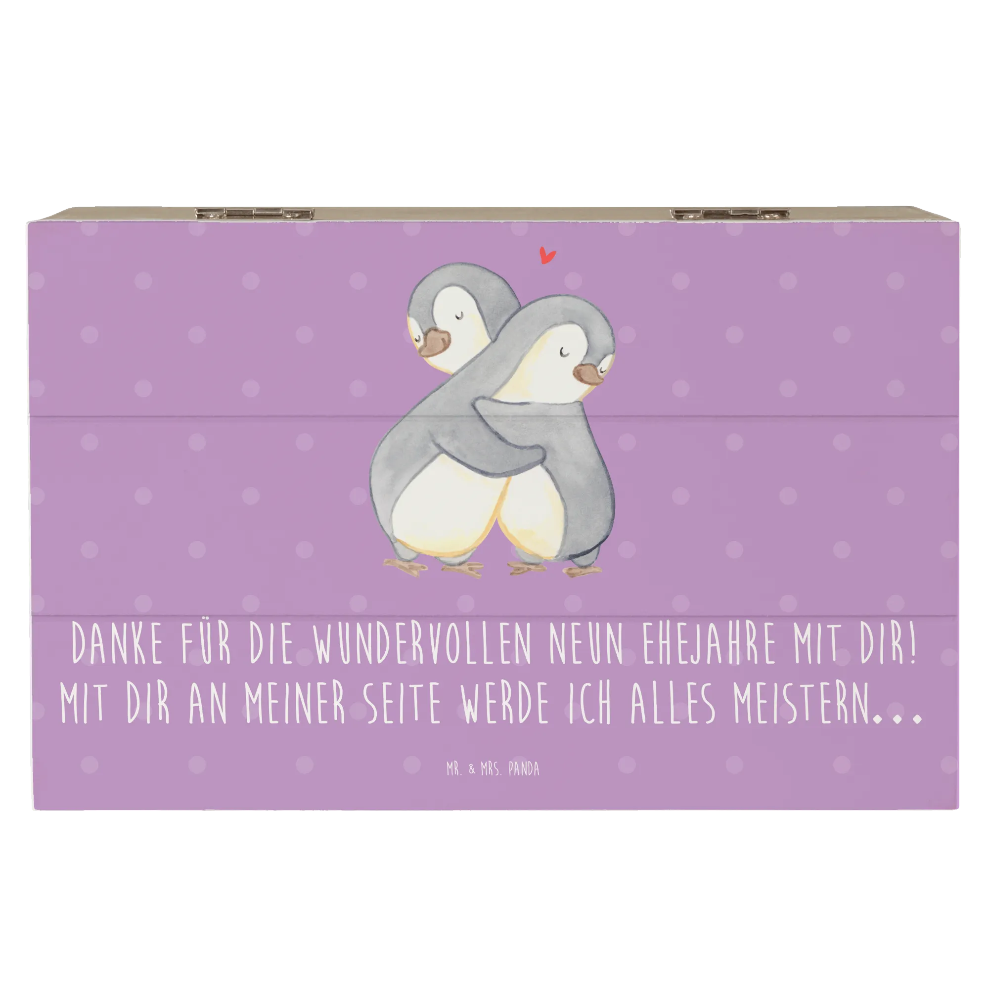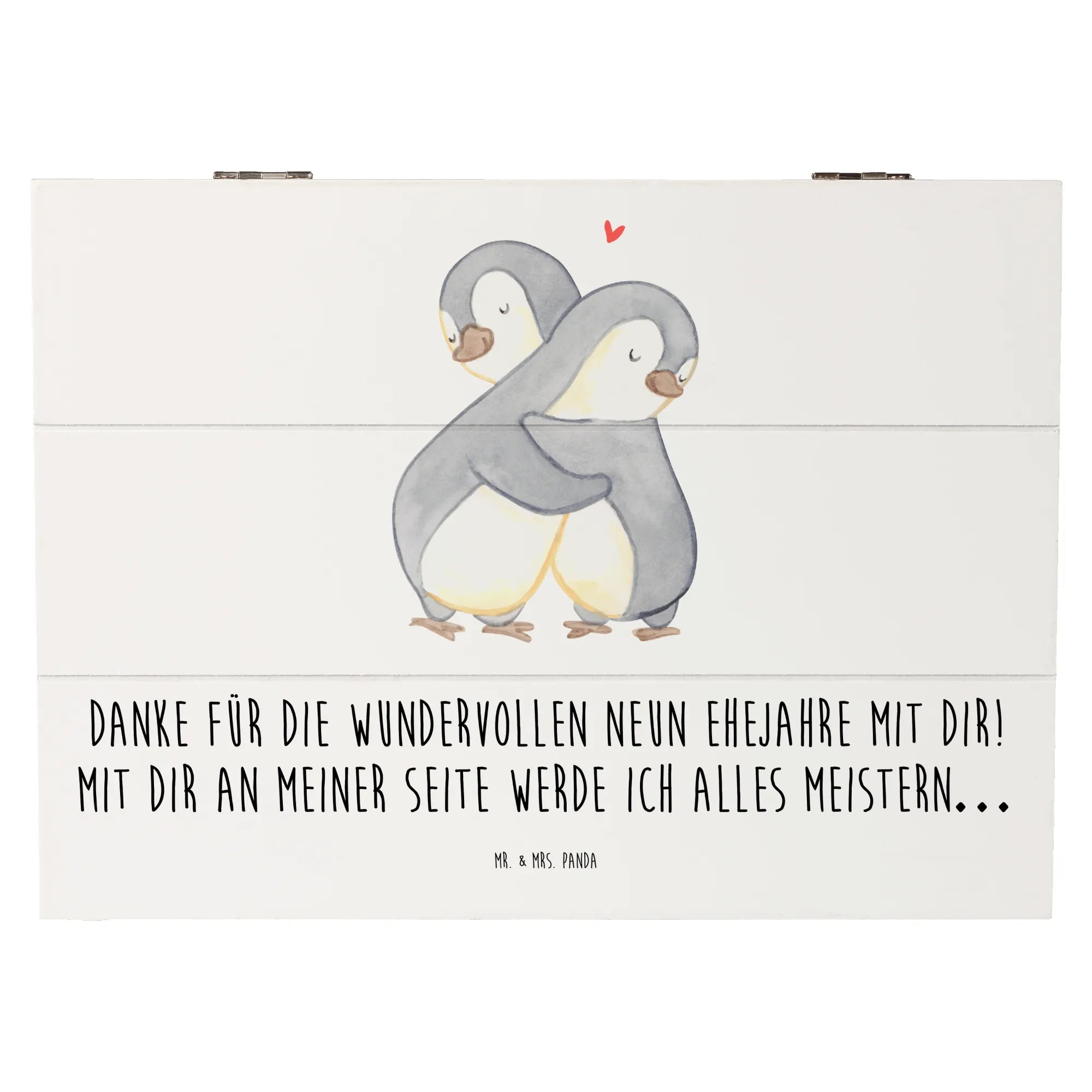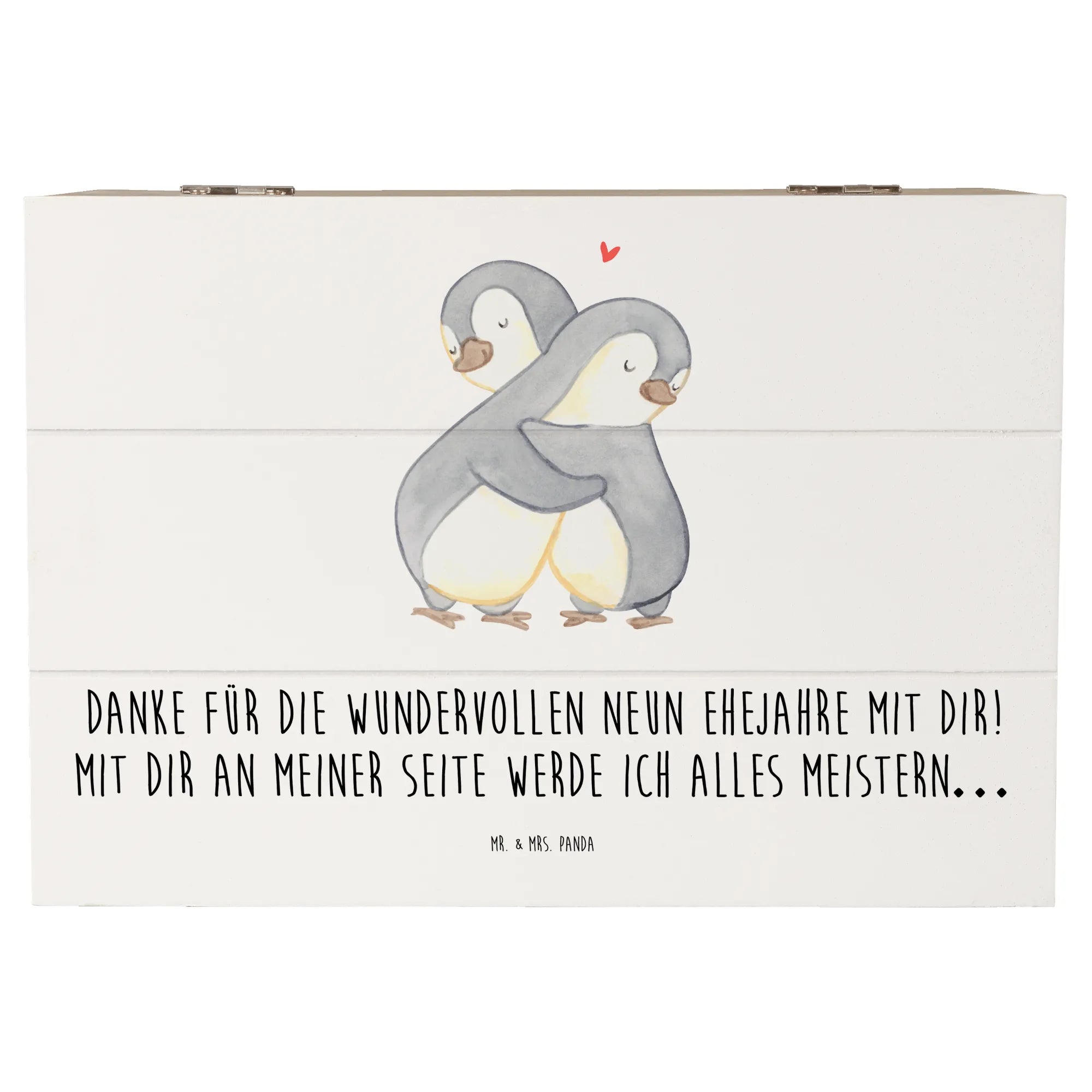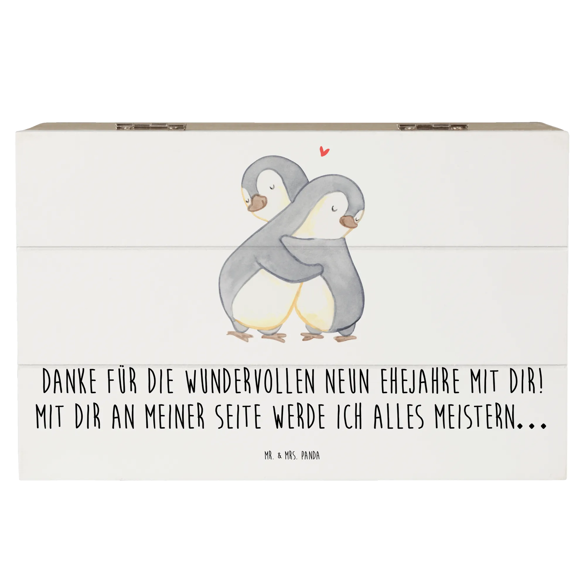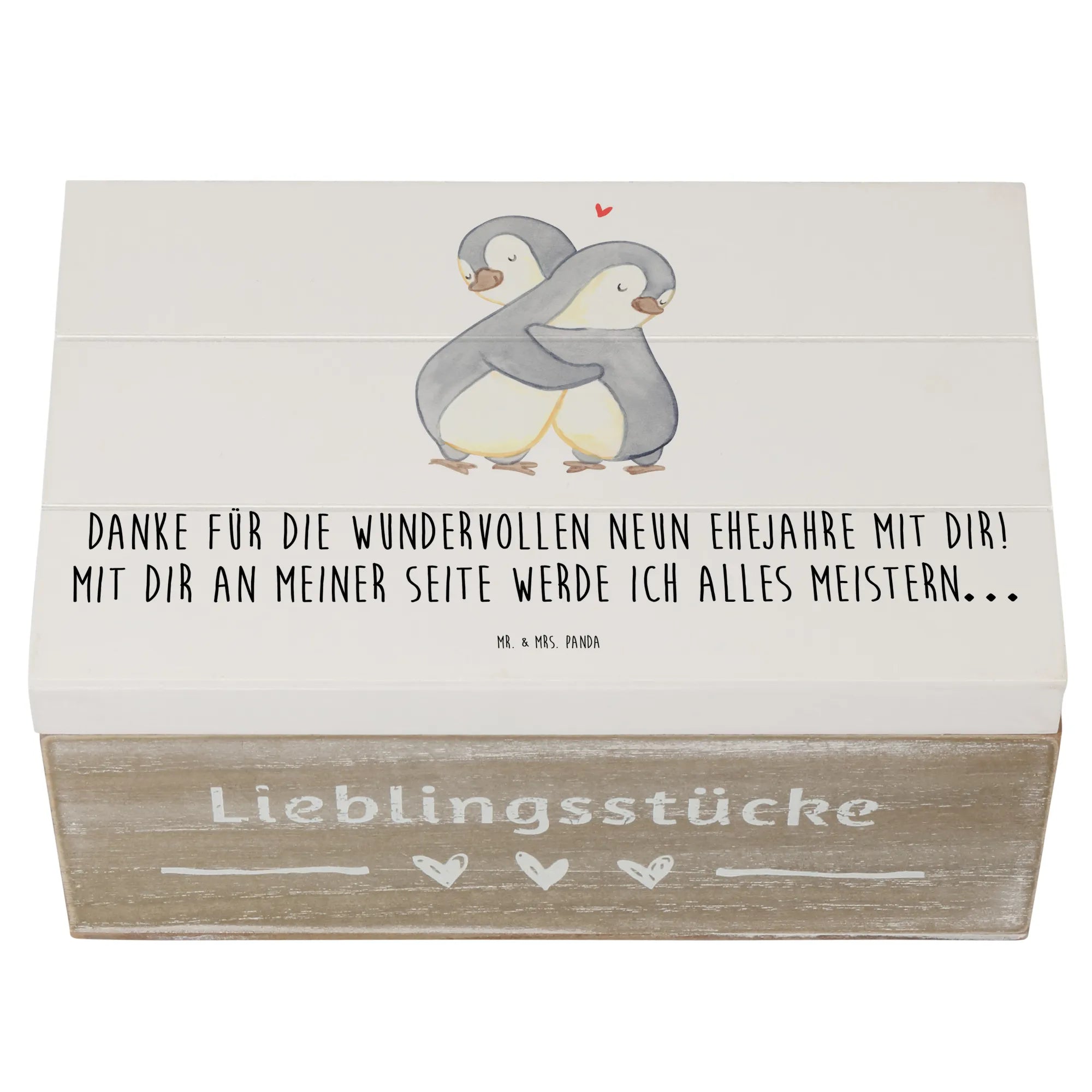 Die Kiste misst 220 mm x 150 mm x 120 mm und ist aus robuster Holzfaser gefertigt, die auch nach Jahren noch stabil bleibt. Mit den liebevollen Sprüchen von Mr. & Mrs. Panda wie "Danke für die wundervollen neun Ehejahre mit dir! Mit dir an meiner Seite werde ich alles meistern…" wird sie zu einem echten Emotionalitätsbringer in deinem Leben.