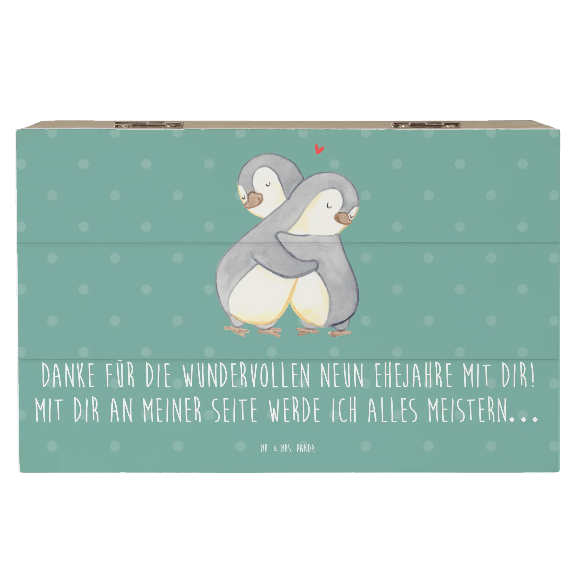 Die wunderschöne Holzkiste mit dem zauberhaften Motiv "9. Hochzeitstag Keramikhochzeit" ist das perfekte Geschenk für jeden, der die Liebe feiert! Ob zur Feier des neunten Ehejahres oder einfach als liebevolle Erinnerung an die gemeinsamen Jahre – diese Erinnerungskiste von Mr. & Mrs. Panda bietet nicht nur einen stilvollen Platz für persönliche Schätze, sondern auch eine herzerwärmende Botschaft: "Danke für die wundervollen neun Ehejahre mit dir! Mit dir an meiner Seite werde ich alles meistern…".