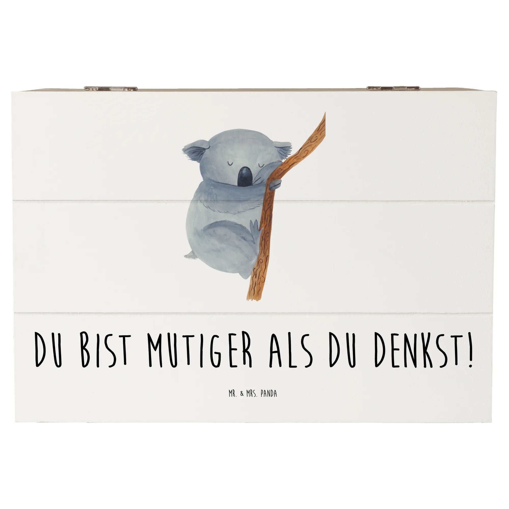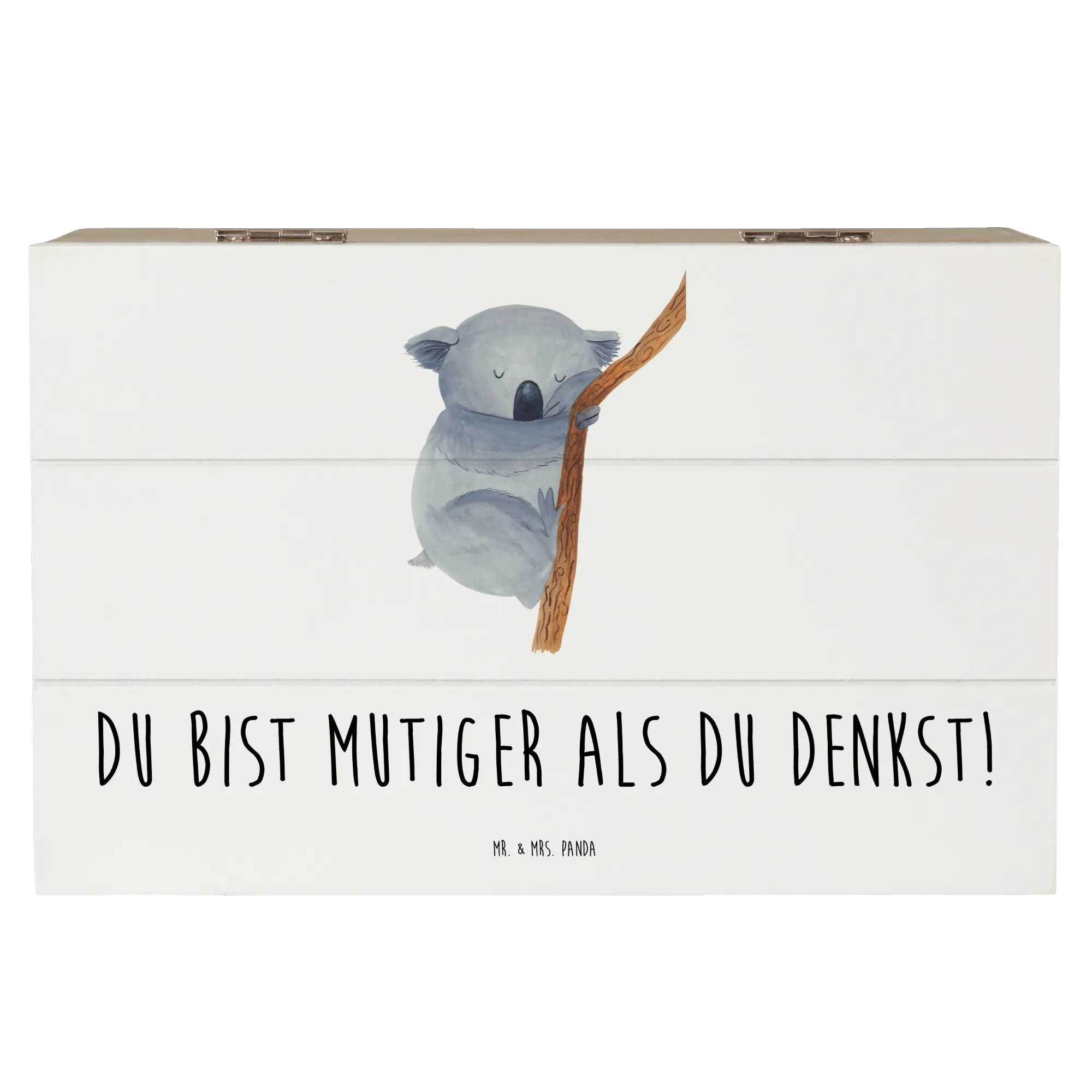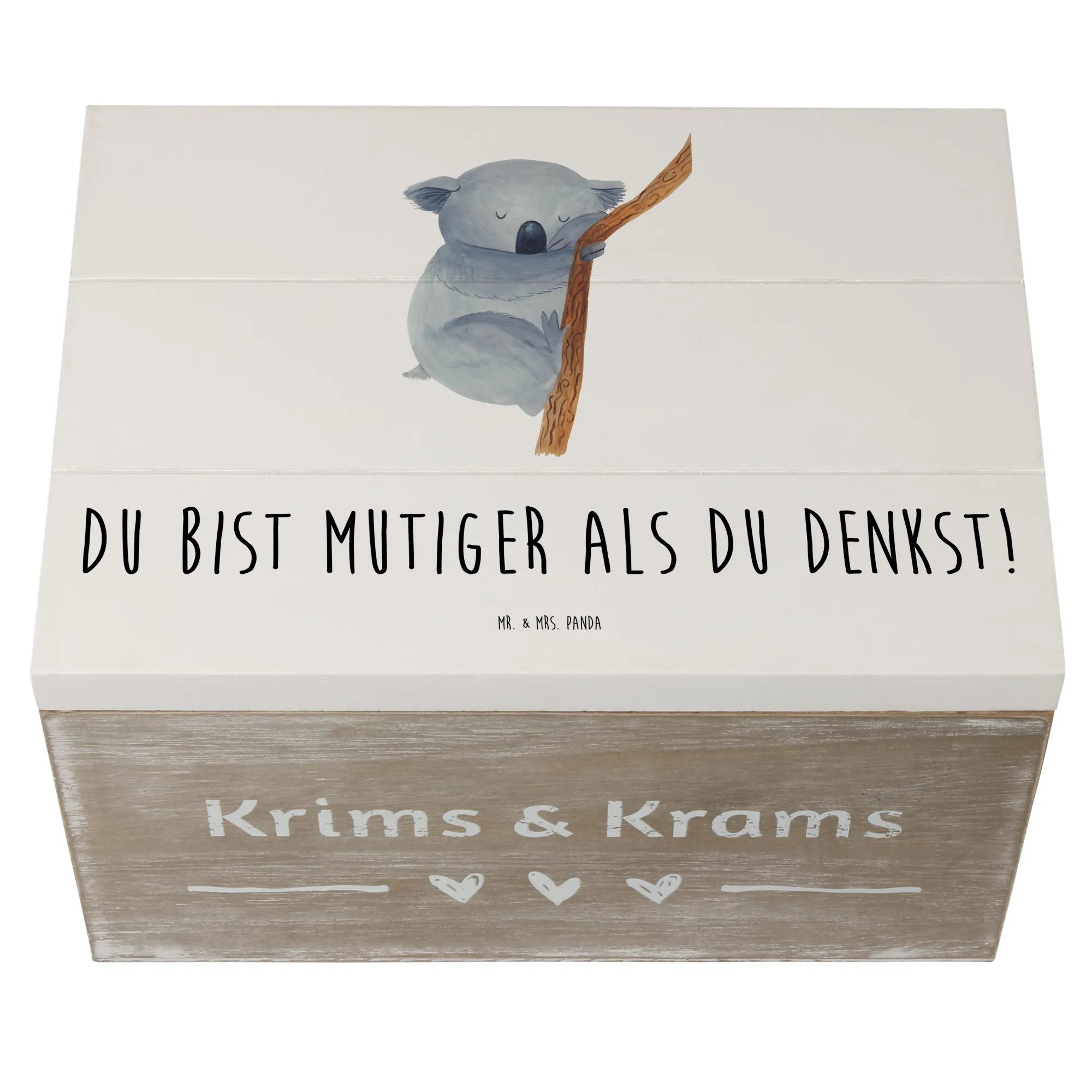 Entdecke die wundervolle Holzkiste ‚Alleine schlafen lernen‘ aus der Mutmacher Kollektion von Mr. & Mrs. Panda! Diese einzigartige Erinnerungskiste ist nicht nur praktisch zum Aufbewahren kleiner Schätze, sondern stecken auch voller Hoffnung und Mut. Mit dem liebevollen Slogan ‚Du bist mutiger als du denkst!‘ wird diese Kiste zum perfekten Begleiter für die Kleinen, die sich vielleicht das erste Mal von ihren Eltern trennen müssen, um alleine zu schlafen.