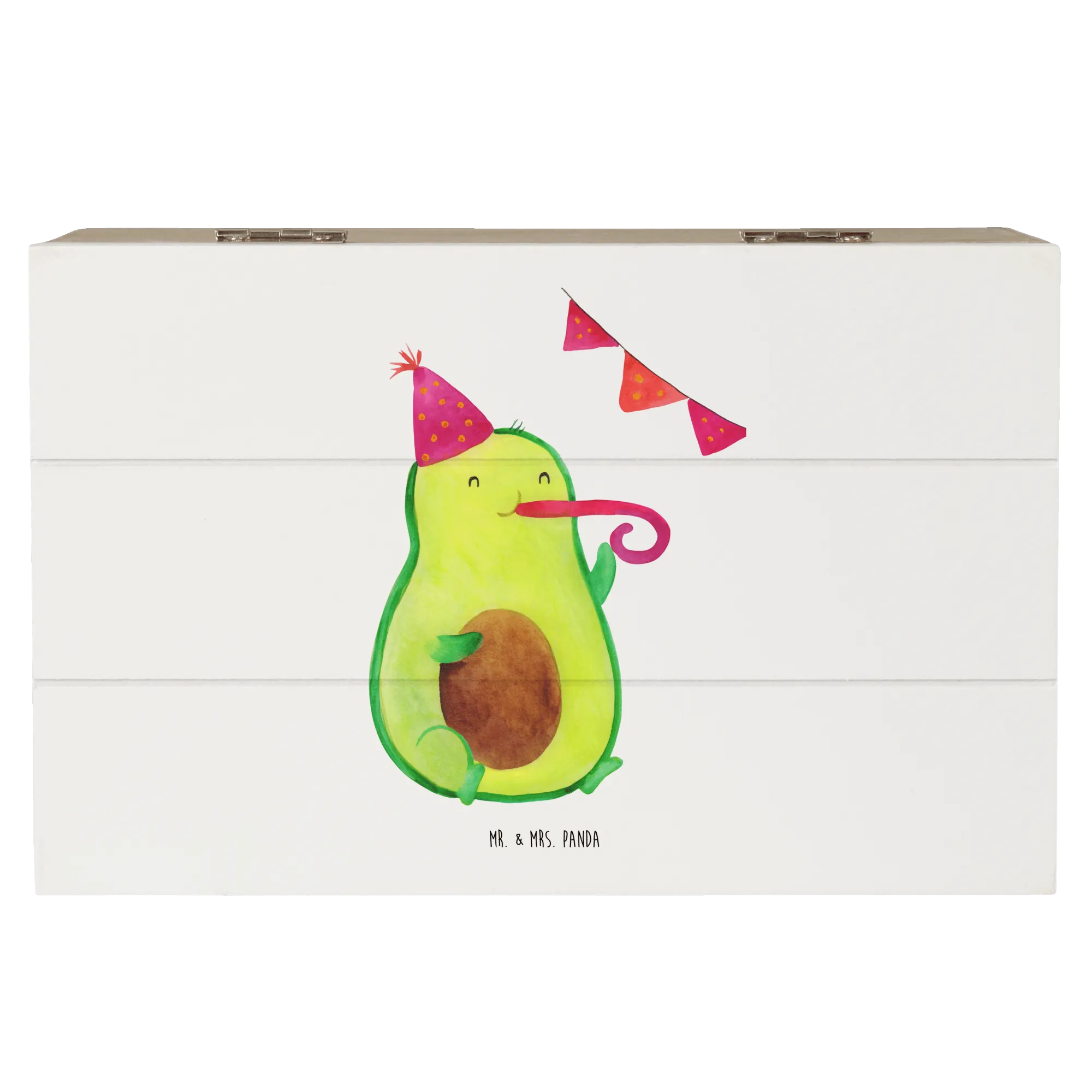 Die Holzkiste "Avocado Birthday" von Mr. & Mrs. Panda ist der perfekte Begleiter für jeden Geburtstag und verkörpert Freude und Lebensfreude. Mit einem fröhlichen Motiv einer süßen Avocado, die einen Partyhut trägt und in eine Partypfeife bläst, bringt diese Kiste sofort gute Laune.