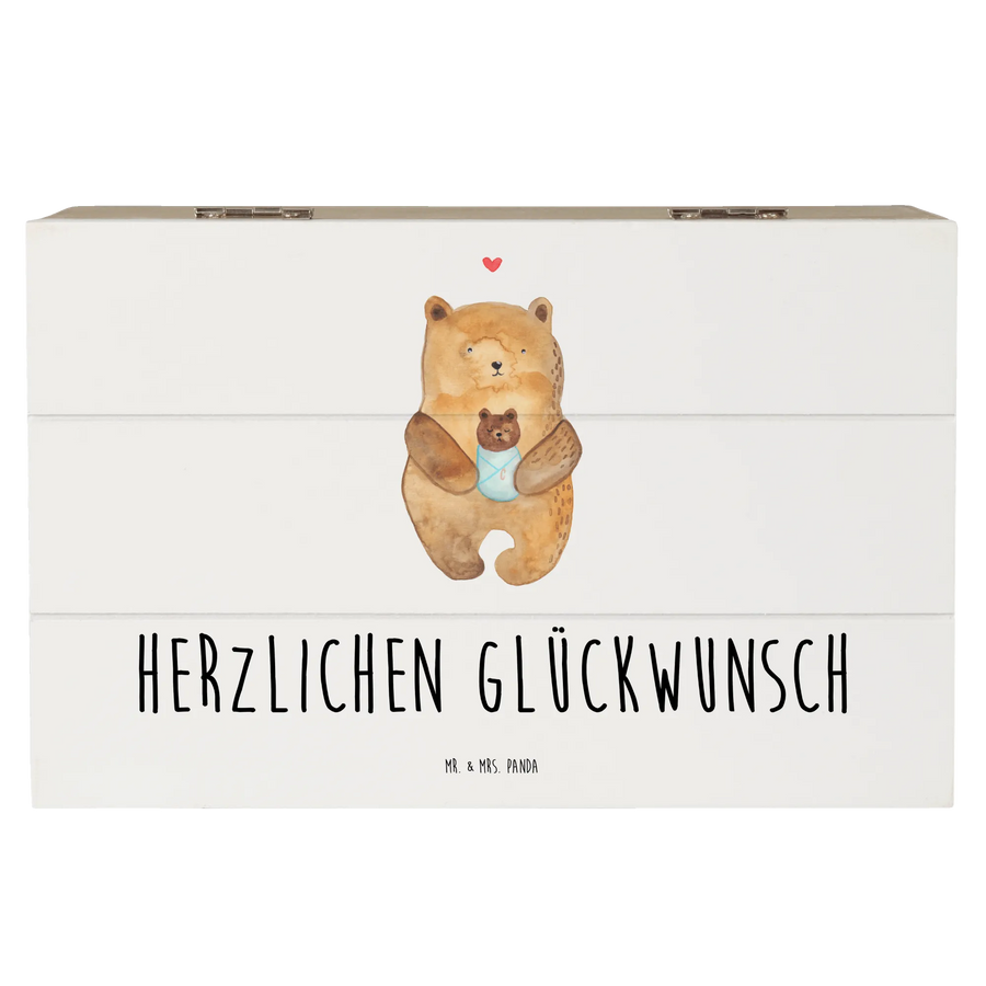Diese wunderschöne Holzkiste aus der Bär-Kollektion von Mr. & Mrs. Panda vereint zärtliches Design und praktische Funktion. Das liebevoll handgezeichnete Motiv eines Bären, der ein kleines Babybär in den Armen hält, macht die Box zur perfekten Erinnerungskiste für neue Eltern, Großeltern oder Paten.