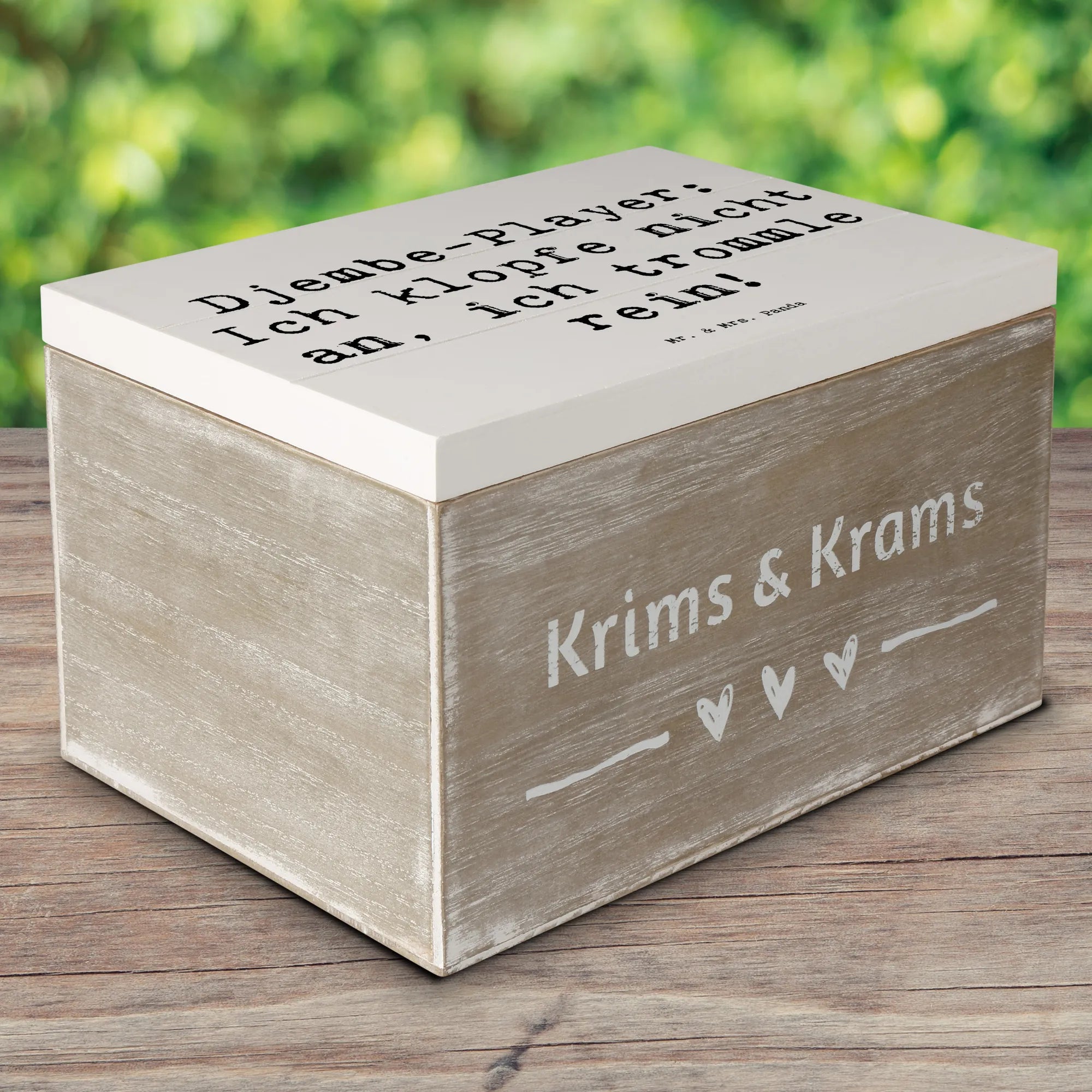 Die Djembe ist ein beeindruckendes Instrument, das aus Westafrika stammt. Ihre kraftvollen Klänge bringen nicht nur Freude, sondern fördern auch das Miteinander und die Musiktraditionen. Wenn Du auf der Suche nach einem Geschenk für einen Musiker oder Musikliebhaber bist, dann ist diese Erinnerungskiste genau das Richtige! Der witzige Spruch "Djembe-Player: Ich klopfe nicht an, ich trommle rein!" sorgt für ein Lächeln und bringt einen Hauch von afrikanischer Musiktradition in jedes Zuhause.
