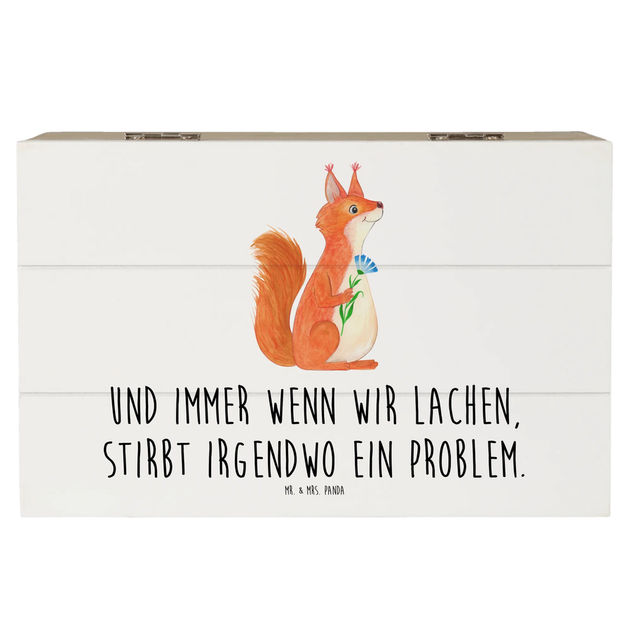 Das niedliche Eichhörnchen mit einer Blume in der Hand zaubert jedem ein Lächeln ins Gesicht und sorgt für gute Laune. Auf der Kiste steht der Spruch: "Und immer wenn wir lachen, stirbt irgendwo ein Problem." Dieses positive Motto macht die Kiste zu einer perfekten Geschenkbox für Freunde und Familie. Egal ob du sie als Aufbewahrungsbox für kleine Schätze oder als originelle Geschenkverpackung verwendest, sie ist nicht nur schön, sondern auch funktional.