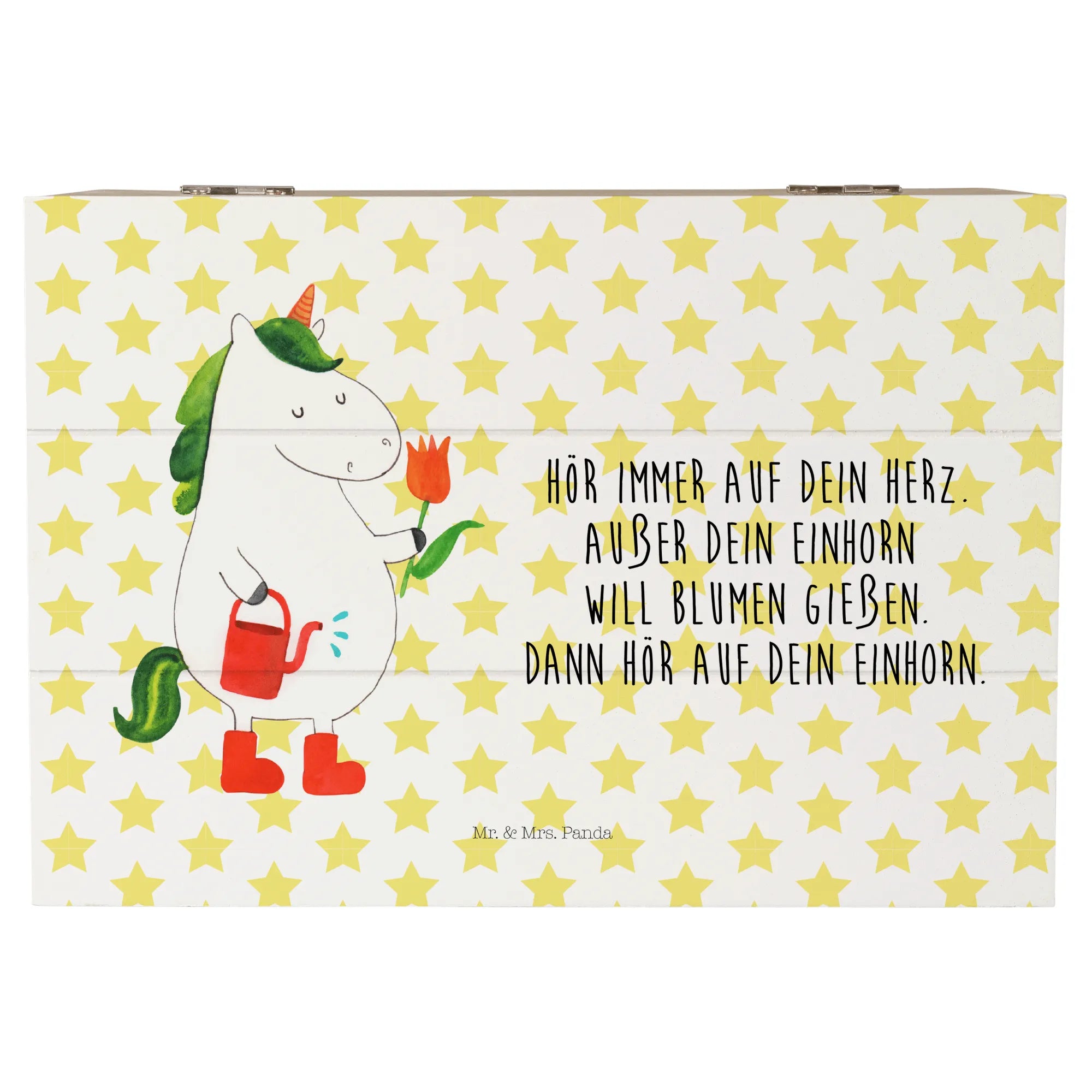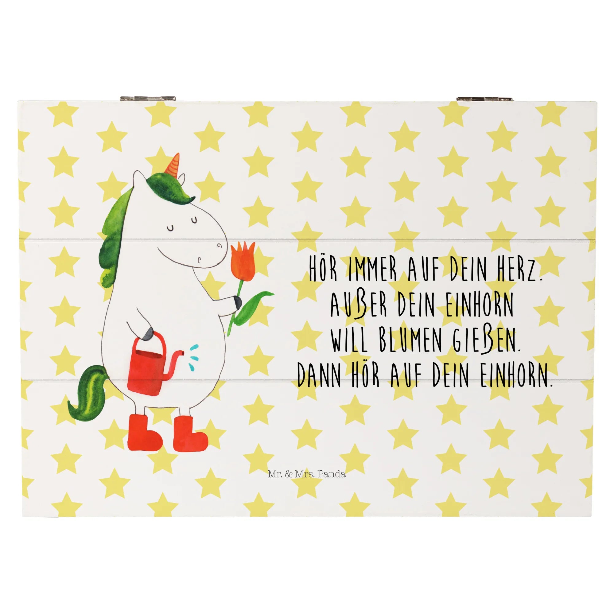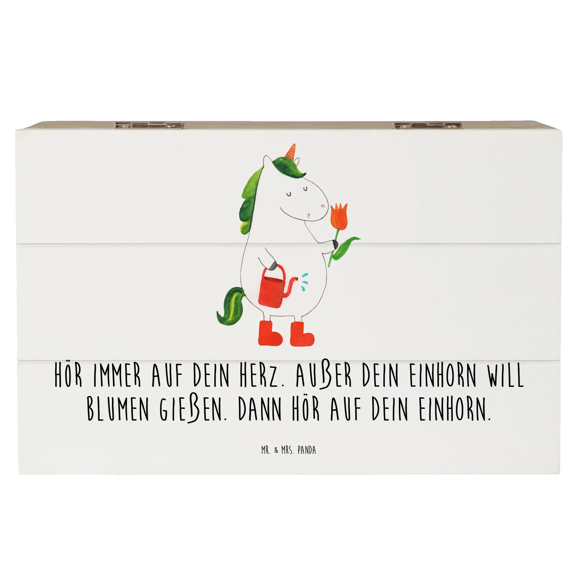 Die zauberhafte Holzkiste "Einhorn Gärtner" aus der Einhorn-Kollektion von Mr. & Mrs. Panda ist das perfekte Geschenk für alle Einhornliebhaber und Gartenfreunde! Diese wunderschöne Kiste, gefertigt aus robuster Premium Hartfaser, bietet dir nicht nur einen stilvollen Aufbewahrungsort für all deine Schätze, sondern begeistert auch mit ihrem charmanten Design. Mit ihrem niedlichen Einhorn, das gerne die Blumen im Garten gießen möchte, und dem inspirierenden Spruch "Hör immer auf dein Herz. Außer dein Einhorn will Blumen gießen. Dann hör auf dein Einhorn" bringt sie Freude und Lebenslust in jedes Zuhause.