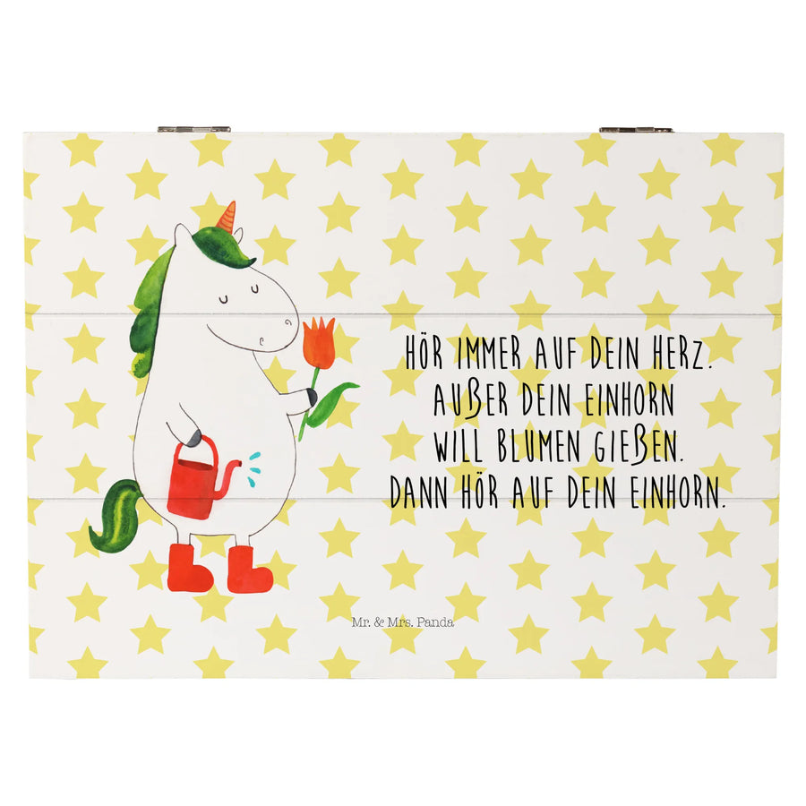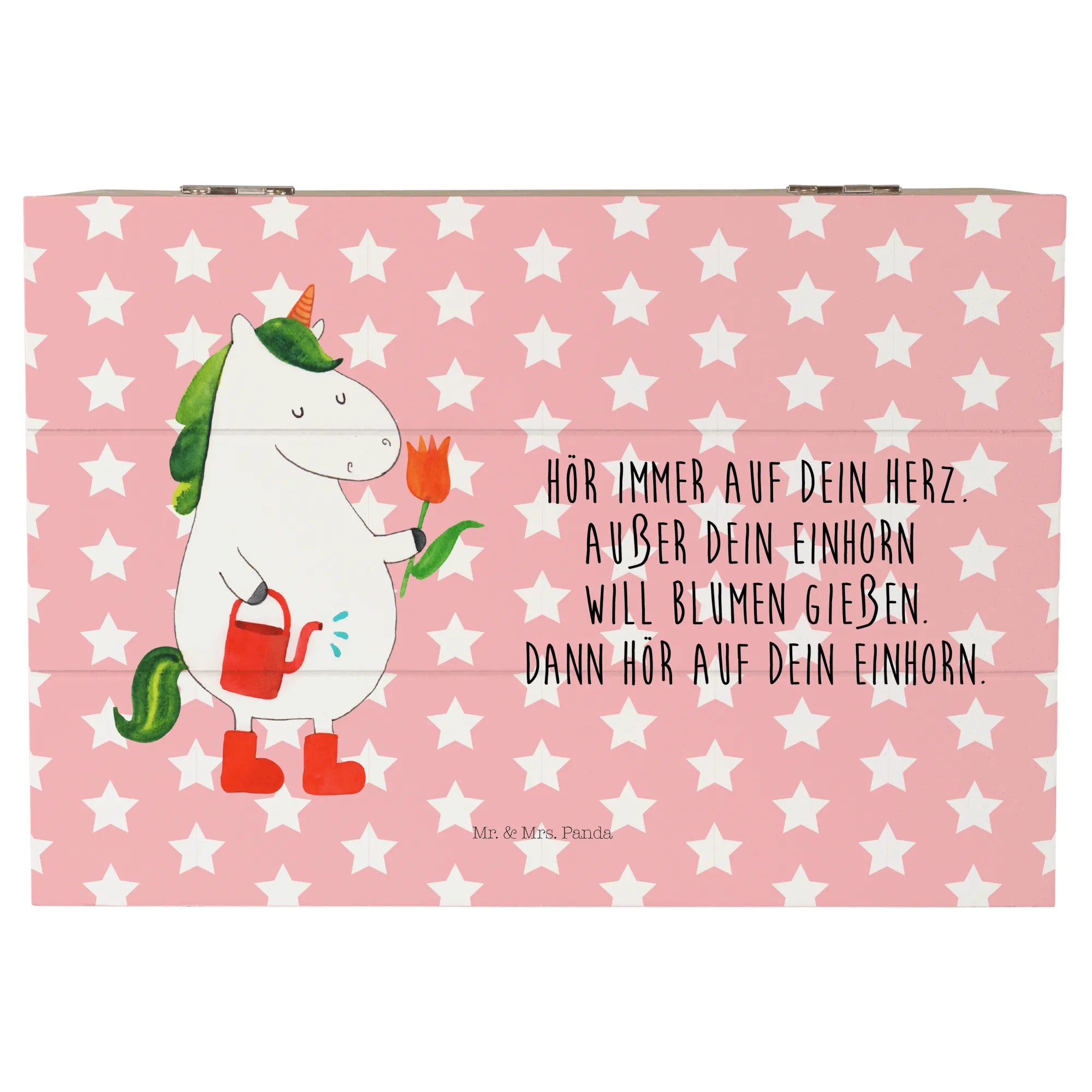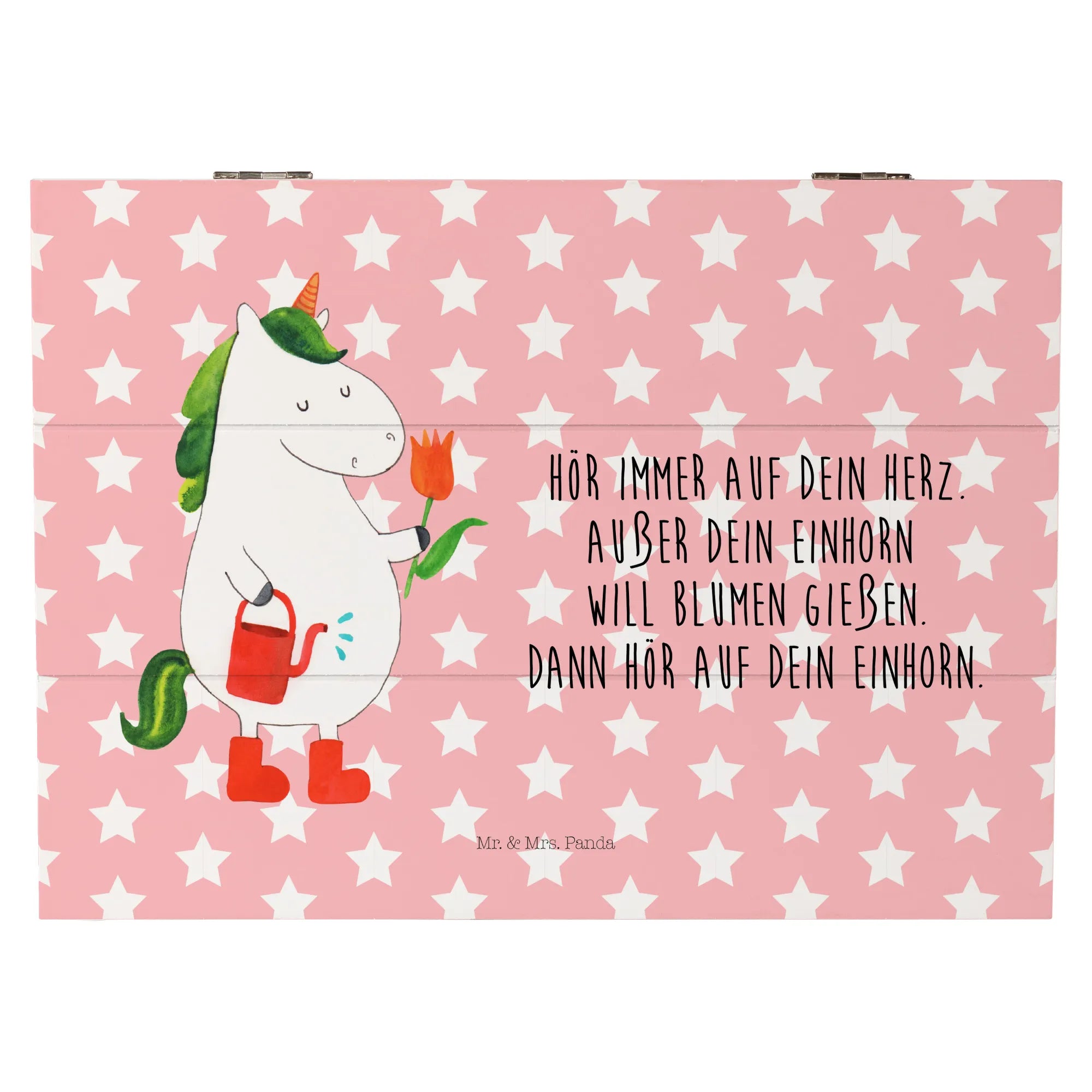 Die zauberhafte Holzkiste "Einhorn Gärtner" aus der Einhorn-Kollektion von Mr. & Mrs. Panda ist das perfekte Geschenk für alle Einhornliebhaber und Gartenfreunde! Diese wunderschöne Kiste, gefertigt aus robuster Premium Hartfaser, bietet dir nicht nur einen stilvollen Aufbewahrungsort für all deine Schätze, sondern begeistert auch mit ihrem charmanten Design. Mit ihrem niedlichen Einhorn, das gerne die Blumen im Garten gießen möchte, und dem inspirierenden Spruch "Hör immer auf dein Herz. Außer dein Einhorn will Blumen gießen. Dann hör auf dein Einhorn" bringt sie Freude und Lebenslust in jedes Zuhause.