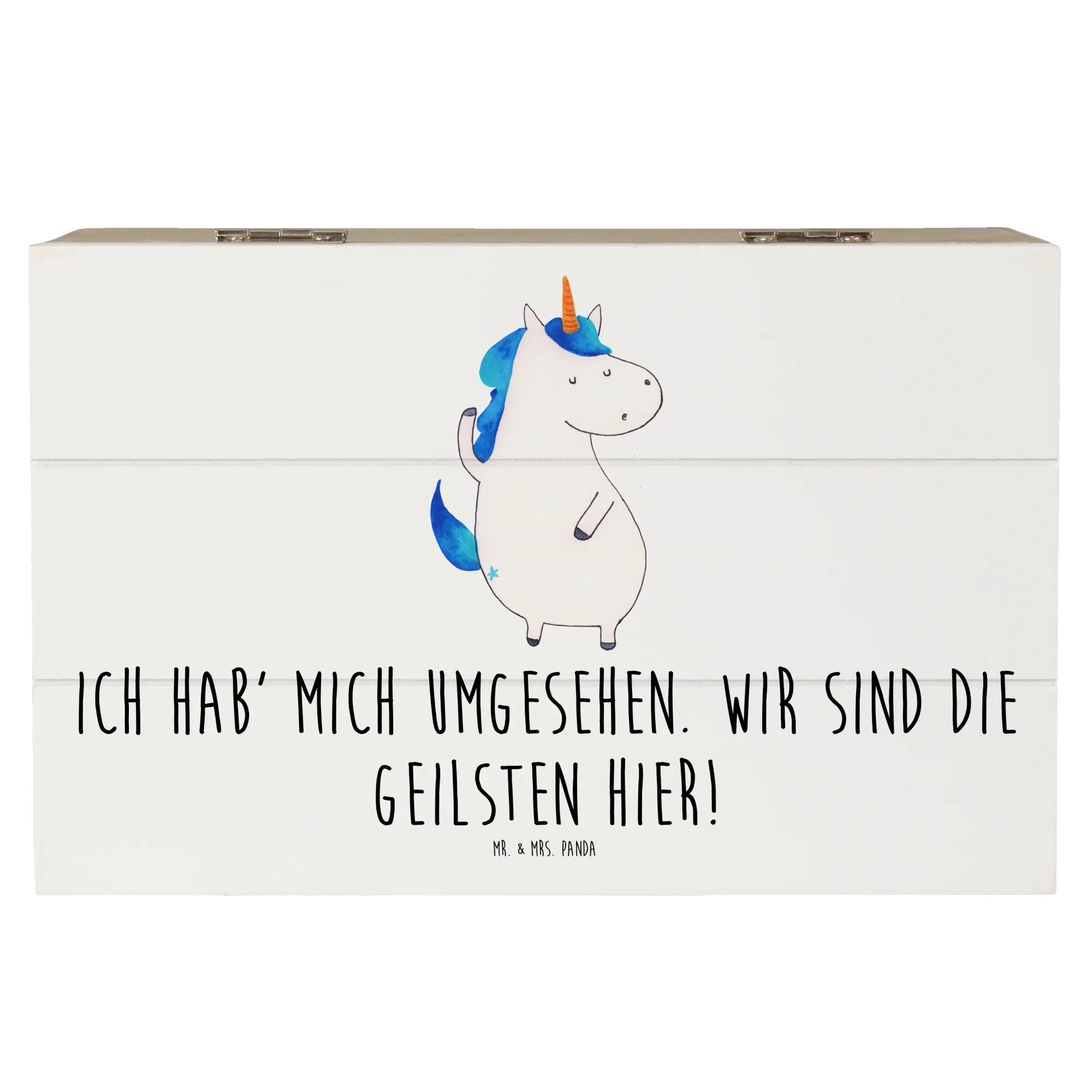 Die wunderschöne Holzkiste mit dem zauberhaften Einhorn-Motiv von Mr. & Mrs. Panda ist das perfekte Geschenk für alle, die das Besondere lieben. Diese Schatzkiste ist nicht nur ein praktischer Aufbewahrungsort für Deine wertvollen Erinnerungen, sondern auch ein wahrer Hingucker. Mit einem liebevoll gestalteten Design und dem lustigen Spruch 'Ich hab' mich umgesehen. Wir sind die Geilsten hier!' zieht sie alle Blicke auf sich.