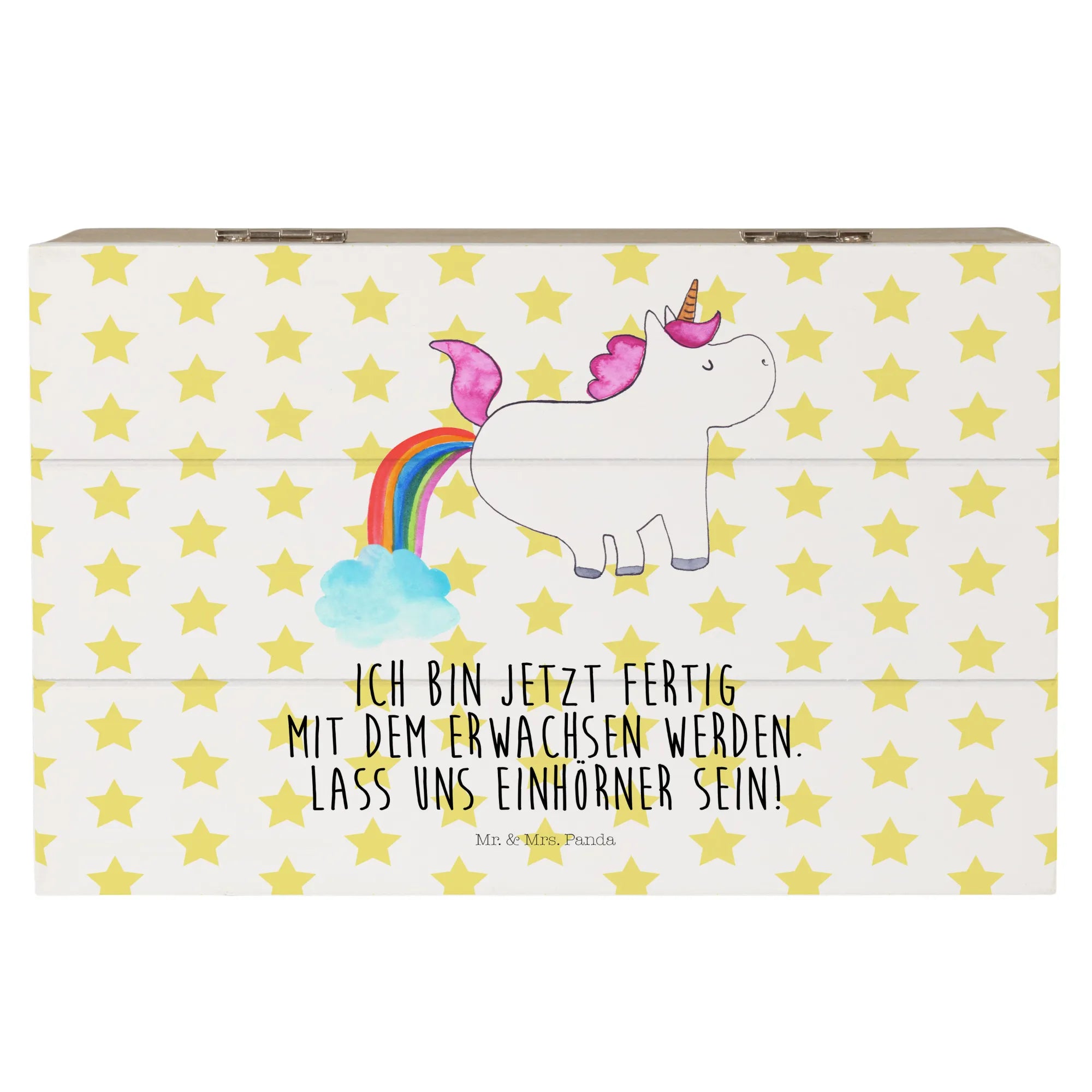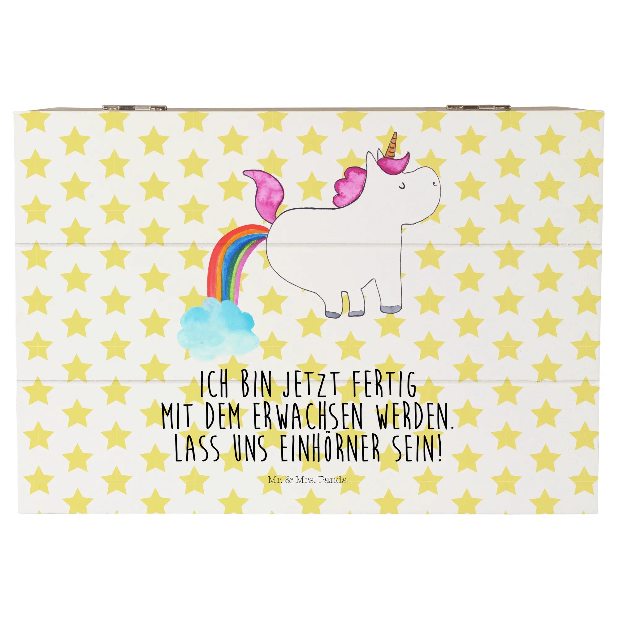 Bist du auf der Suche nach dem perfekten Geschenk für eine Freundin oder einen Freund, der oder die das Erwachsensein manchmal nicht ganz so ernst nimmt? Dann ist die wunderschöne Holzkiste mit dem süßen Einhorn Pupsend-Motiv von Mr. & Mrs. Panda genau das Richtige! Diese tolle Schatzkiste ist nicht nur ein stilvoller Aufbewahrungsort für Erinnerungen, sondern auch ein lustiges Statement, das zum Schmunzeln anregt.