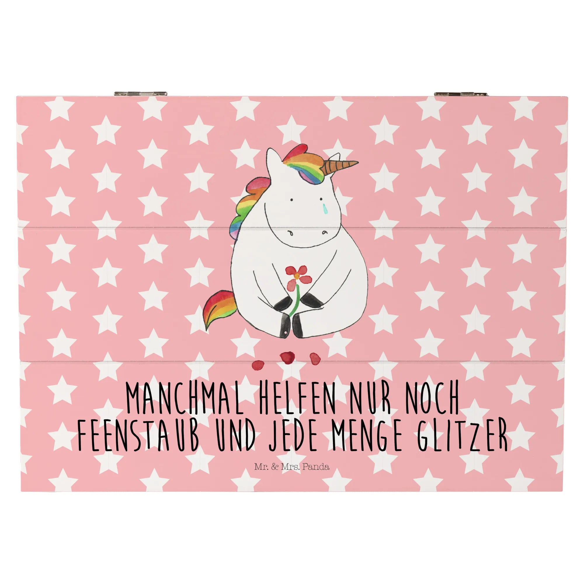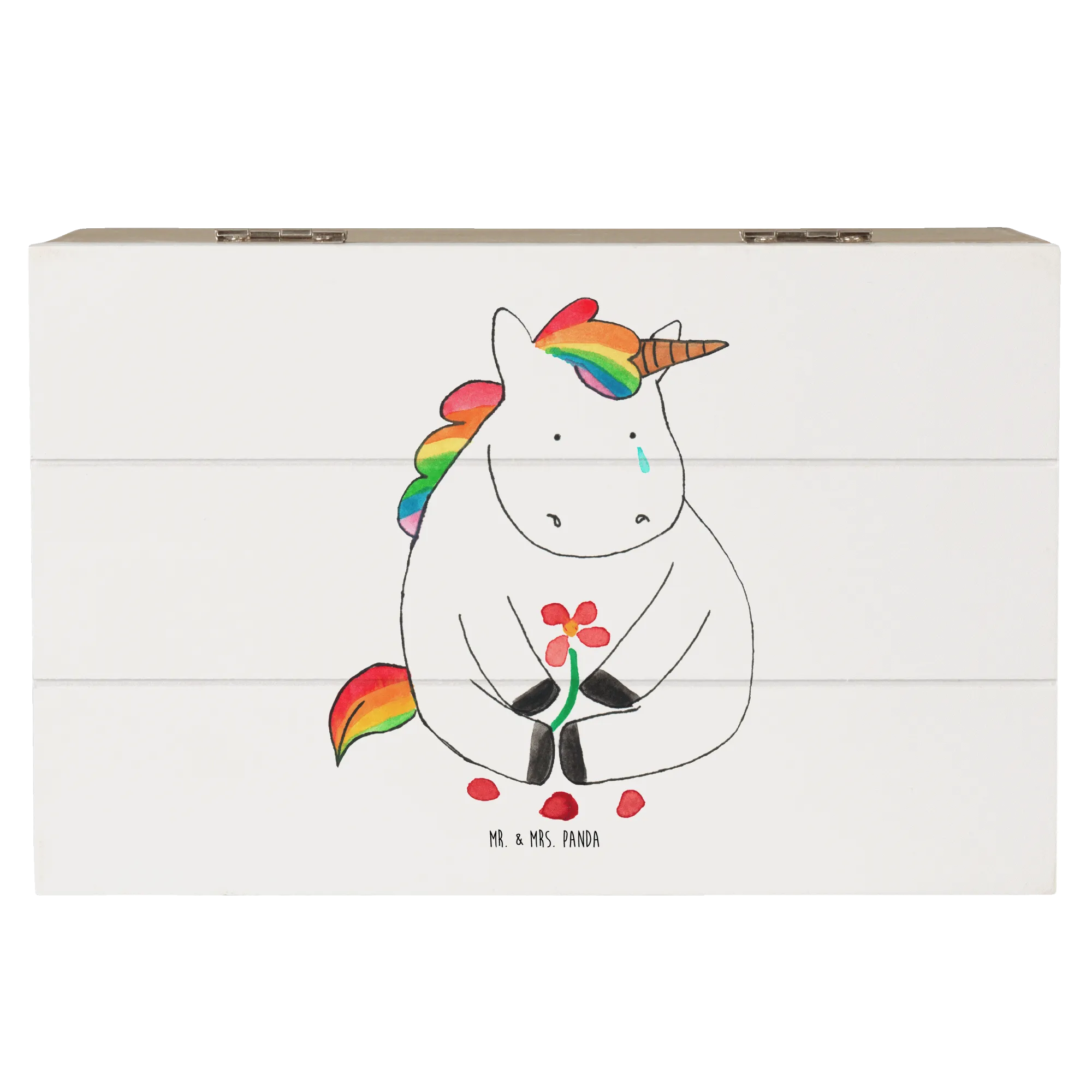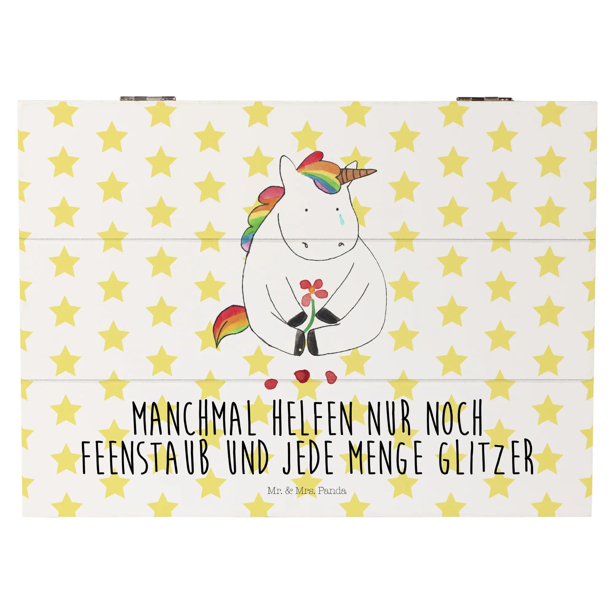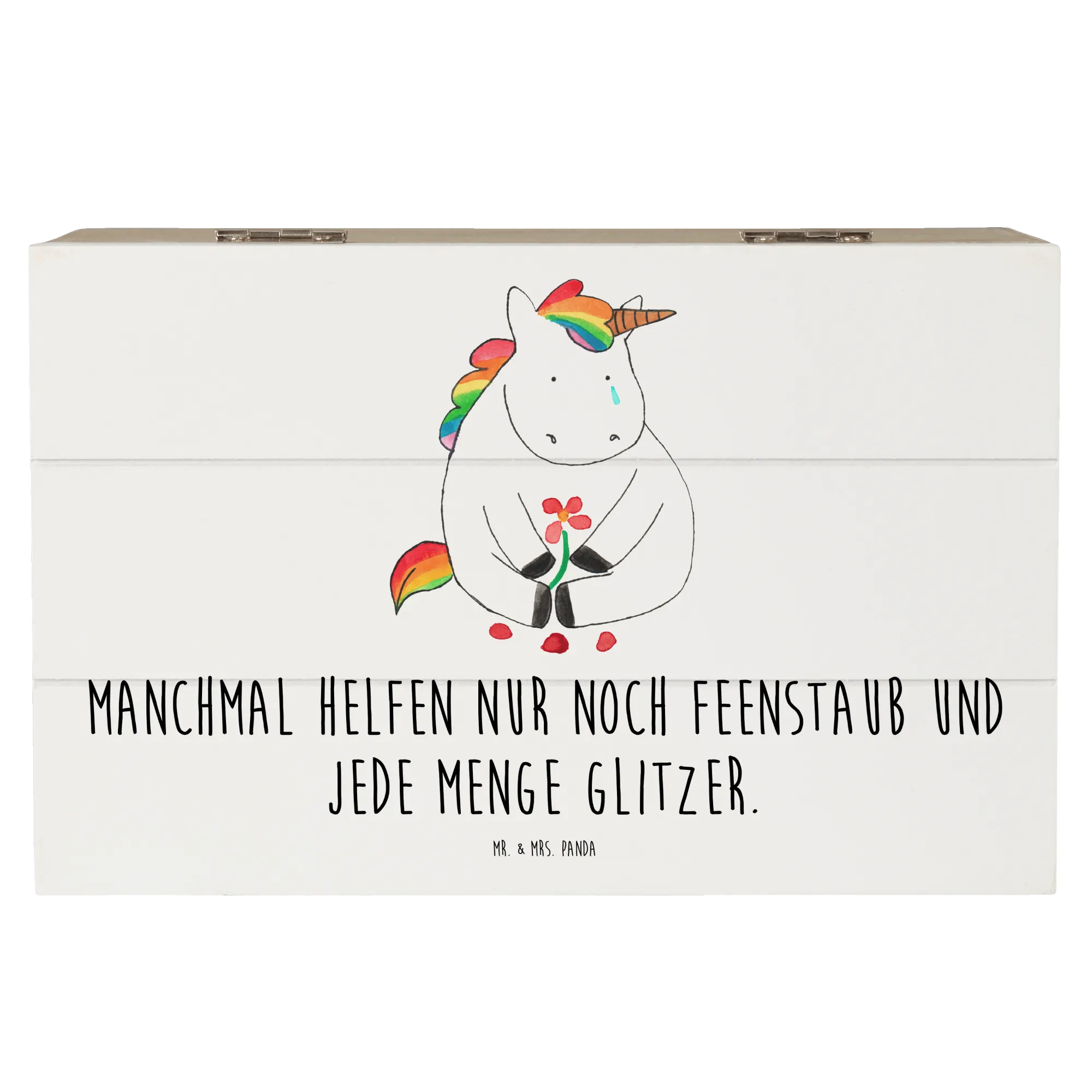 Du bist auf der Suche nach dem perfekten Geschenk für jemanden, der Einhörner liebt? Dann ist die wunderschöne Holzkiste "Einhorn Traurig" aus der Einhorn-Kollektion von Mr. & Mrs. Panda genau das Richtige! Mit ihrer zauberhaften Gestaltung ist sie nicht nur ein praktischer Aufbewahrungsort für deine Schätze, sondern auch ein echter Hingucker.