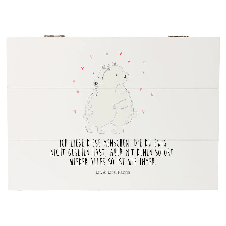 Auch der in vielen Teilen von Mr. & Mrs. Panda oft gebrauchte Spruch „Ich liebe diese Menschen, die du ewig nicht gesehen hast, aber mit denen sofort wieder alles so ist wie immer“ lässt sich perfekt in Verbindung mit dieser tollen Kiste bringen. Verschenke ein Stück Erinnerung und zum Strahlen gebrachten Glück mit der Holzkiste "Eisbär Umarmen" und lass die Menschen um dich herum wissen, wie wichtig sie dir sind!