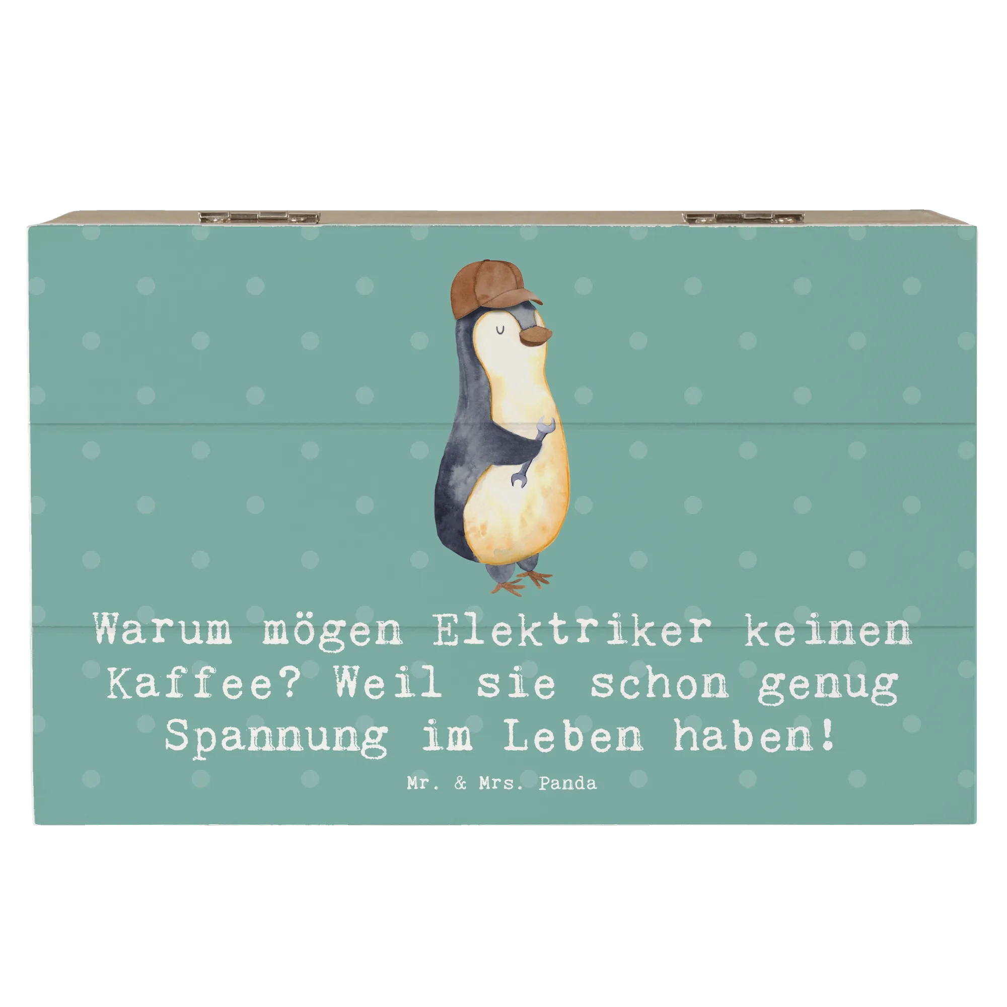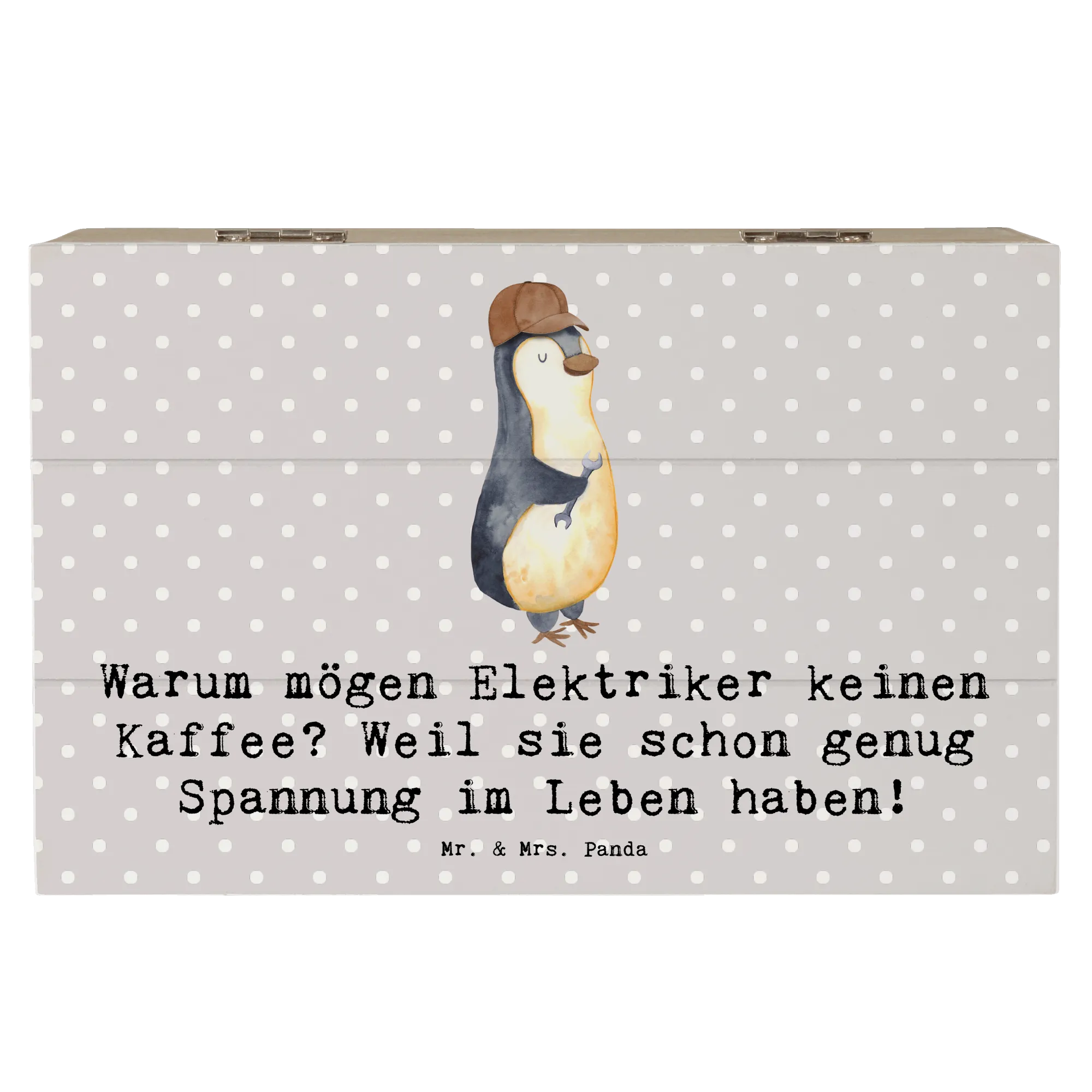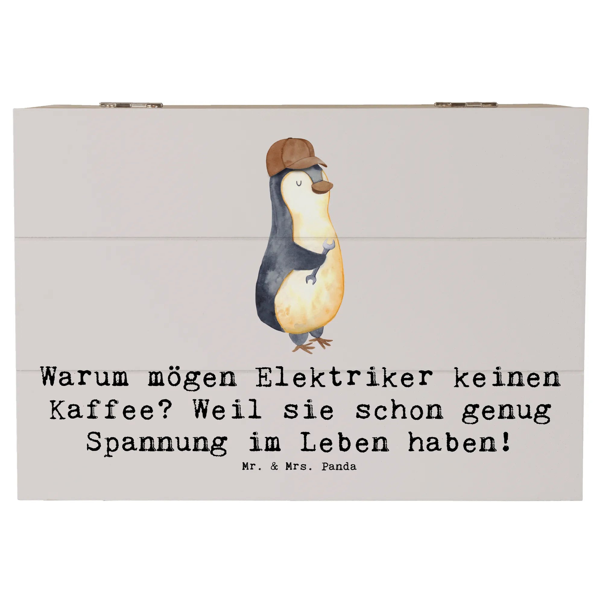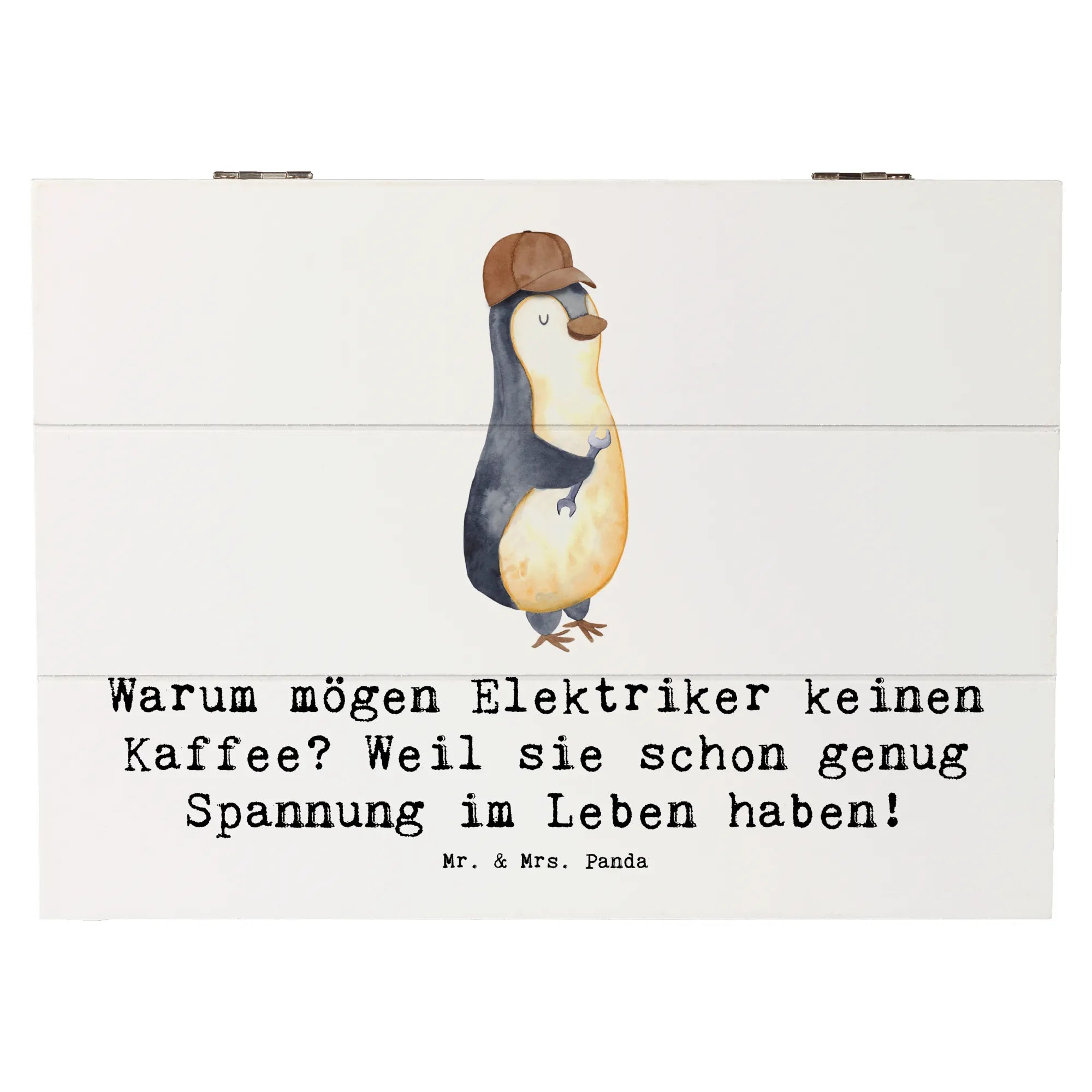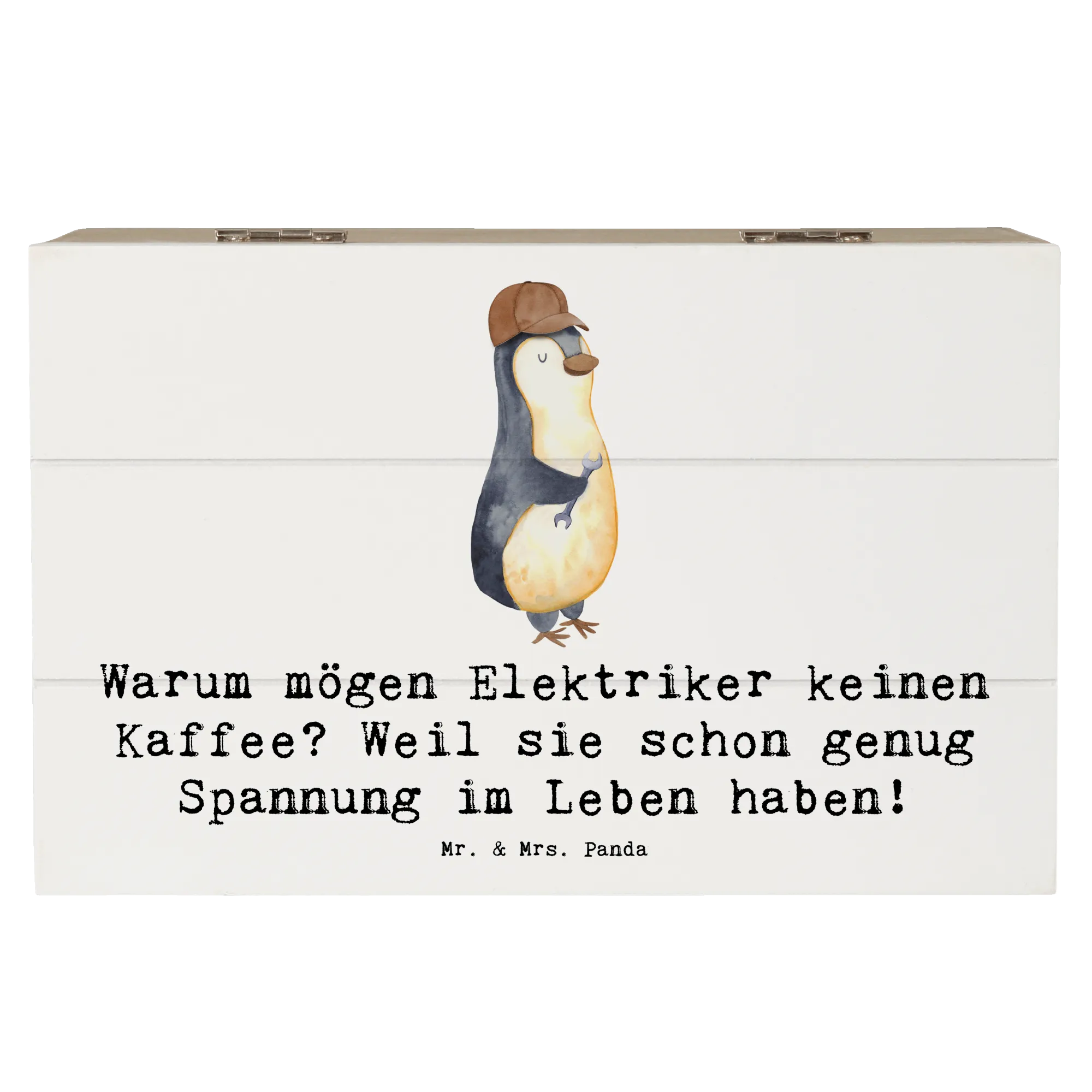Die Holzkiste für Elektriker von Mr. & Mrs. Panda ist der perfekte Begleiter für alle, die das Handwerk lieben! Mit dem witzigen Spruch 'Warum mögen Elektriker keinen Kaffee? Weil sie schon genug Spannung im Leben haben!' bringt diese Kiste nicht nur ein Lächeln auf die Lippen, sondern ist auch äußerst praktisch.