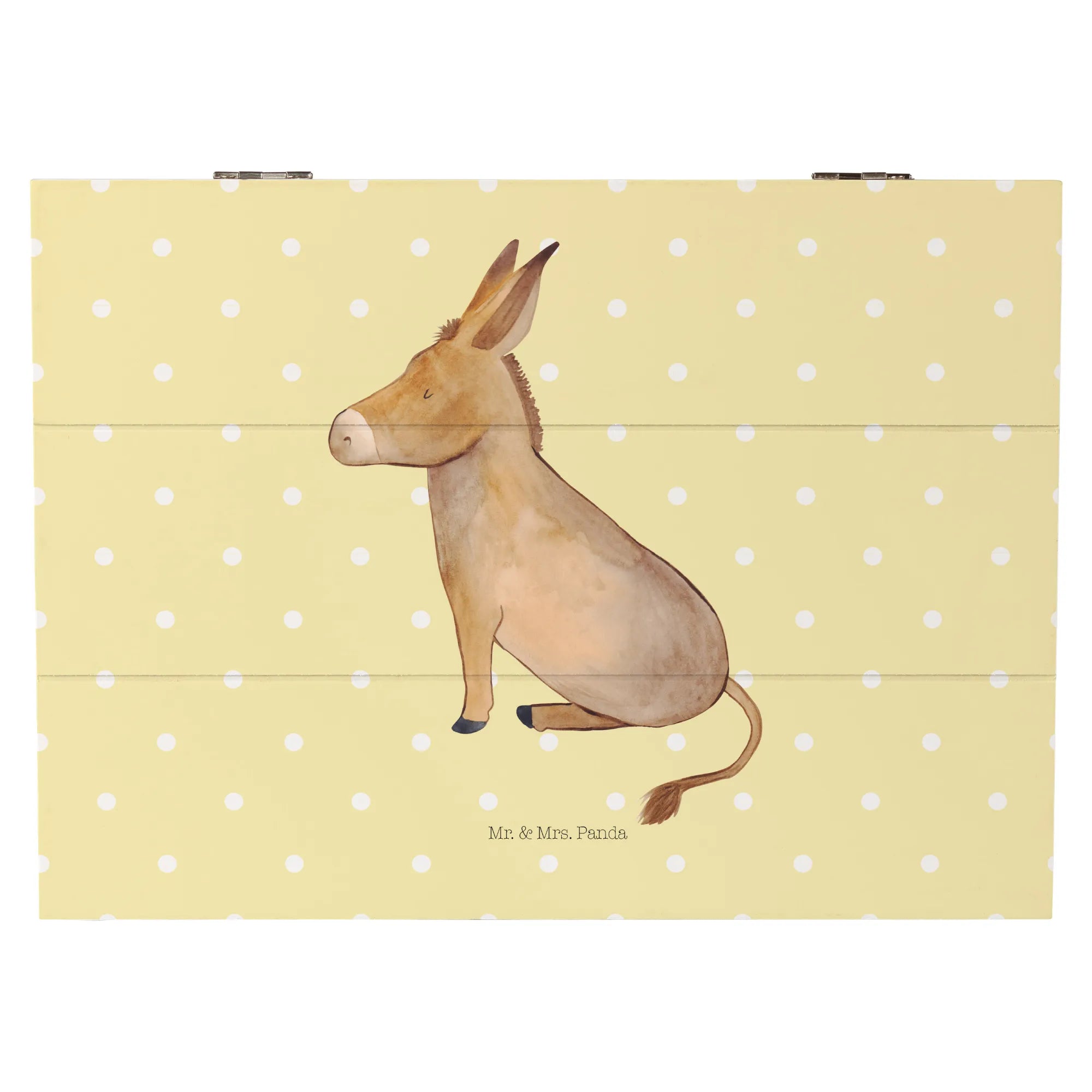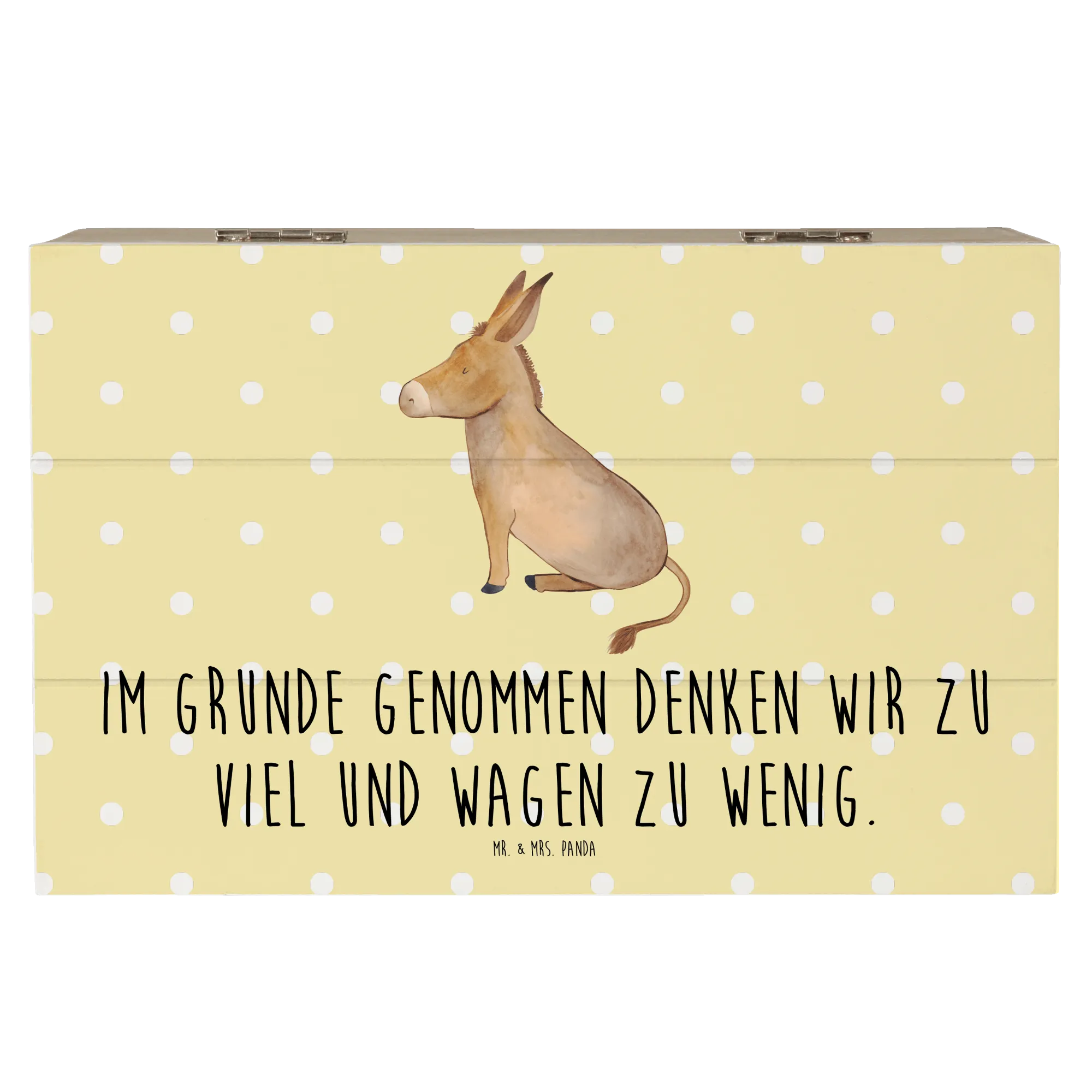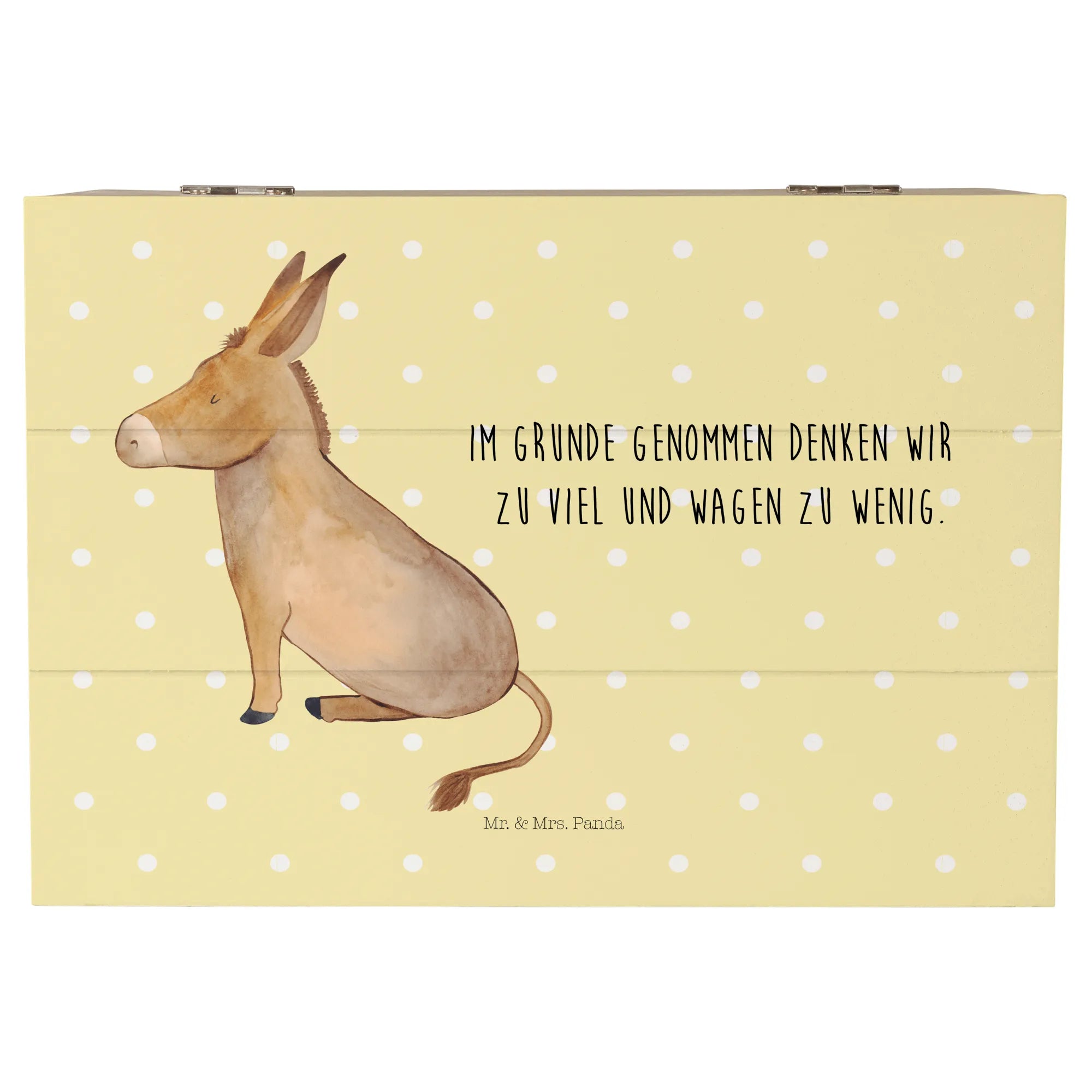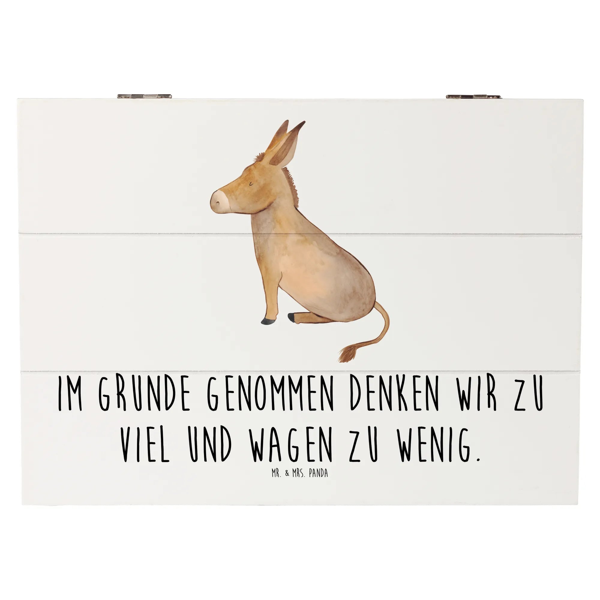 Das bezaubernde Design zeigt einen Esel in sitzender Position mit weichem, braun-beigen Fell und großen, sanften Augen. Die liebevollen Details, die von Mrs. Panda in Aquarell umgesetzt wurden, verleihen der Kiste einen besonderen Charme. Der Esel steht symbolisch für Lebensmut und positive Gedanken, weshalb diese Kiste auch eine tolle Geschenkbox für Freunde und Familie ist, die gerade einen neuen Lebensabschnitt beginnen oder einfach etwas Aufmunterung gebrauchen können.