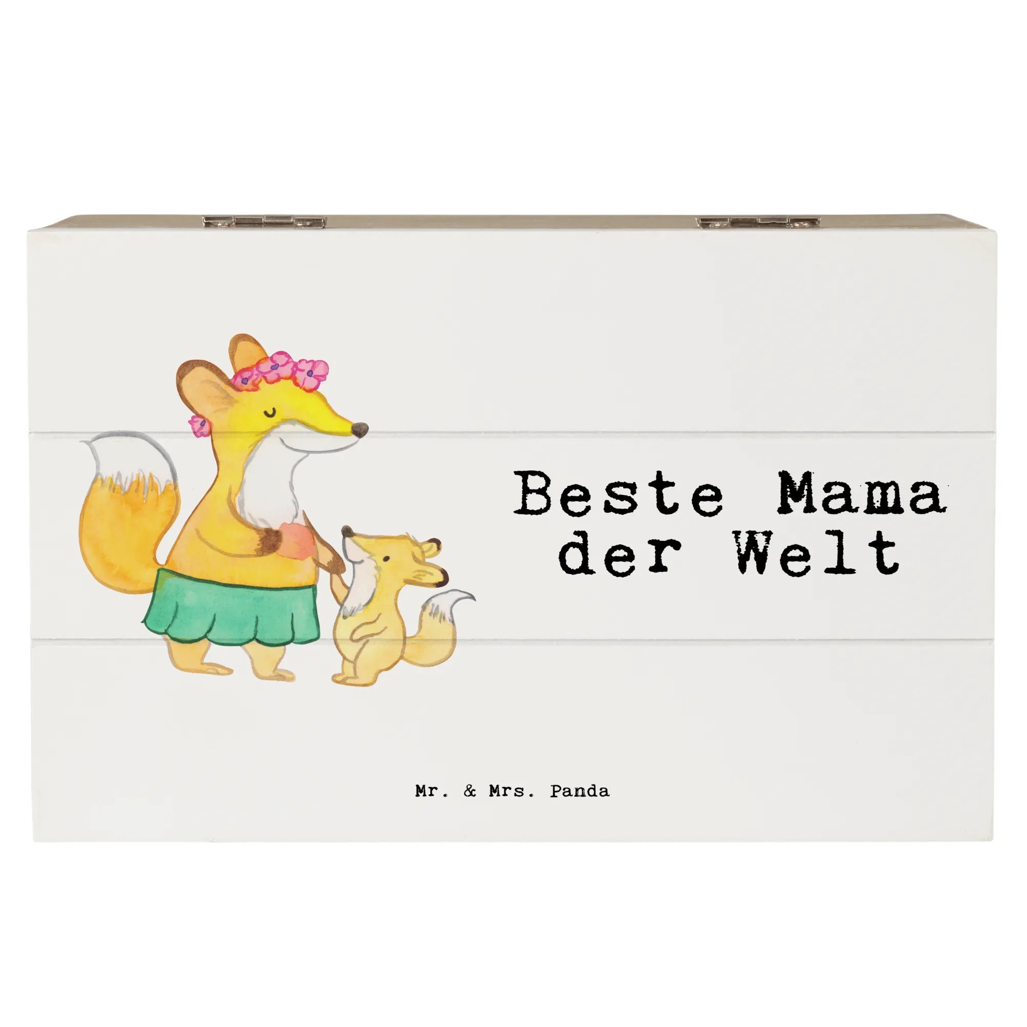 Das liebevoll gezeichnete Motiv, eine Fuchs-Mama mit einem Blumenkranz, die ihr Fuchs-Kind an der Hand haltend, vermittelt Liebe und Fürsorge. Egal ob Du Deiner Mama eine Freude machen oder Dich bei ihr bedanken möchtest, diese Kiste ist der perfekte Begleiter und sorgt für ein strahlendes Lächeln.