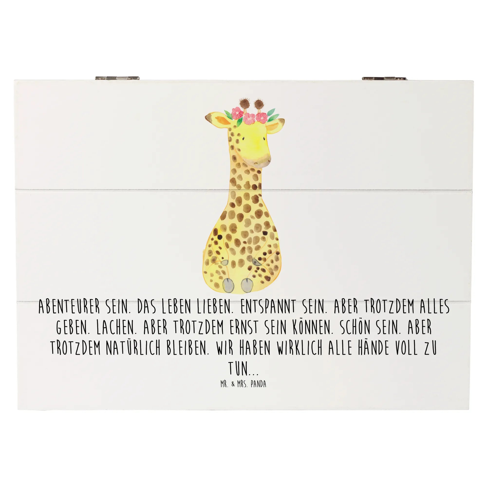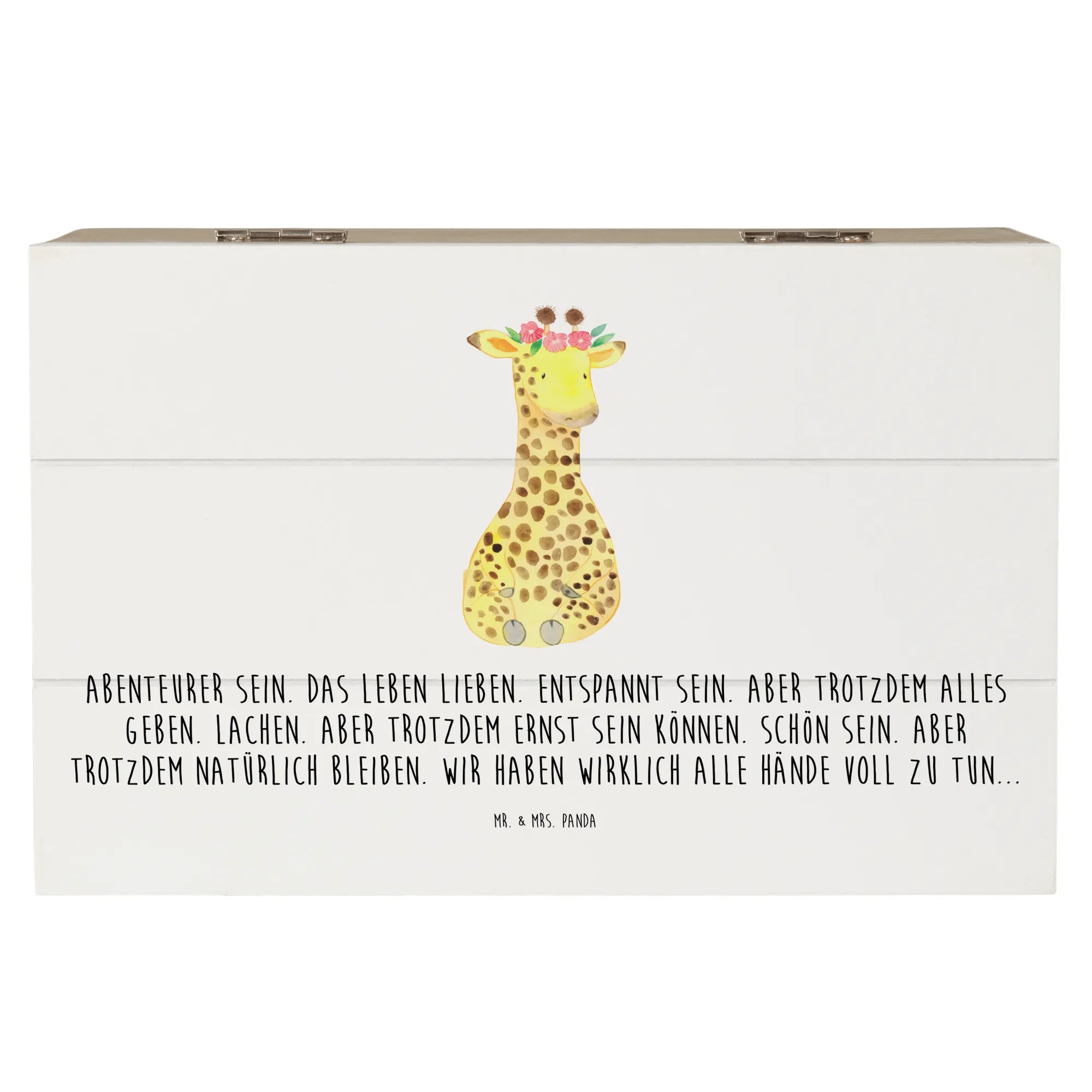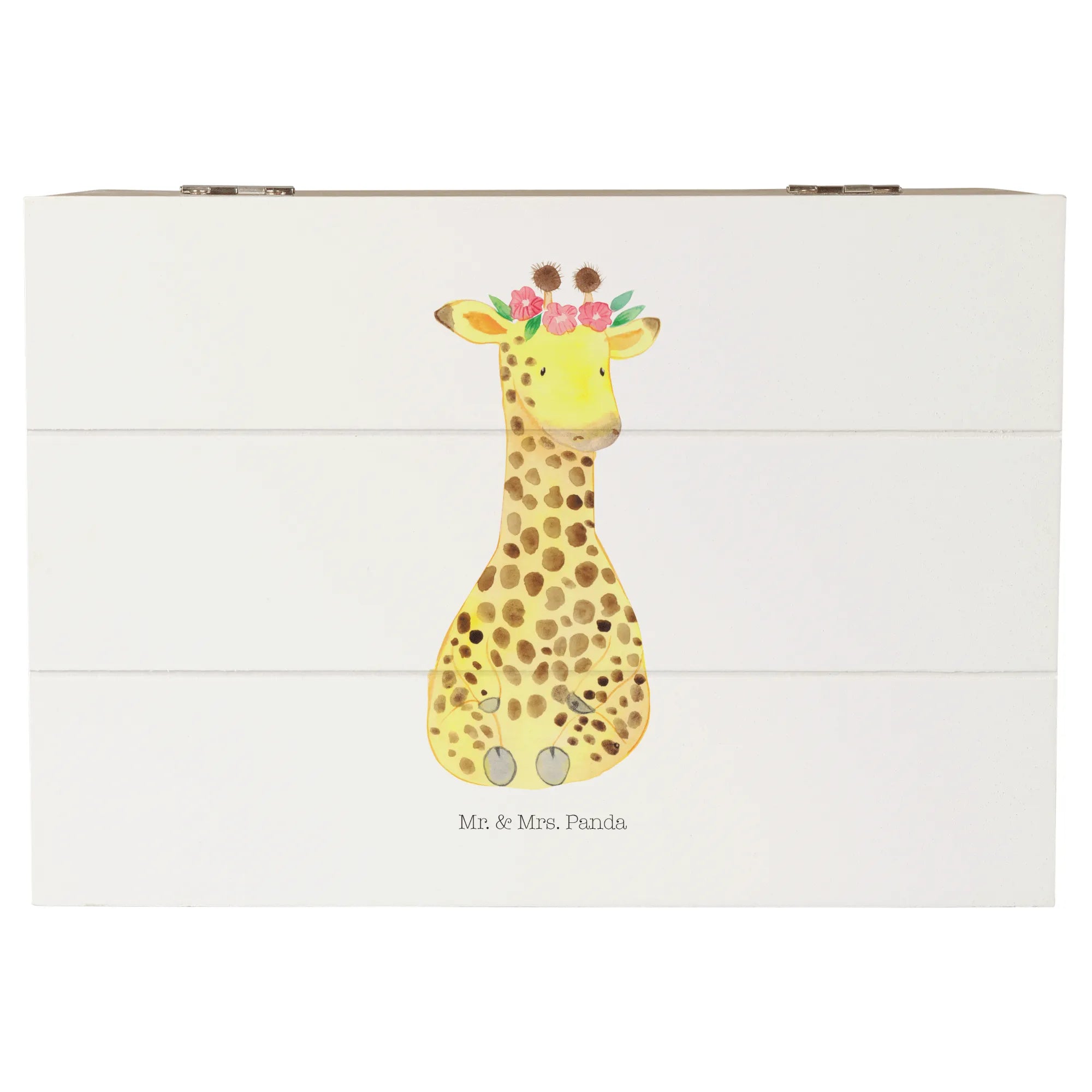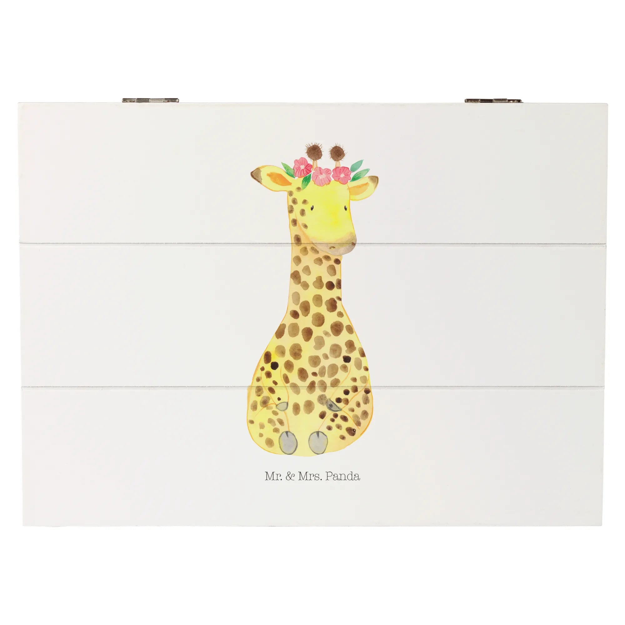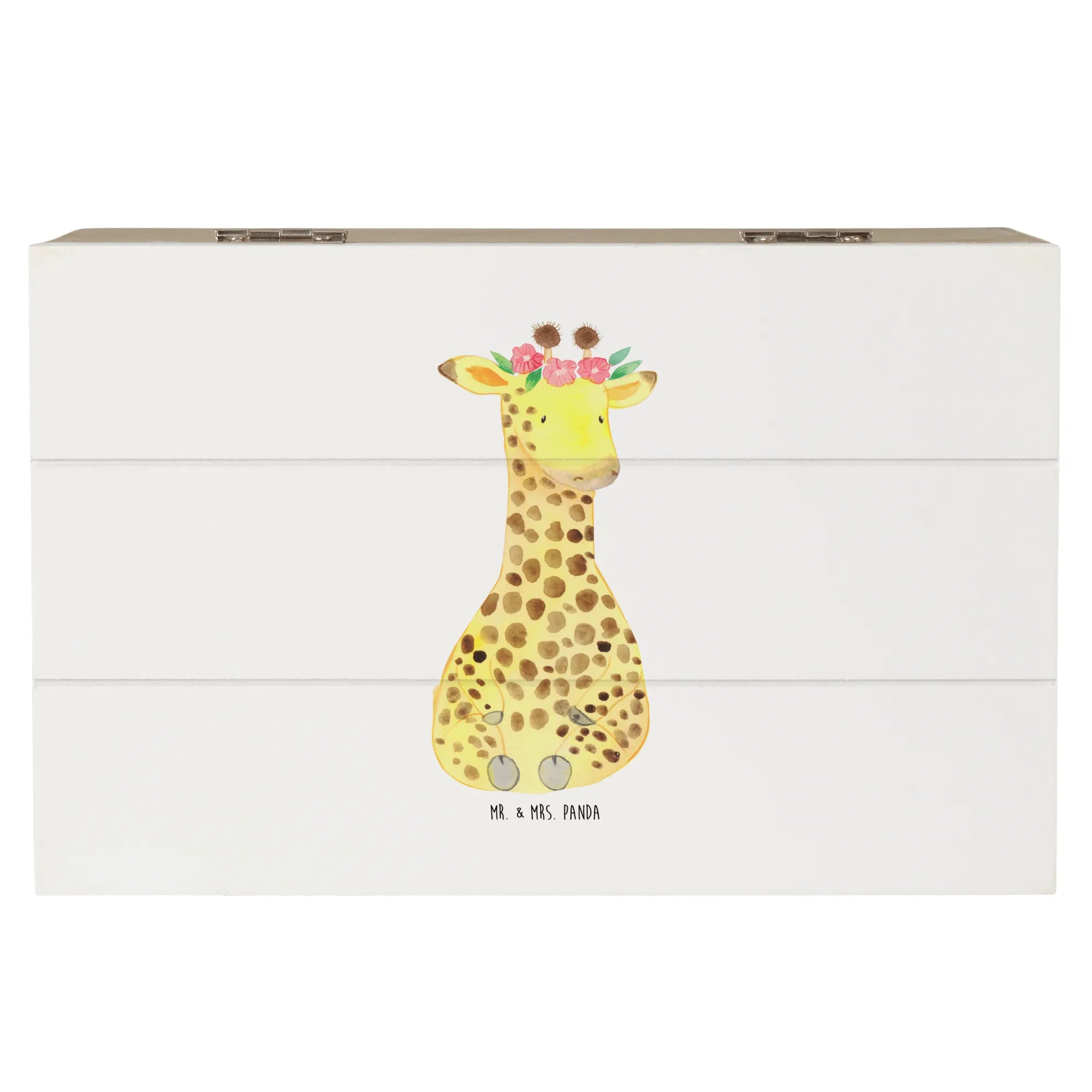 Die zauberhafte Holzkiste von Mr. & Mrs. Panda mit dem süßen Motiv einer Giraffe im Blumenkranz ist das perfekte Geschenk für jeden Anlass!