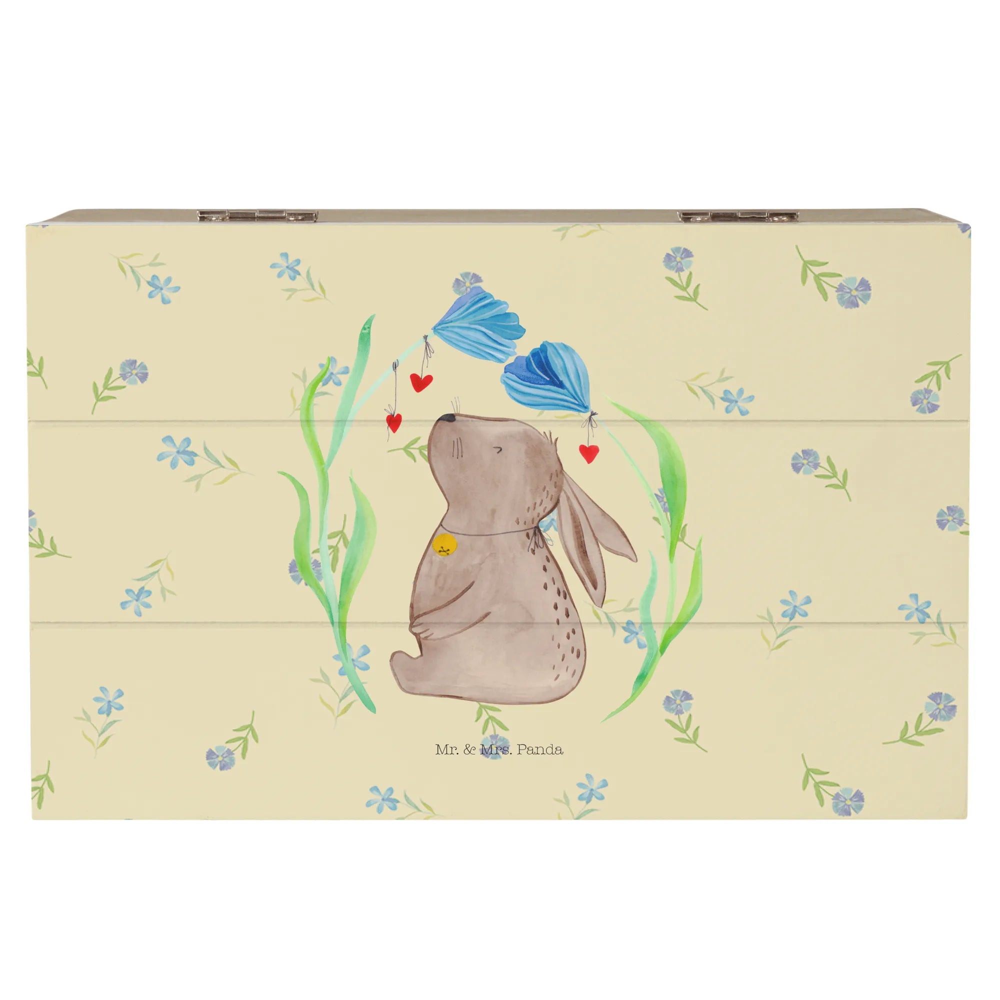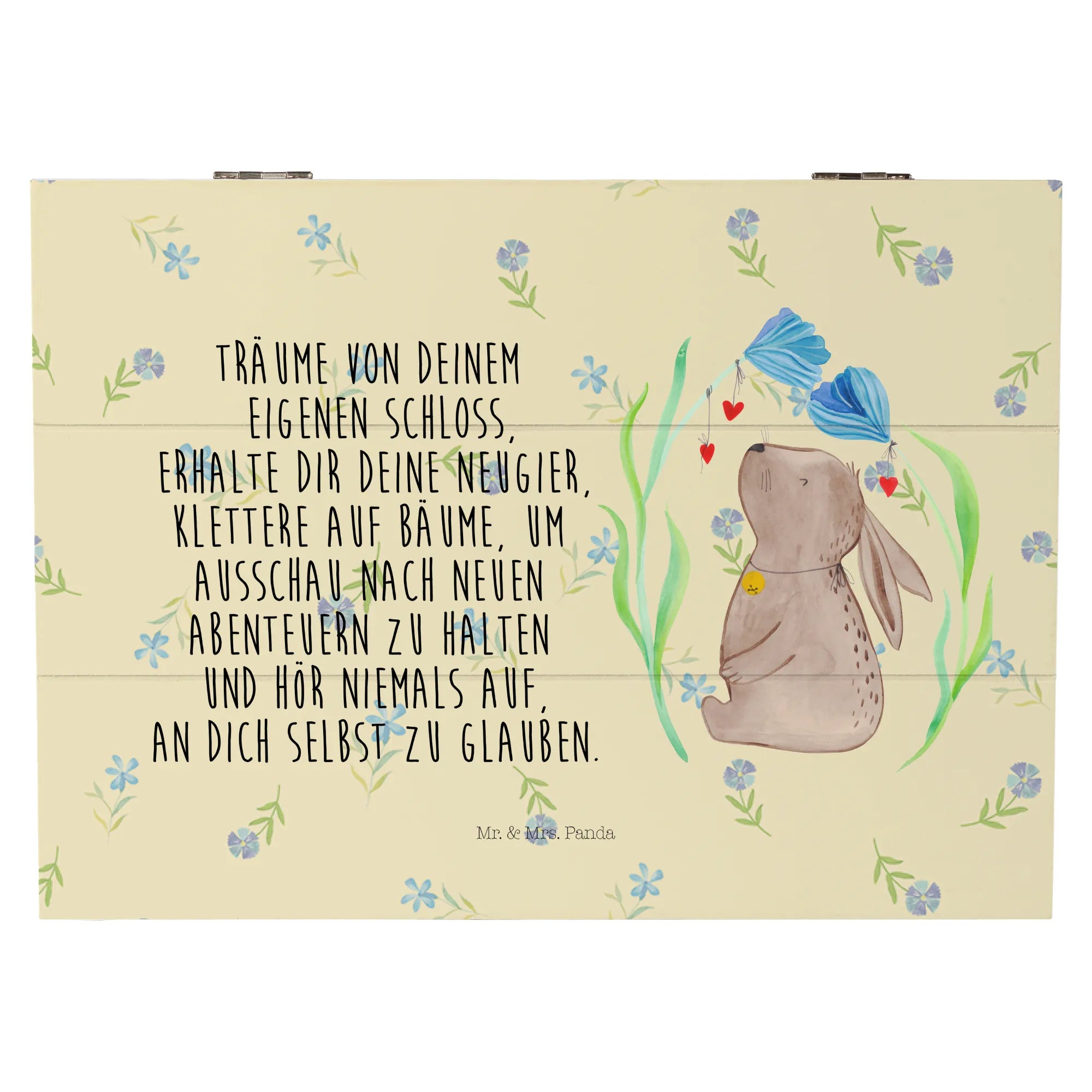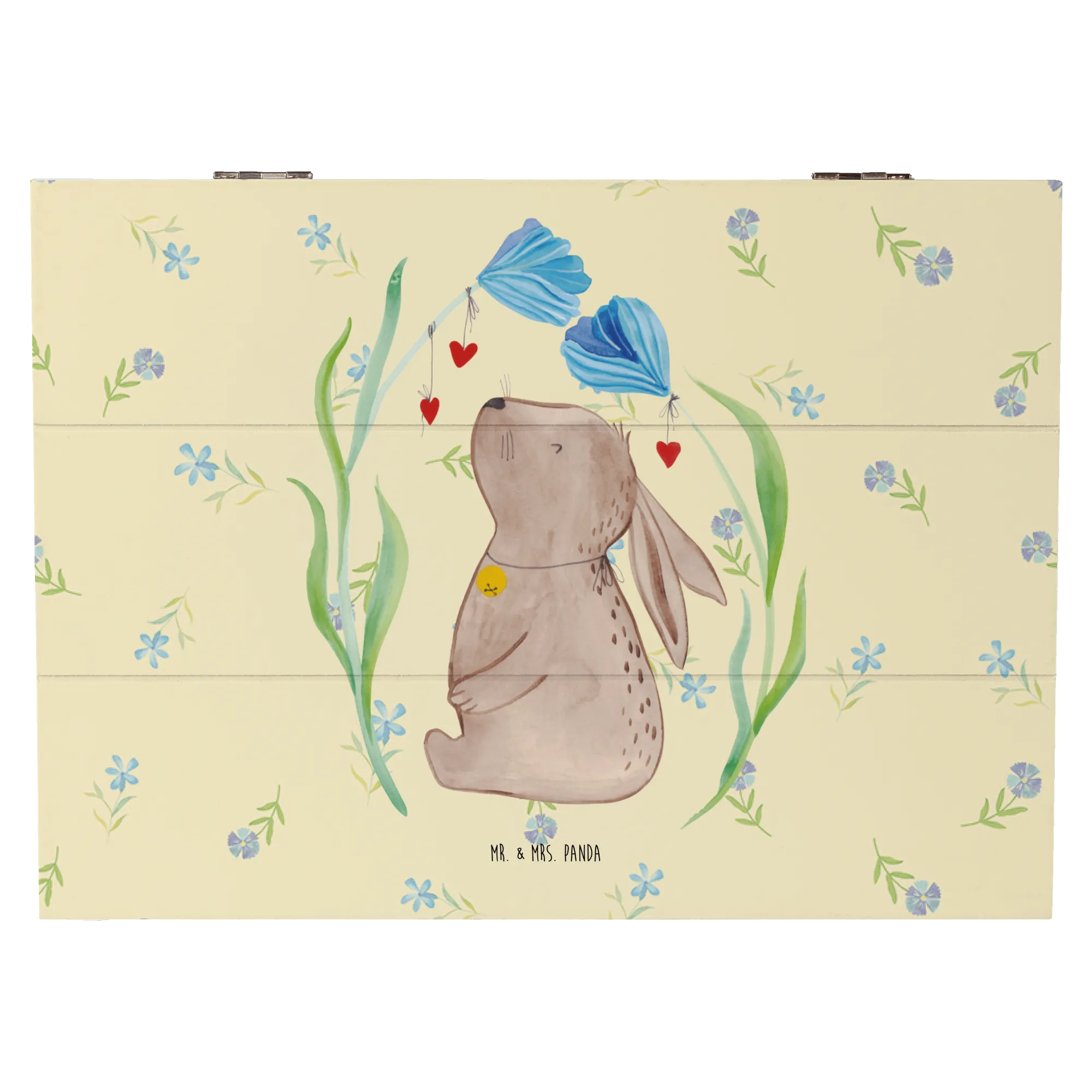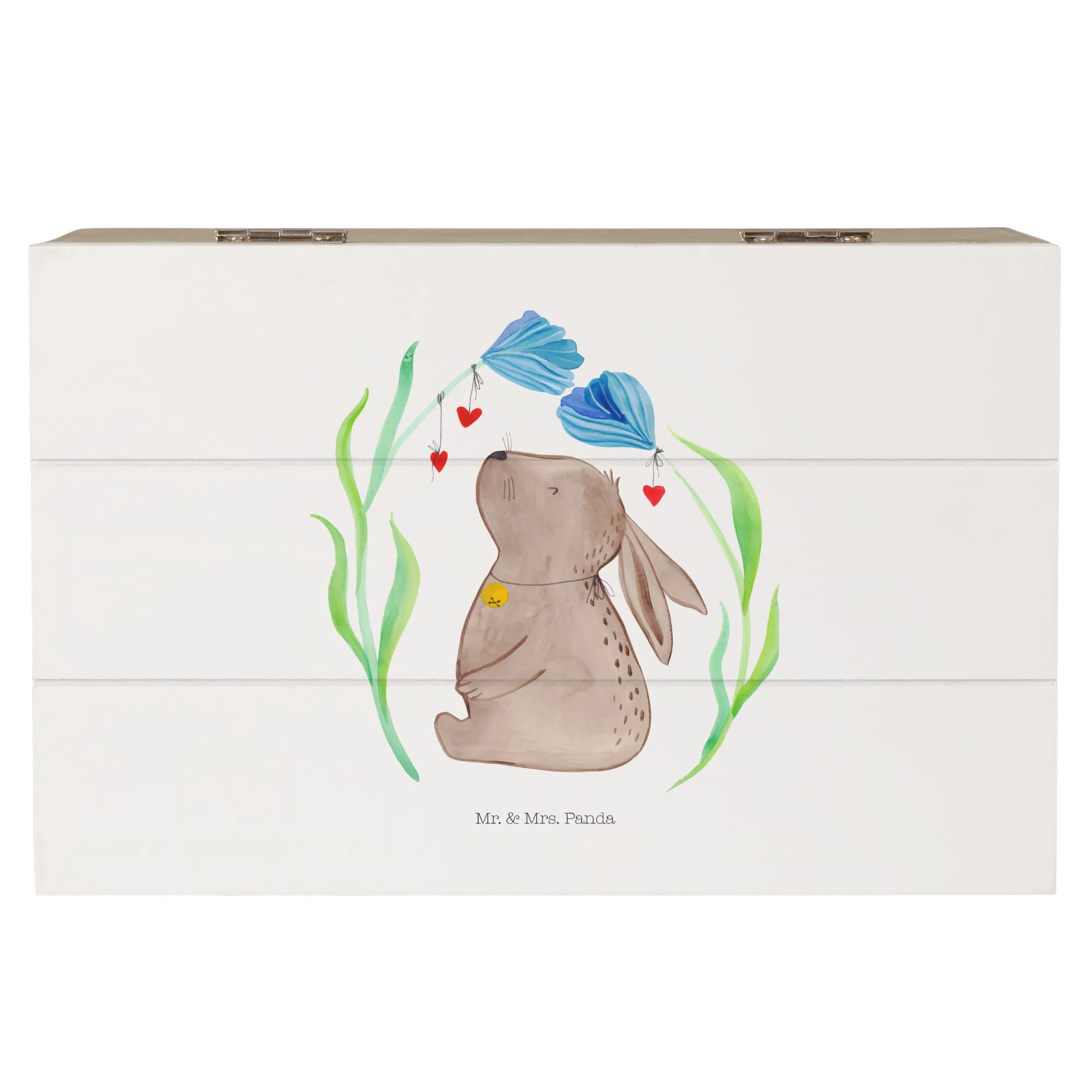 Die wunderschöne Holzkiste von Mr. & Mrs. Panda mit dem bezaubernden Motiv Hase Blume ist das perfekte Geschenk für jede Gelegenheit, insbesondere zur Osterzeit.