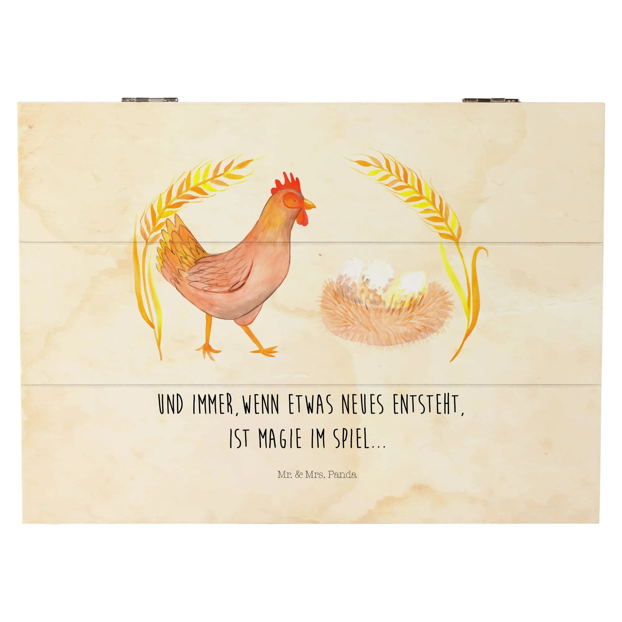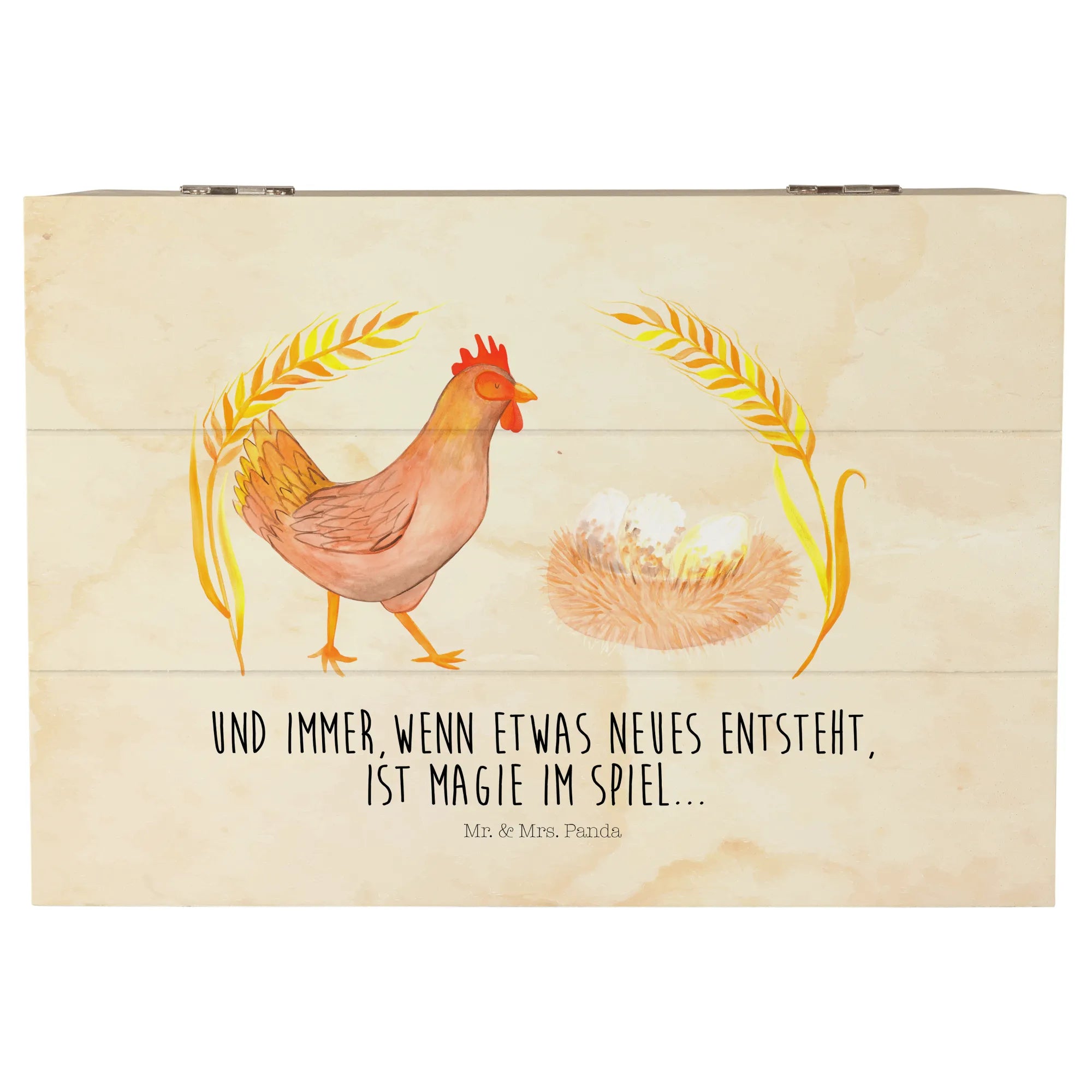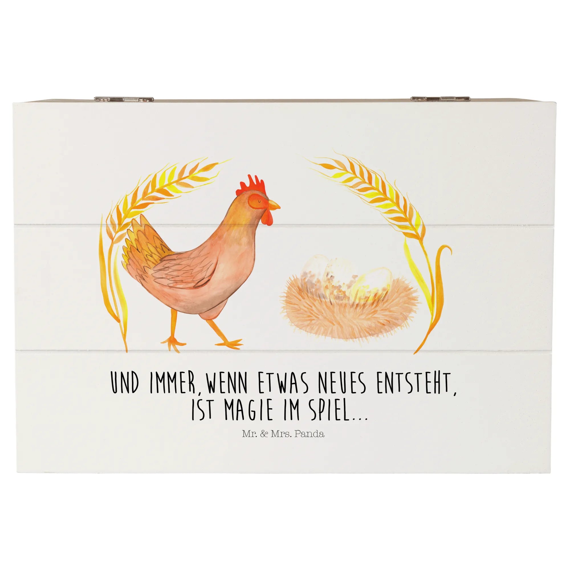 Das Design dieser Kiste zeigt ein zauberhaftes Huhn, das stolz durch die Gegend stolzieren darf. Es vermittelt das wunderbare Gefühl, das entsteht, wenn Neues im Leben geschieht. Unten dem Motto "Und immer, wenn etwas neues entsteht, ist Magie im Spiel", wird das Leben durch diese Holzkiste von Mr. & Mrs. Panda noch lebendiger! Das süße Huhn wird garantiert das Herz eines jeden Beschenkten erobern. Die Einschlagscharniere ermöglichen ein einfaches Öffnen und Schließen, sodass Du die Kiste schnell und unkompliziert nutzen kannst.