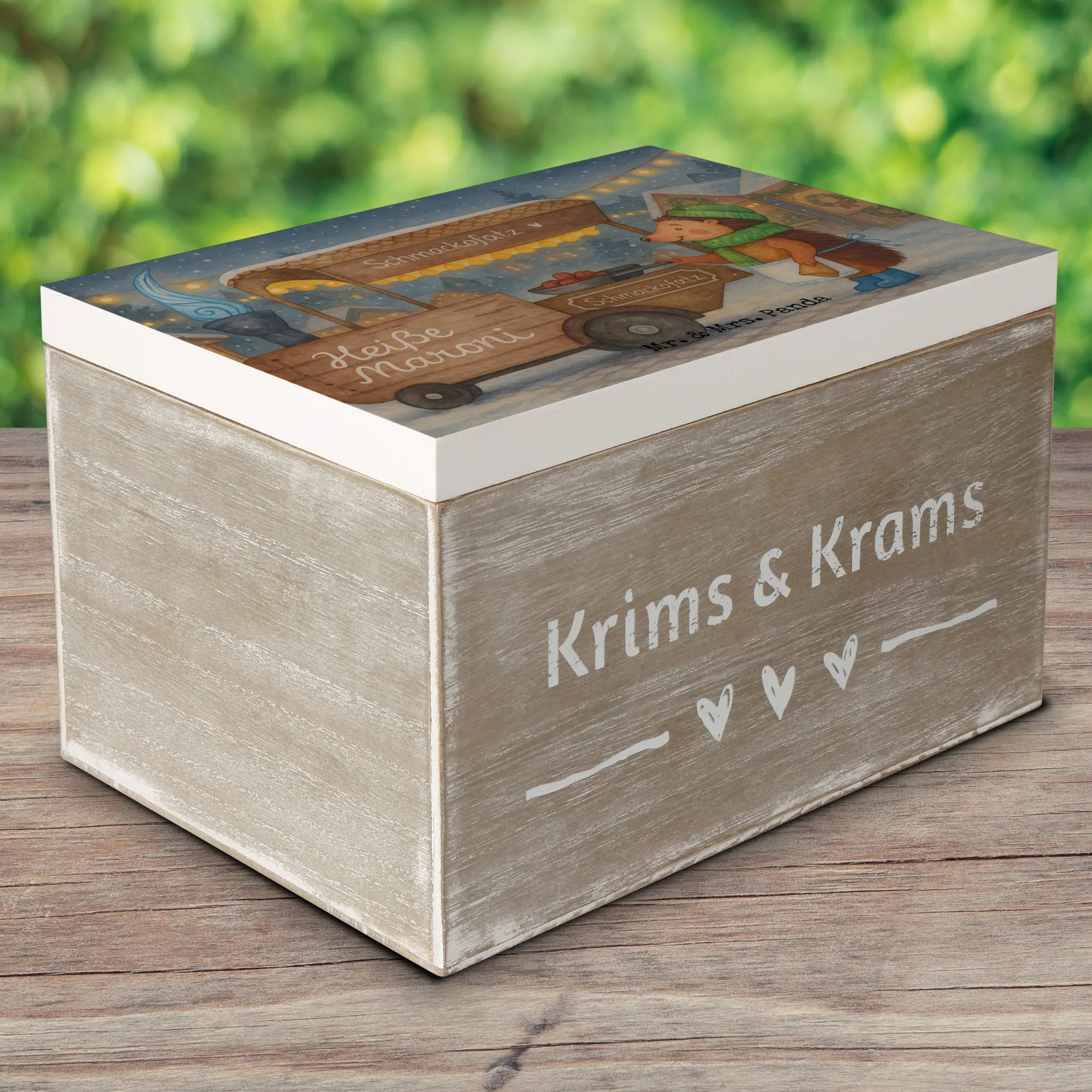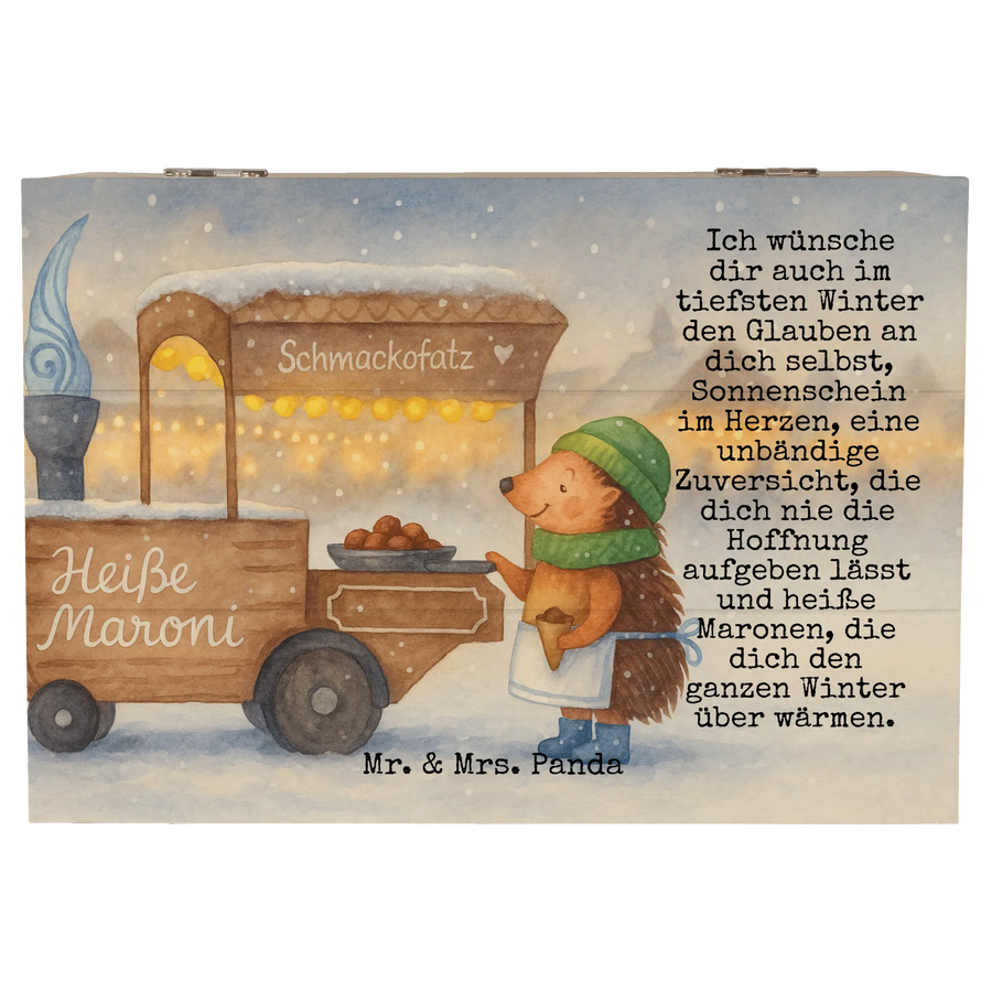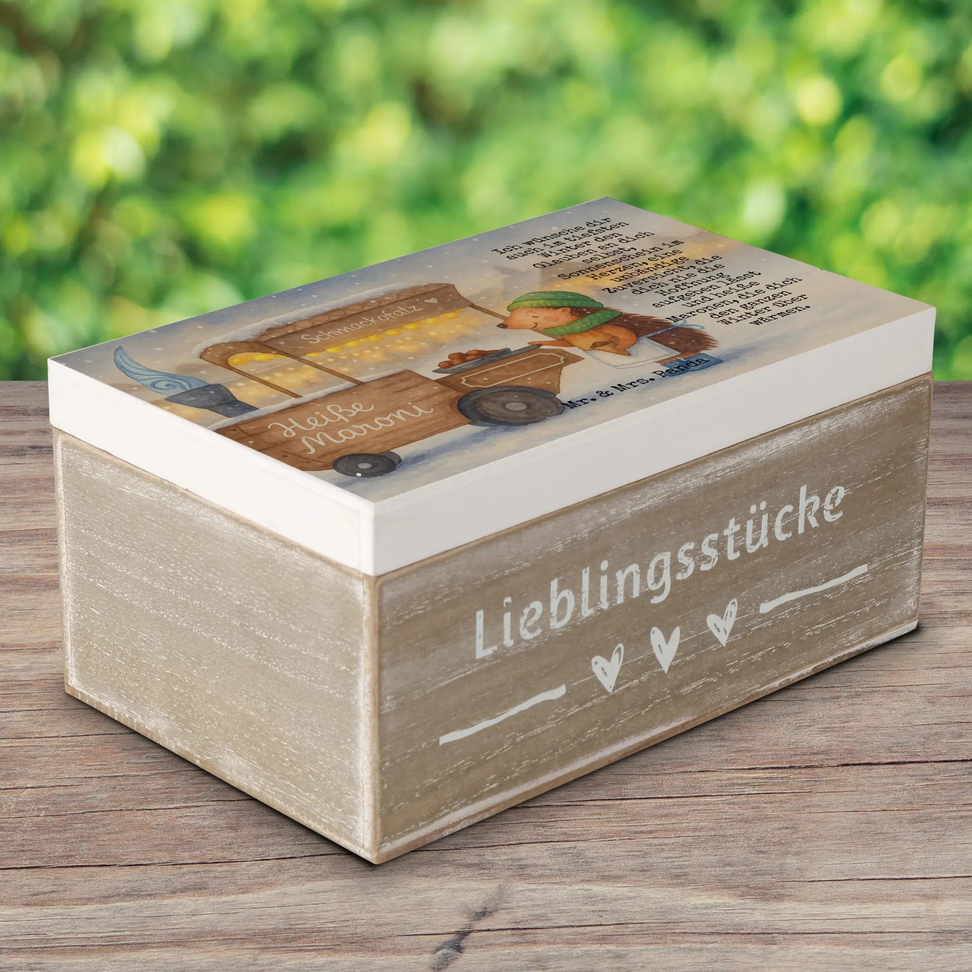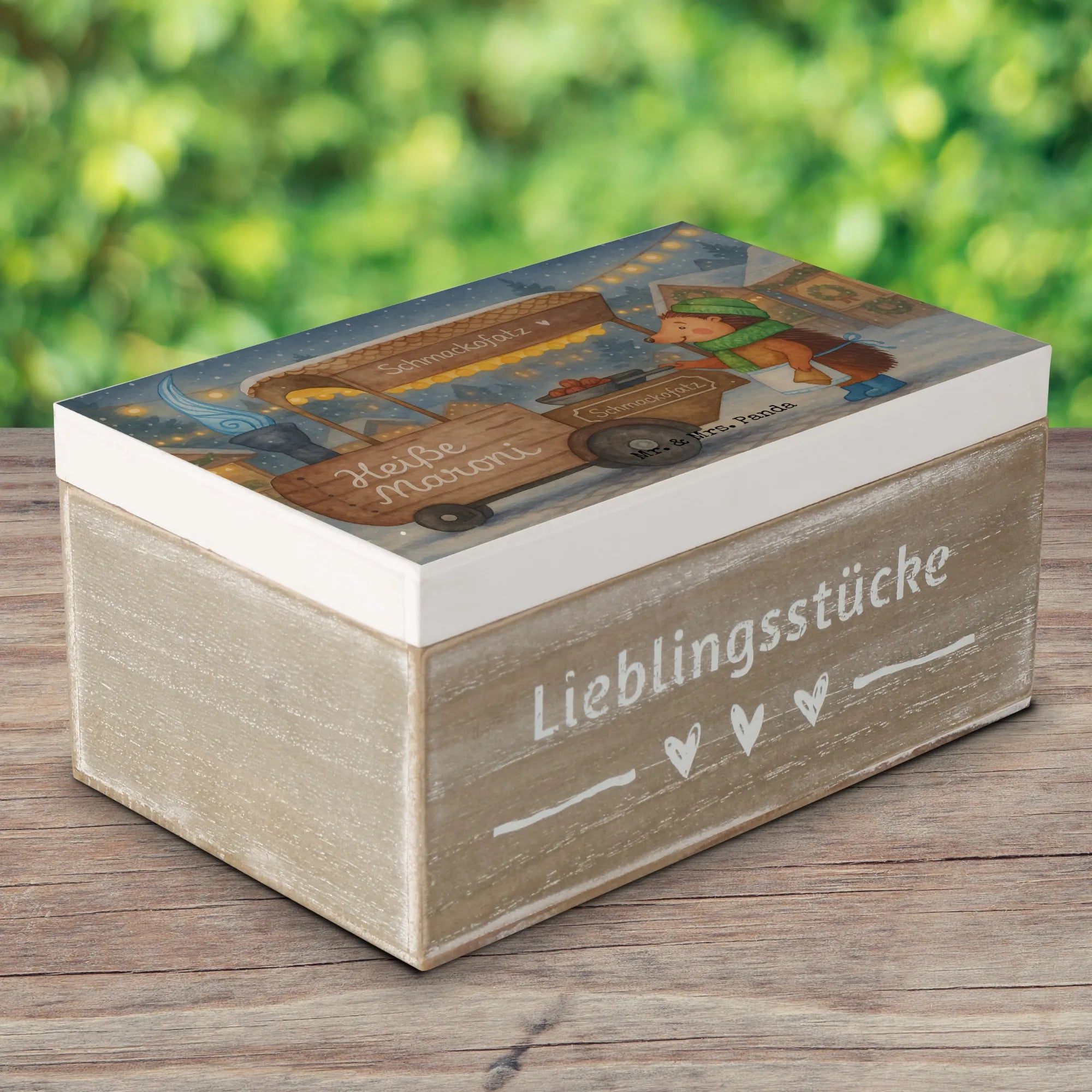 Entdecke die gemütliche Holzkiste von Mr. & Mrs. Panda mit dem liebevoll gestalteten Igel auf seinem Maronenstand. Dieses Wintermotiv weckt Erinnerungen an den Weihnachtsmarkt: der Duft heißer Maroni, warme Wollschals und das heimelige Licht der Adventszeit. Die Kiste ist perfekt als Geschenkbox, Erinnerungskiste oder dekorative Schatulle für Deine schönsten Momente. 🎁❄️