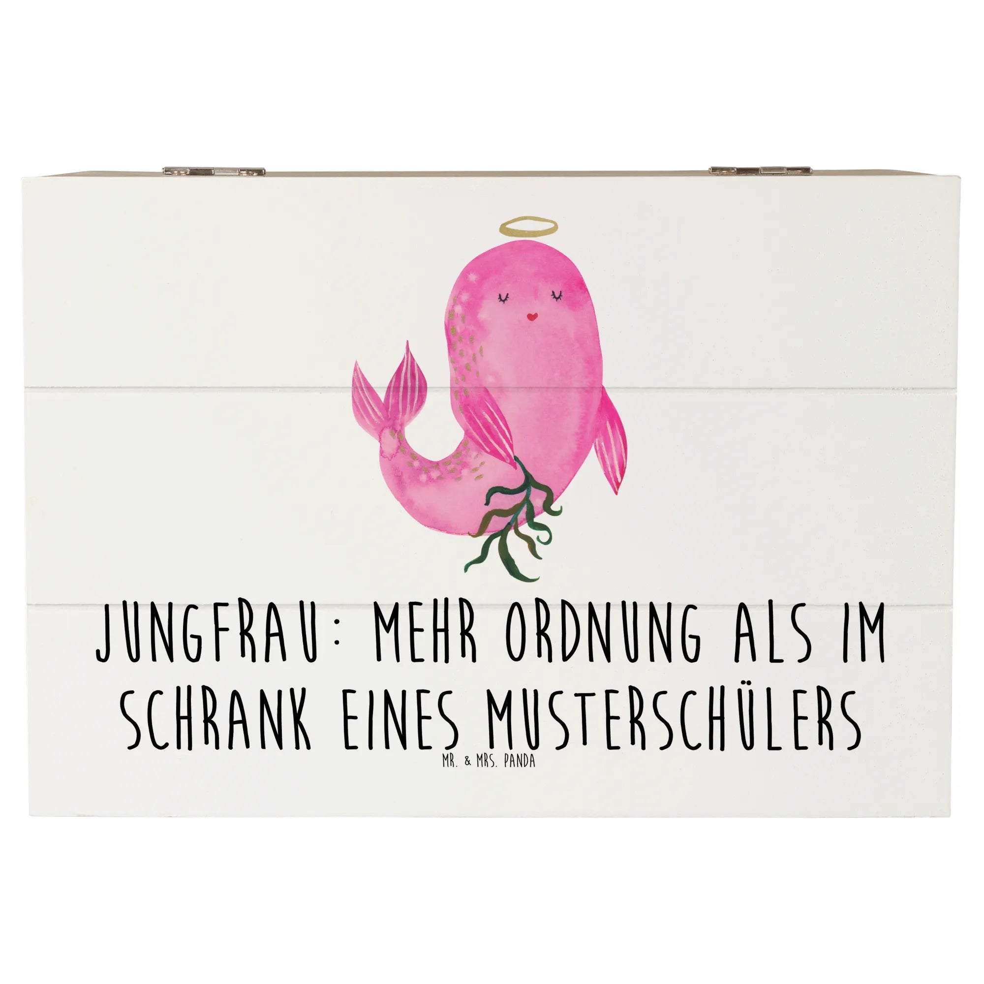 Die Holzkiste von Mr. & Mrs. Panda ist mehr als nur ein Aufbewahrungsort – sie ist ein liebevolles Zuhause für Erinnerungen. Mit ihrem bezaubernden Design und dem Slogan 'Jungfrau: Mehr Ordnung als im Schrank eines Musterschülers' ist diese Kiste perfekt für alle, die das Sternzeichen Jungfrau lieben.