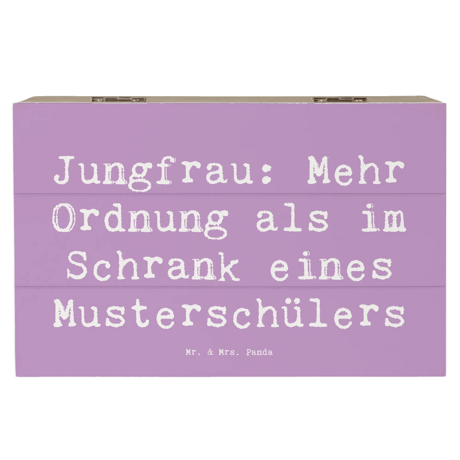 Die Holzkiste "Jungfrau" von Mr. & Mrs. Panda ist der perfekte Begleiter für all jene, die Liebe zur Ordnung und zum Detail schätzen. Mit einem liebevoll gestalteten Motiv und dem charmanten Spruch "Jungfrau: Mehr Ordnung als im Schrank eines Musterschülers" bringt diese Kiste nicht nur einen Hauch von Persönlichkeit in dein Zuhause, sondern bietet auch einen praktischen Platz für all deine Schätze und Erinnerungen.