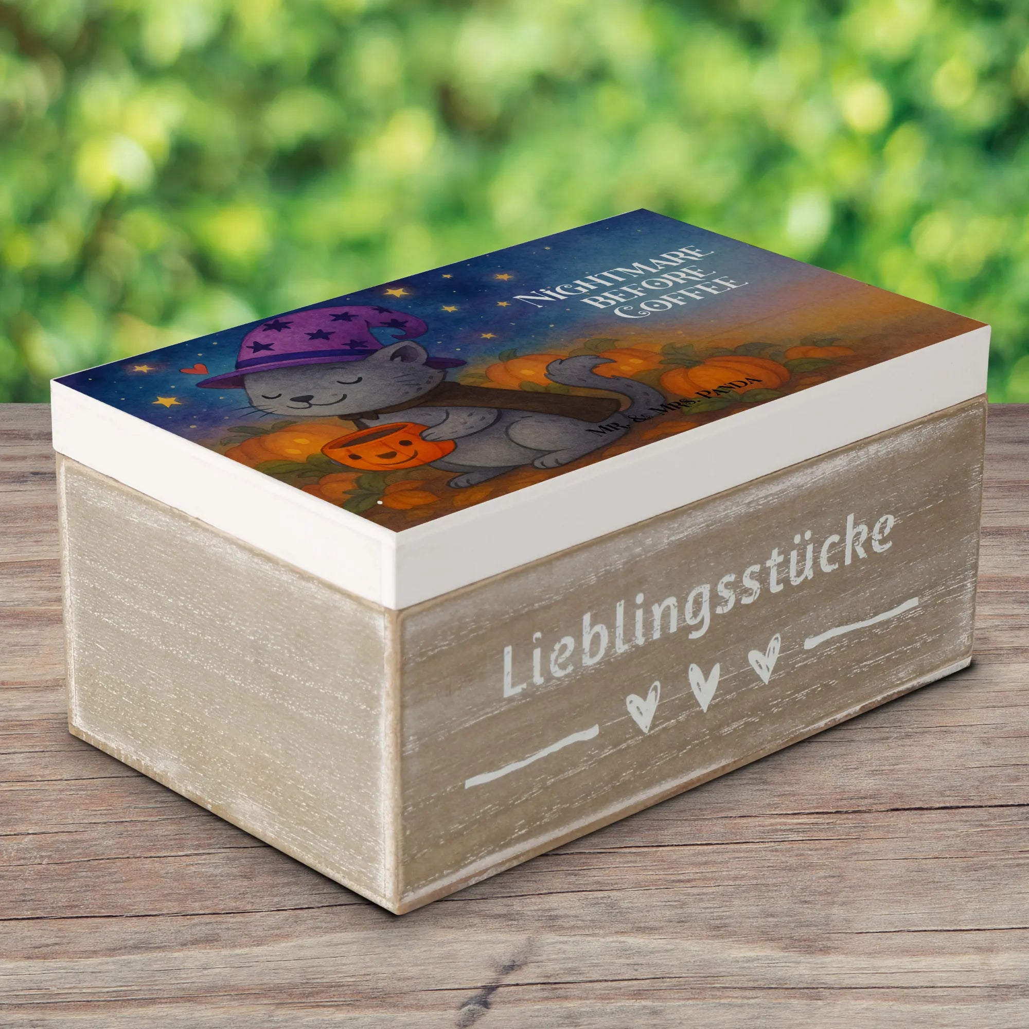Holzkiste Kater Kaffee Design Erinnerungskiste, Holzkiste, Truhe, Aufbewahrungsbox, Schatzkiste, Geschenkdose, Geschenkbox, Kiste, XXL, Erinnerungsbox, Schatulle, Dekokiste, Halloween, Deko, Martinssingen, Dekoration, Geschenke, Schenken, Hexe, Magie, Kater, Kaffee
