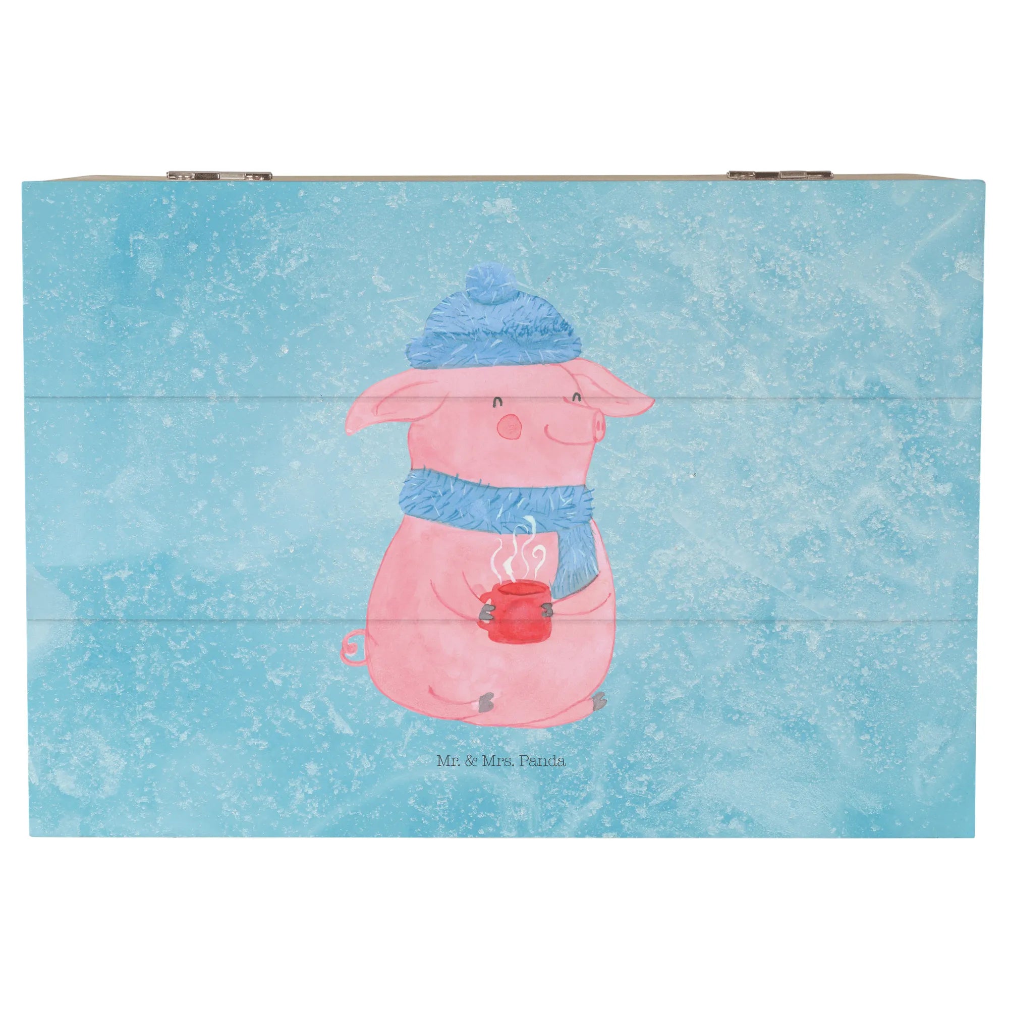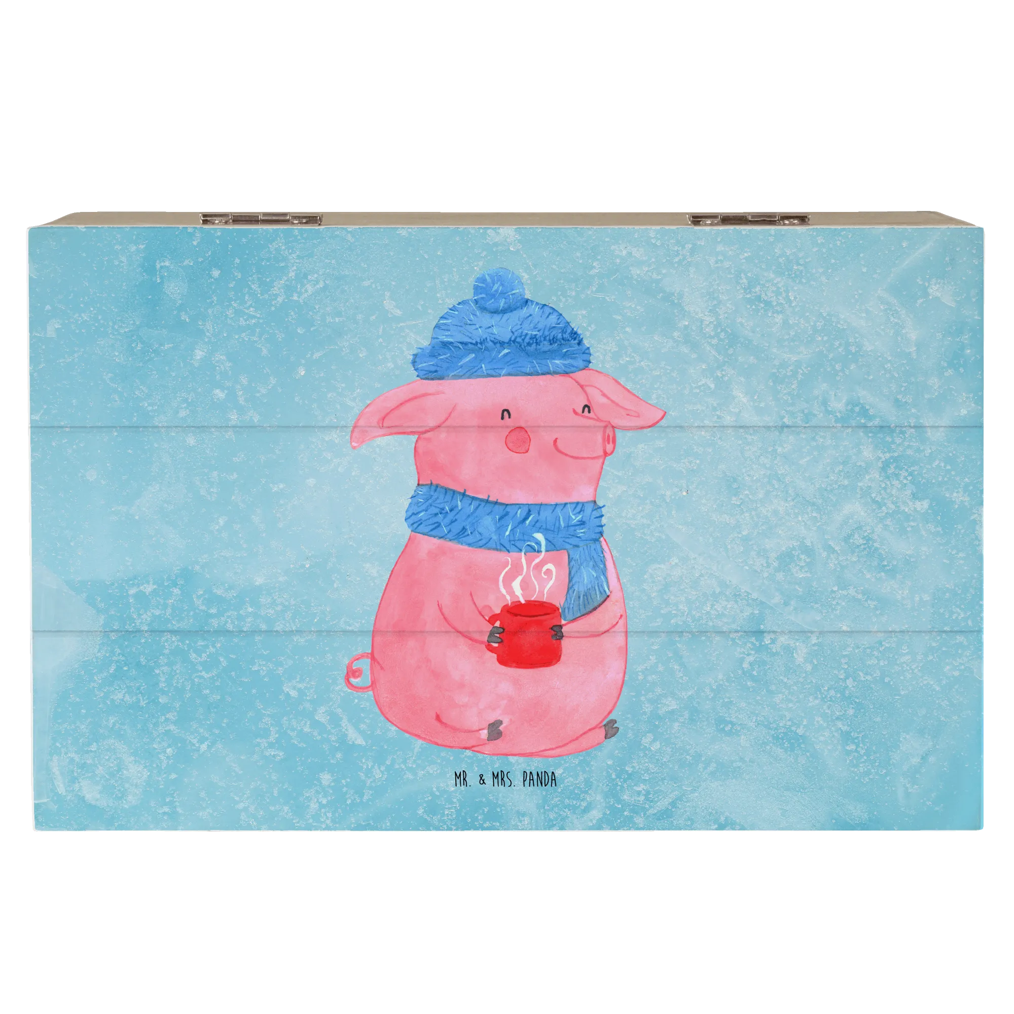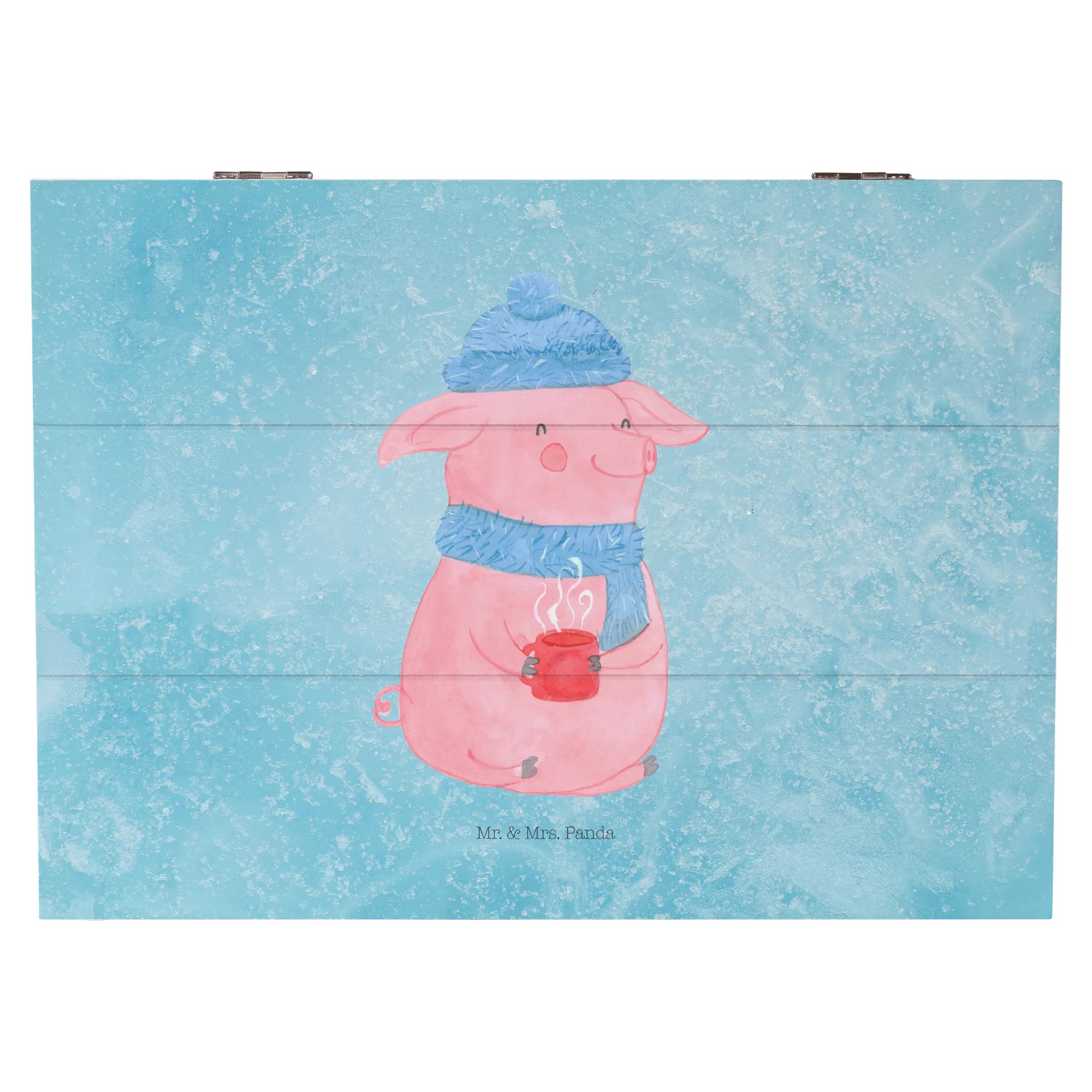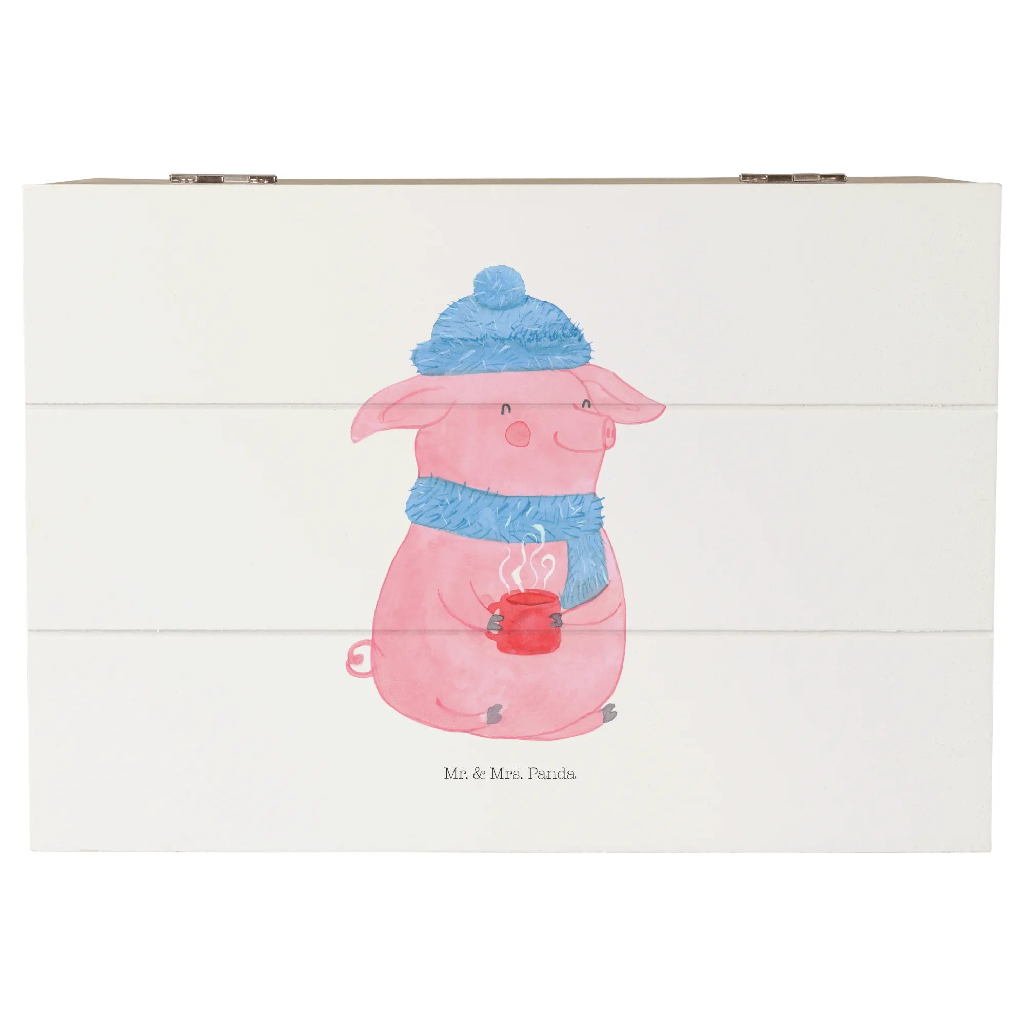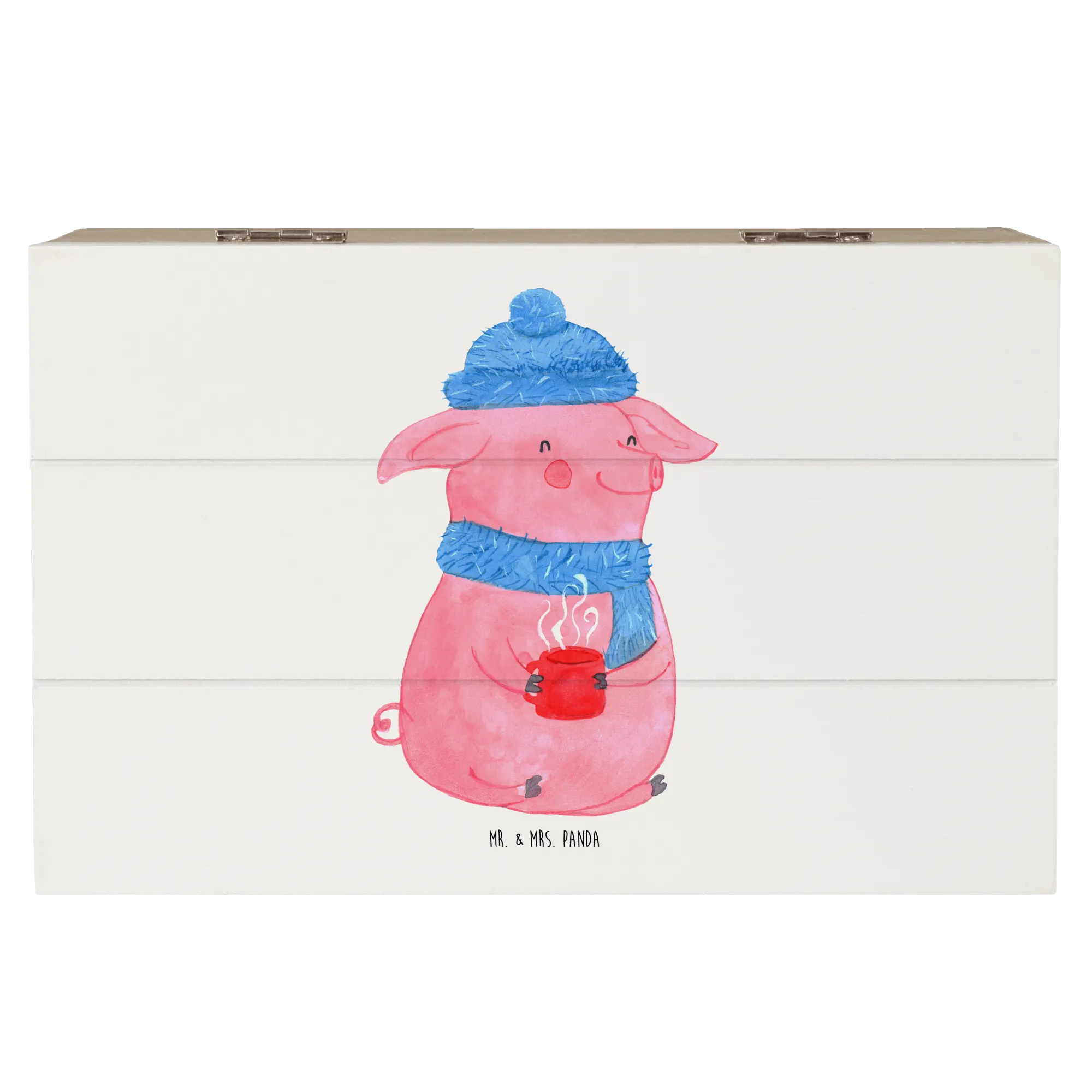 Die Holzkiste misst 25 x 18 cm und ist aus robuster, hochwertiger Holzfaser gefertigt, was sie besonders stabil und langlebig macht. Lass dich von der liebevollen Handzeichnung von Mrs. Panda inspirieren, die das Lächeln des anthropomorphen Schweins, das mit einem blauen Schal und einer Mütze ausgestattet ist, festhält, während es eine dampfende Tasse in der Hand hält.