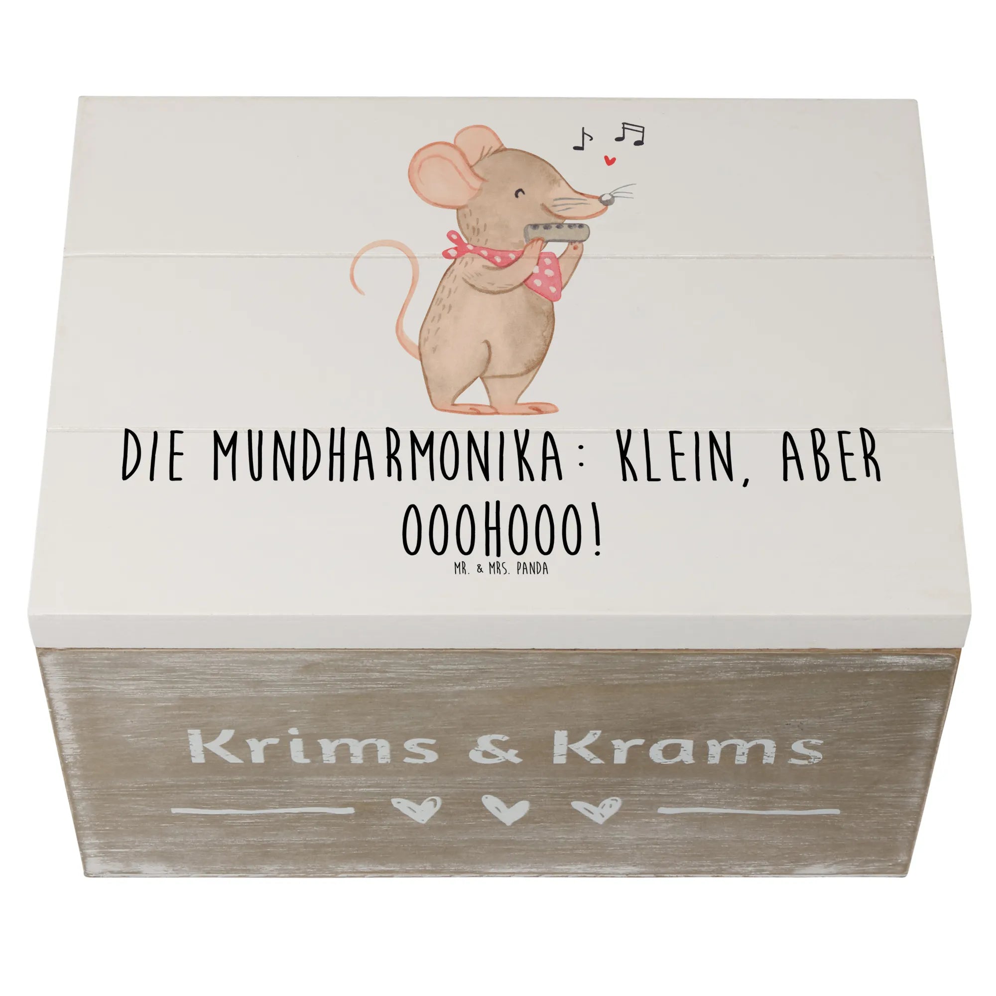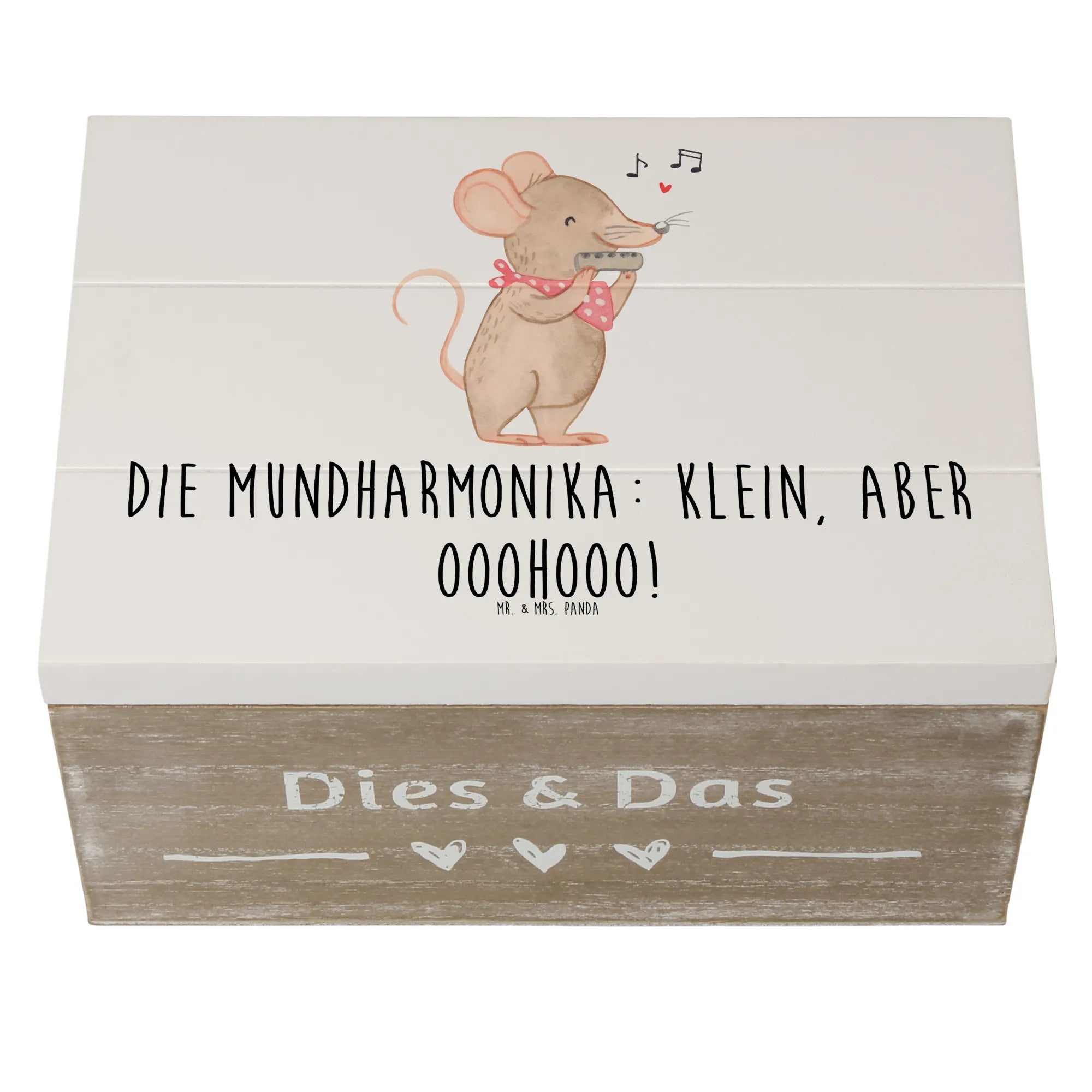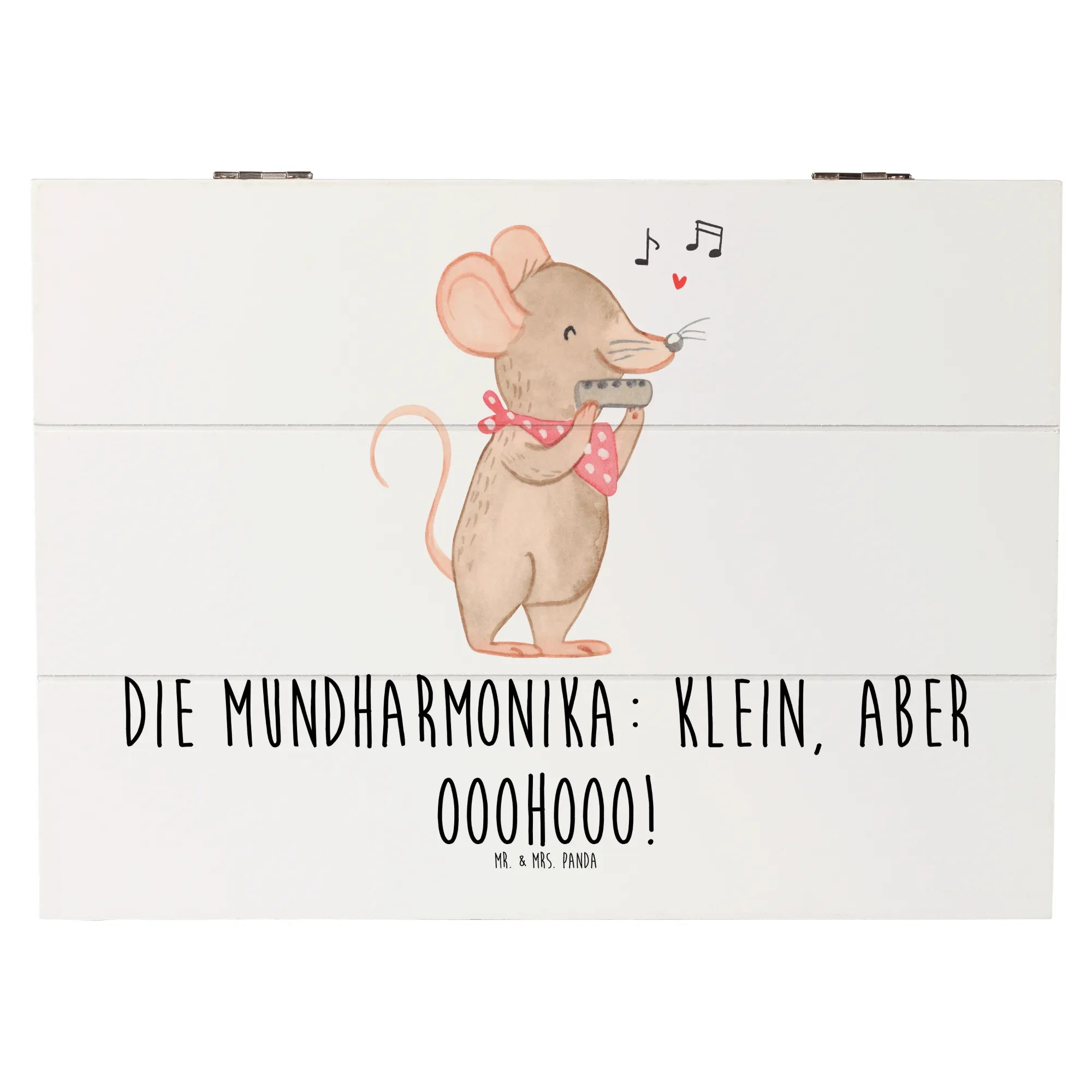 Die wundervolle Holzkiste von Mr. & Mrs. Panda ist nicht nur ein praktischer Aufbewahrungsort, sondern auch ein liebevoll gestaltetes Erinnerungsstück. Mit einem bezaubernden Motiv der Mundharmonika und dem Slogan "Die Mundharmonika: klein, aber ooohooo!" entführt sie Dich in die faszinierende Welt der Musik.