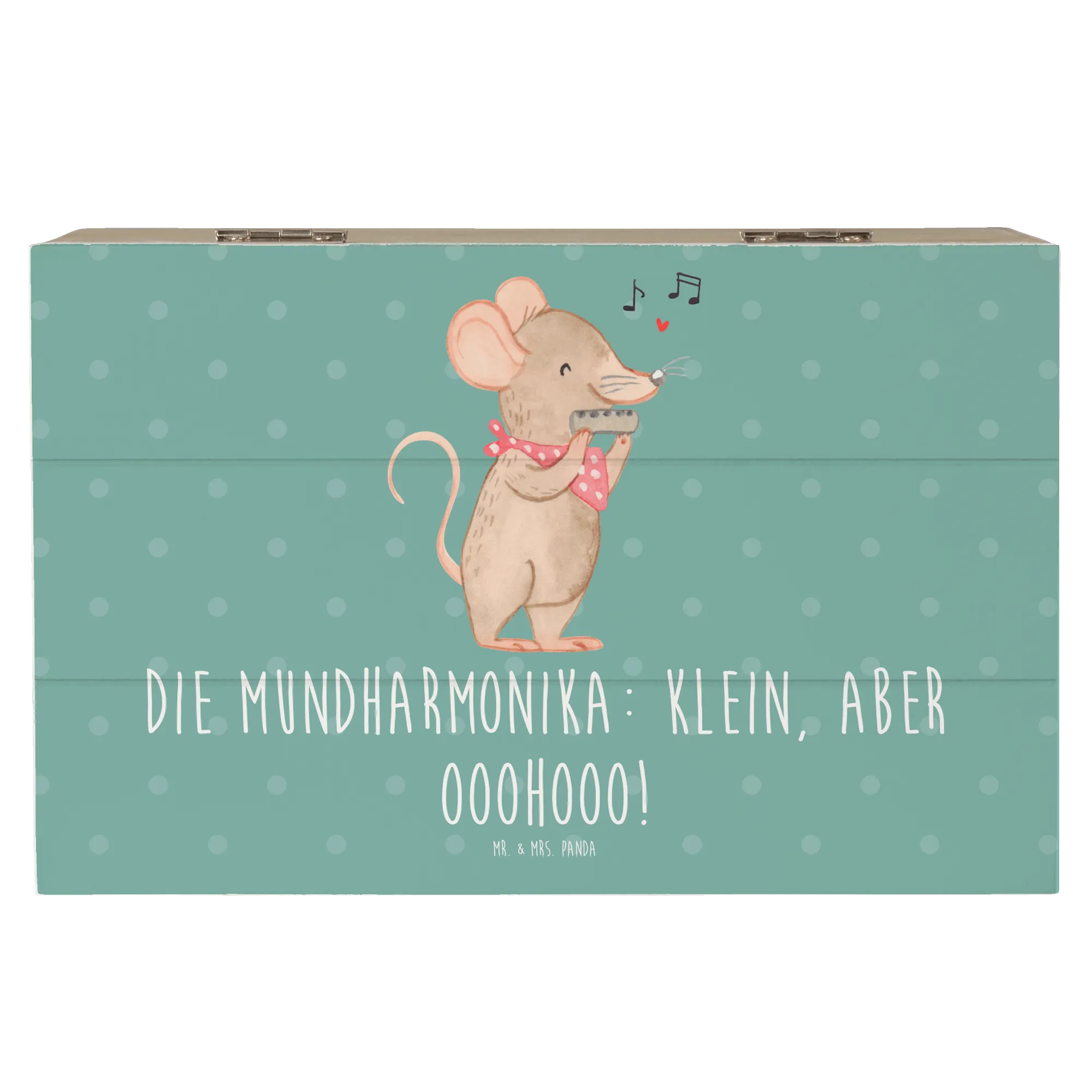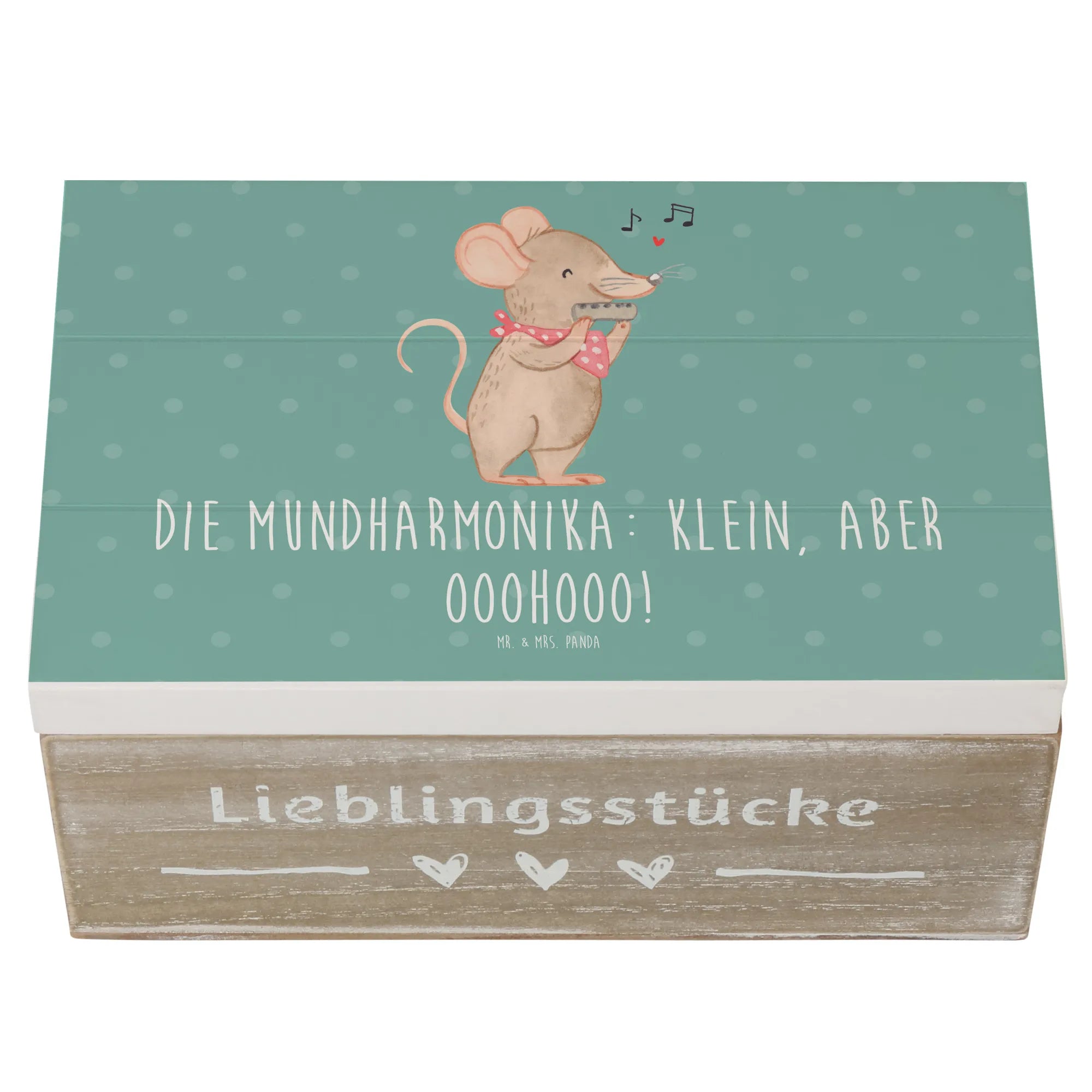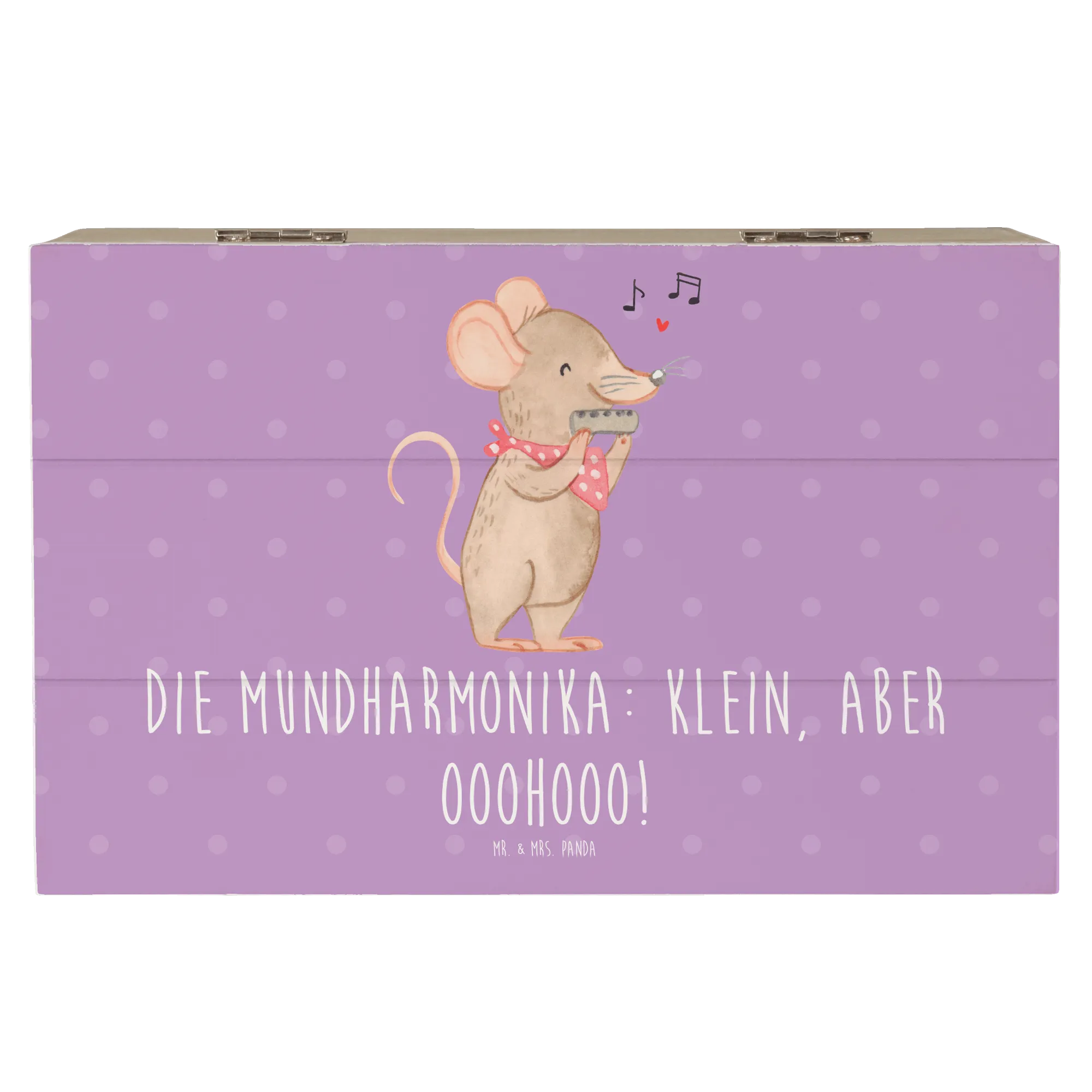Die wundervolle Holzkiste von Mr. & Mrs. Panda ist nicht nur ein praktischer Aufbewahrungsort, sondern auch ein liebevoll gestaltetes Erinnerungsstück. Mit einem bezaubernden Motiv der Mundharmonika und dem Slogan "Die Mundharmonika: klein, aber ooohooo!" entführt sie Dich in die faszinierende Welt der Musik.