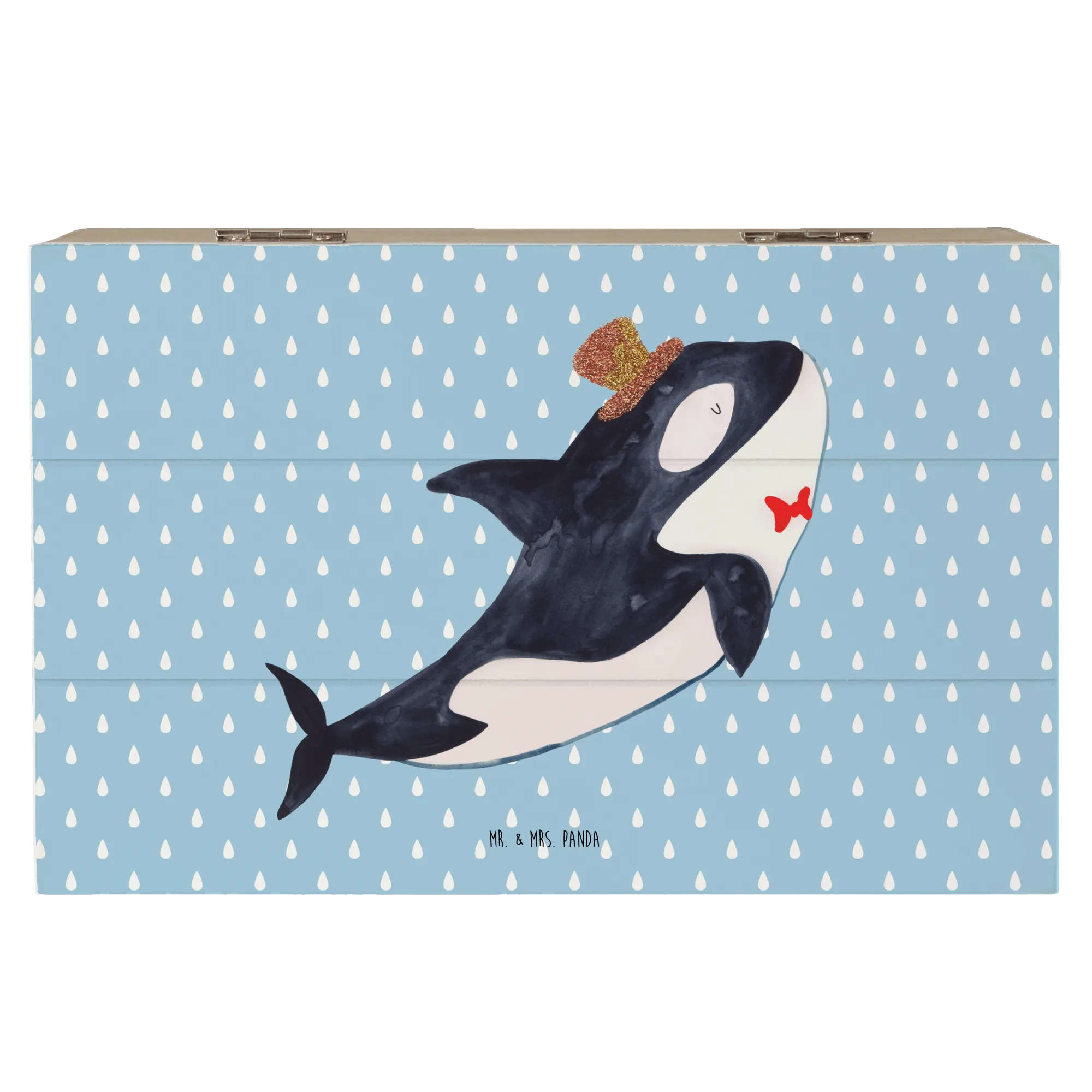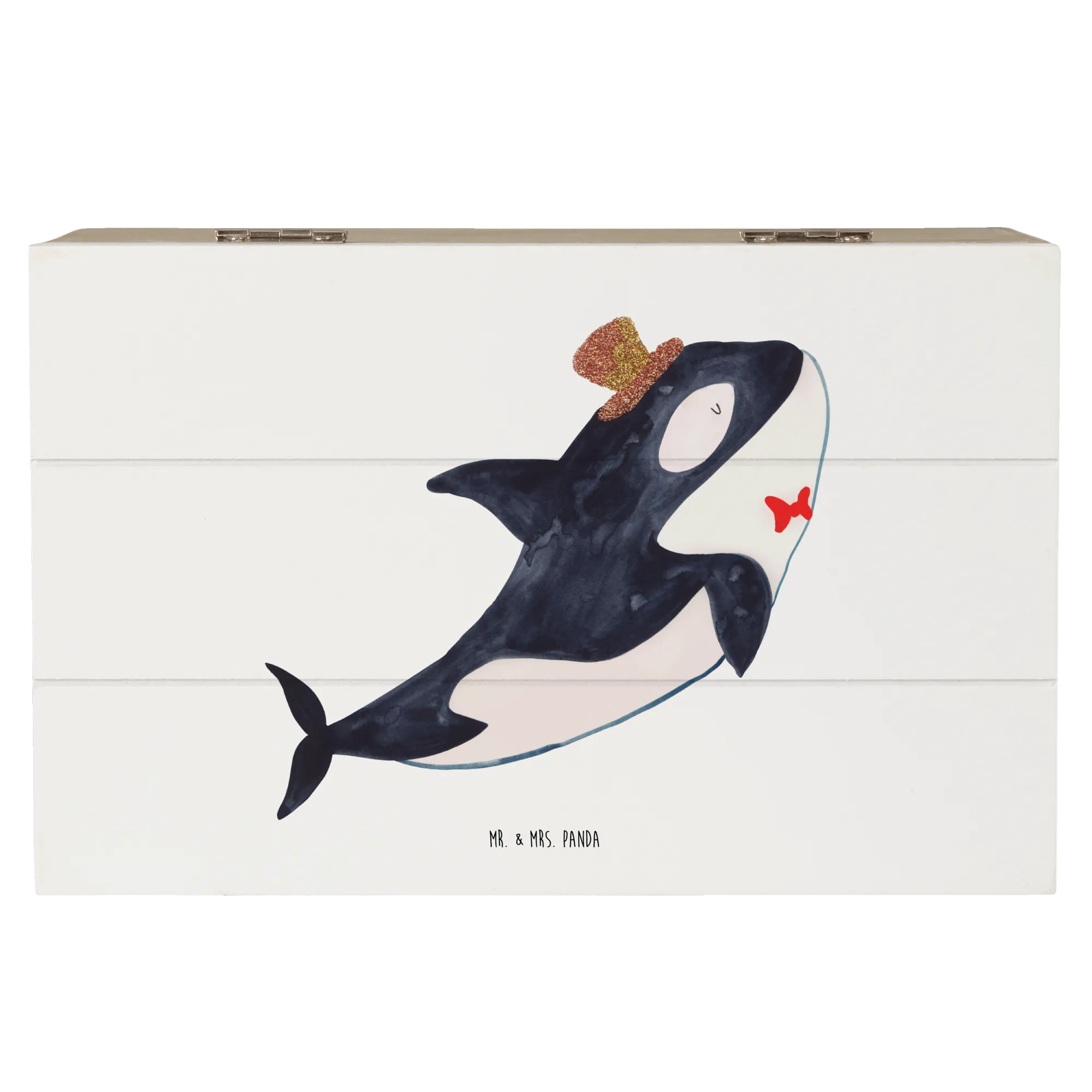 Die Holzkiste mit dem niedlichen Motiv des Orcas Zylinders von Mr. & Mrs. Panda ist der perfekte Aufbewahrungsort für all deine Erinnerungen und Schätze. Egal, ob du sie als Erinnerungskiste für die schönsten Erlebnisse deines Lebens nutzen möchtest oder sie einfach als Dekokiste ins Wohnzimmer stellst – diese Kiste ist ein wahrhaft zauberhaftes Accessoire voller Liebe und Kreativität.