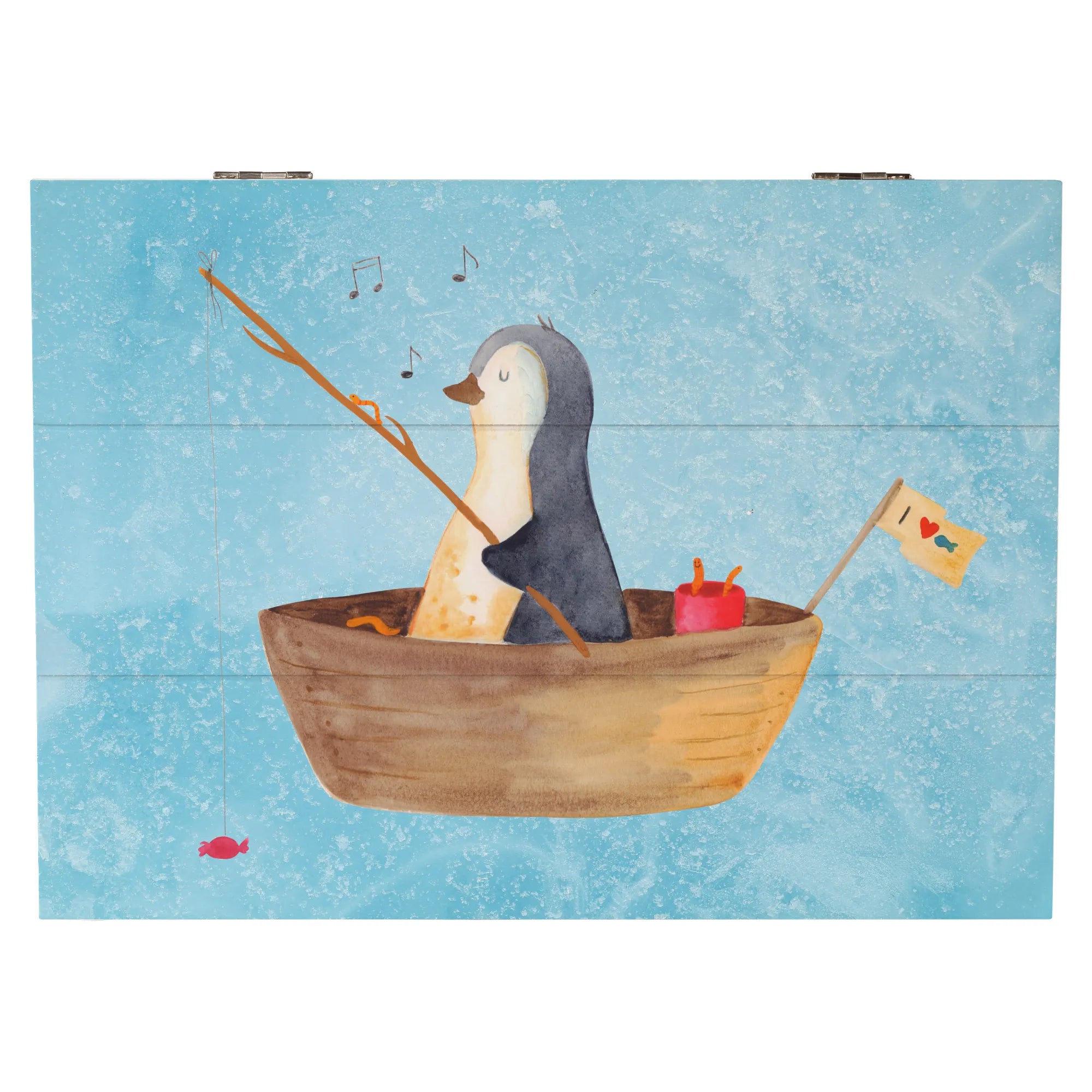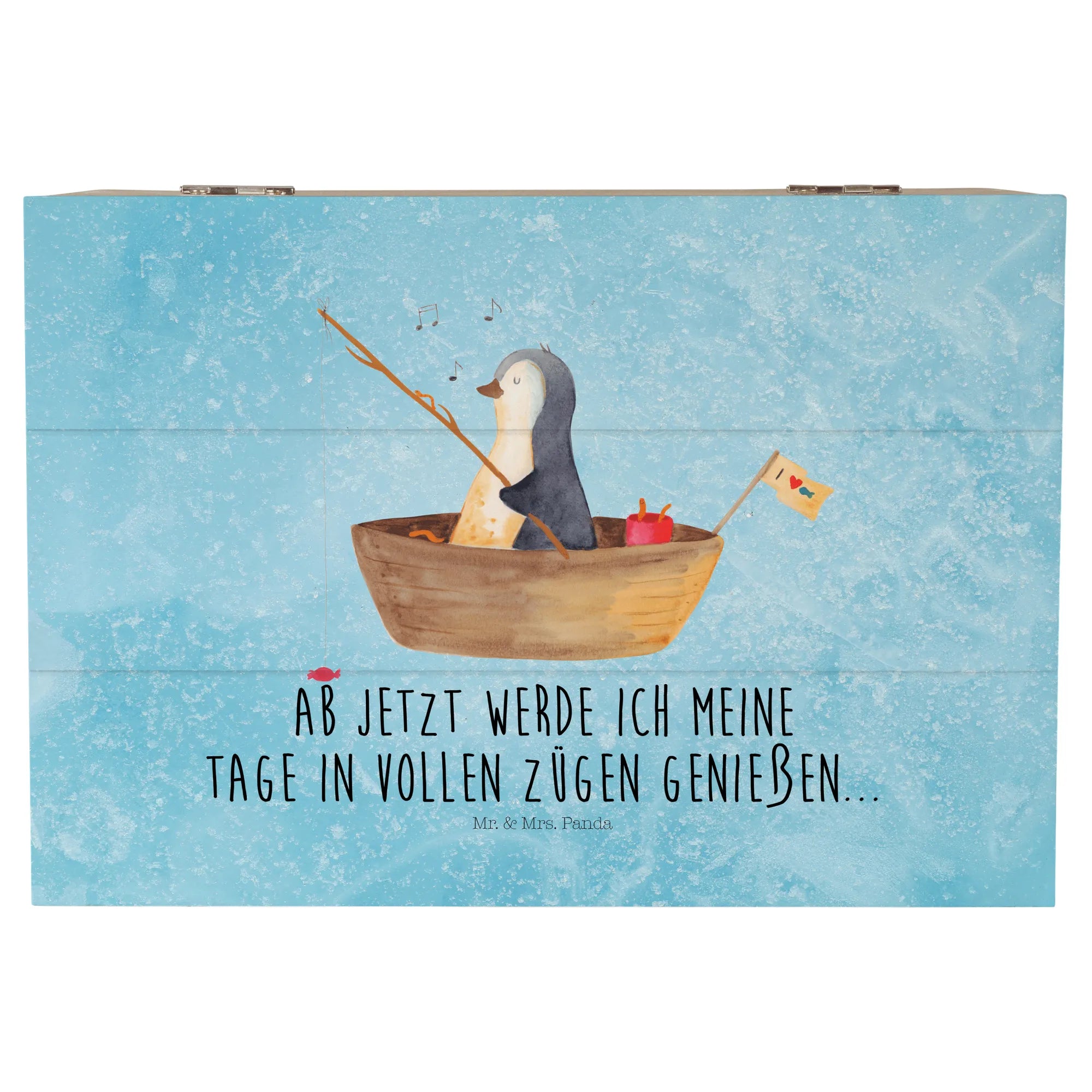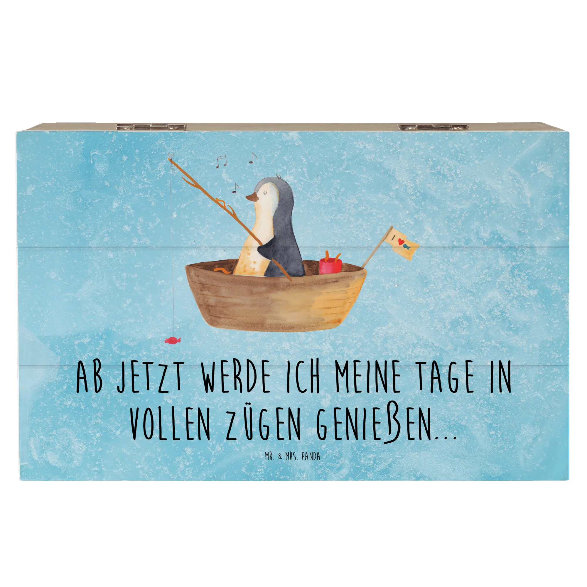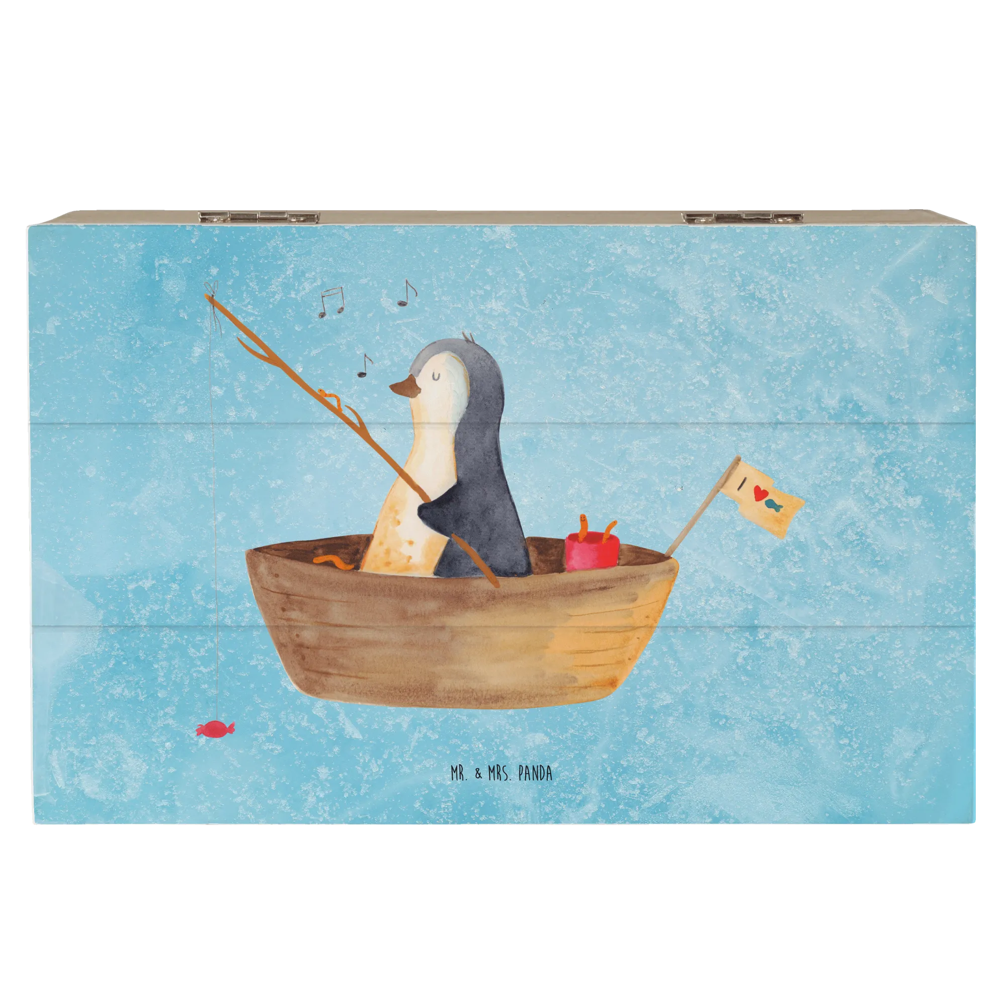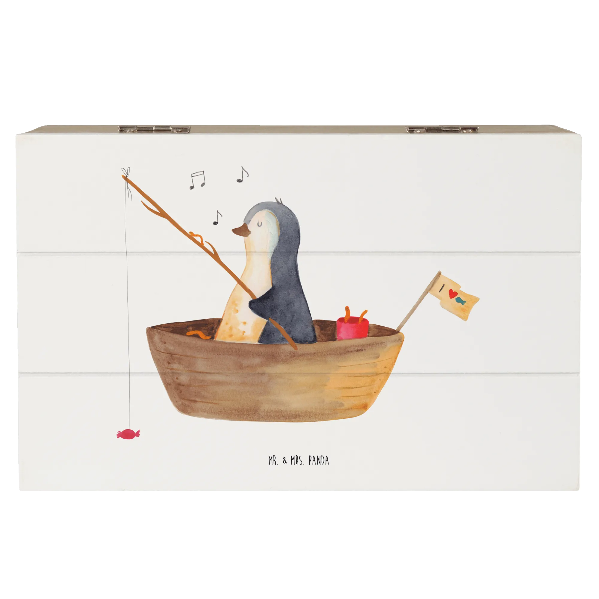 Die wunderschöne Holzkiste von Mr. & Mrs. Panda mit dem zauberhaften Motiv eines Pinguins im Angelboot ist das perfekte Geschenk für jeden Pinguinliebhaber!