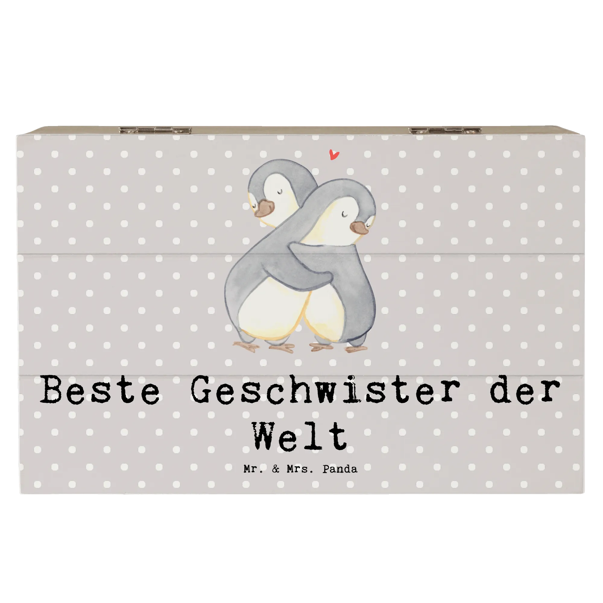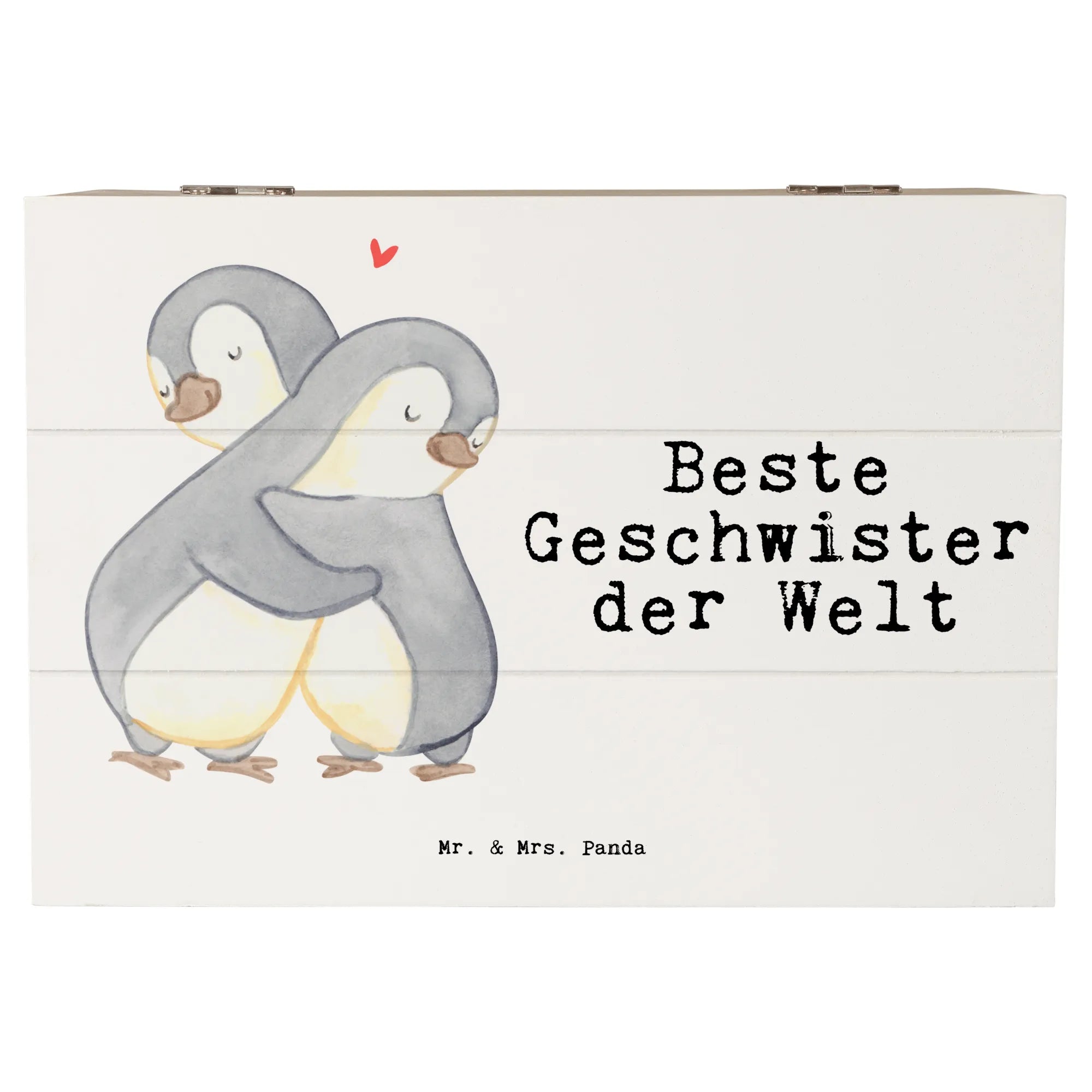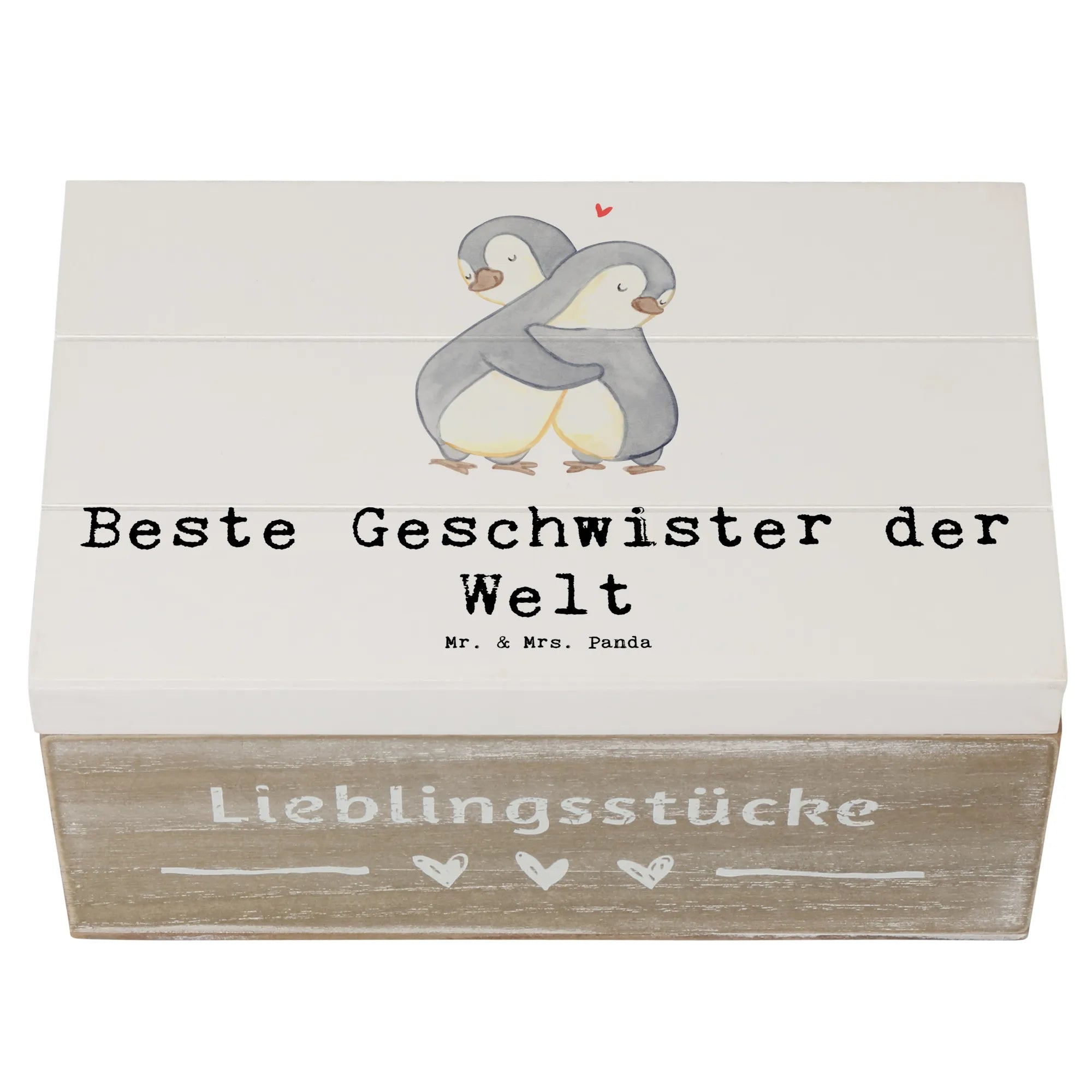 Die Holzkiste "Beste Geschwister der Welt" von Mr. & Mrs. Panda ist das perfekte Geschenk für Geschwister und Familienmitglieder. Mit ihrem niedlichen Pinguin-Motiv, das zwei Pinguine zeigt, die sich liebevoll umarmen, strahlt die Kiste pure Herzenswärme aus.