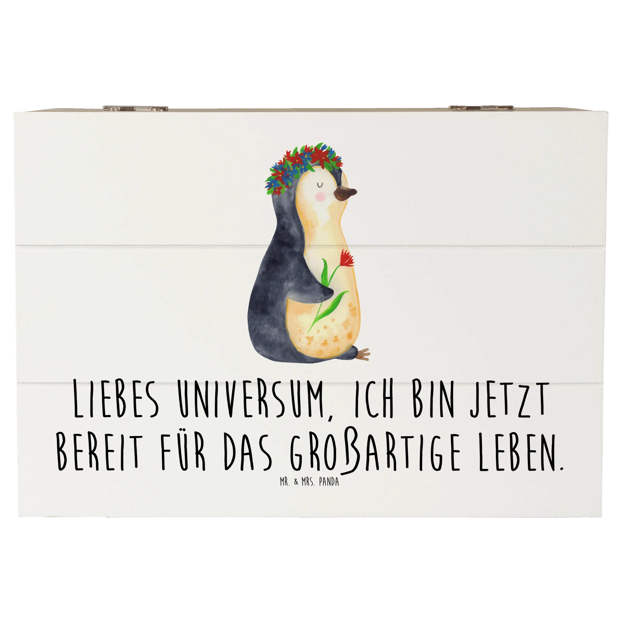 Eine wunderschöne Holzkiste von Mr. & Mrs. Panda: Das Motiv „Pinguin Blumenkranz“ aus der Pinguin - Kollektion zaubert sofort ein Lächeln. Ein süßer Pinguin mit Blumenkranz und Blume in der Hand symbolisiert Lebenslust, Sanftmut und kleine Glücksmomente – ideal als Geschenkidee für Freundinnen, Kinder oder als tröstende Aufmerksamkeit bei Liebeskummer.