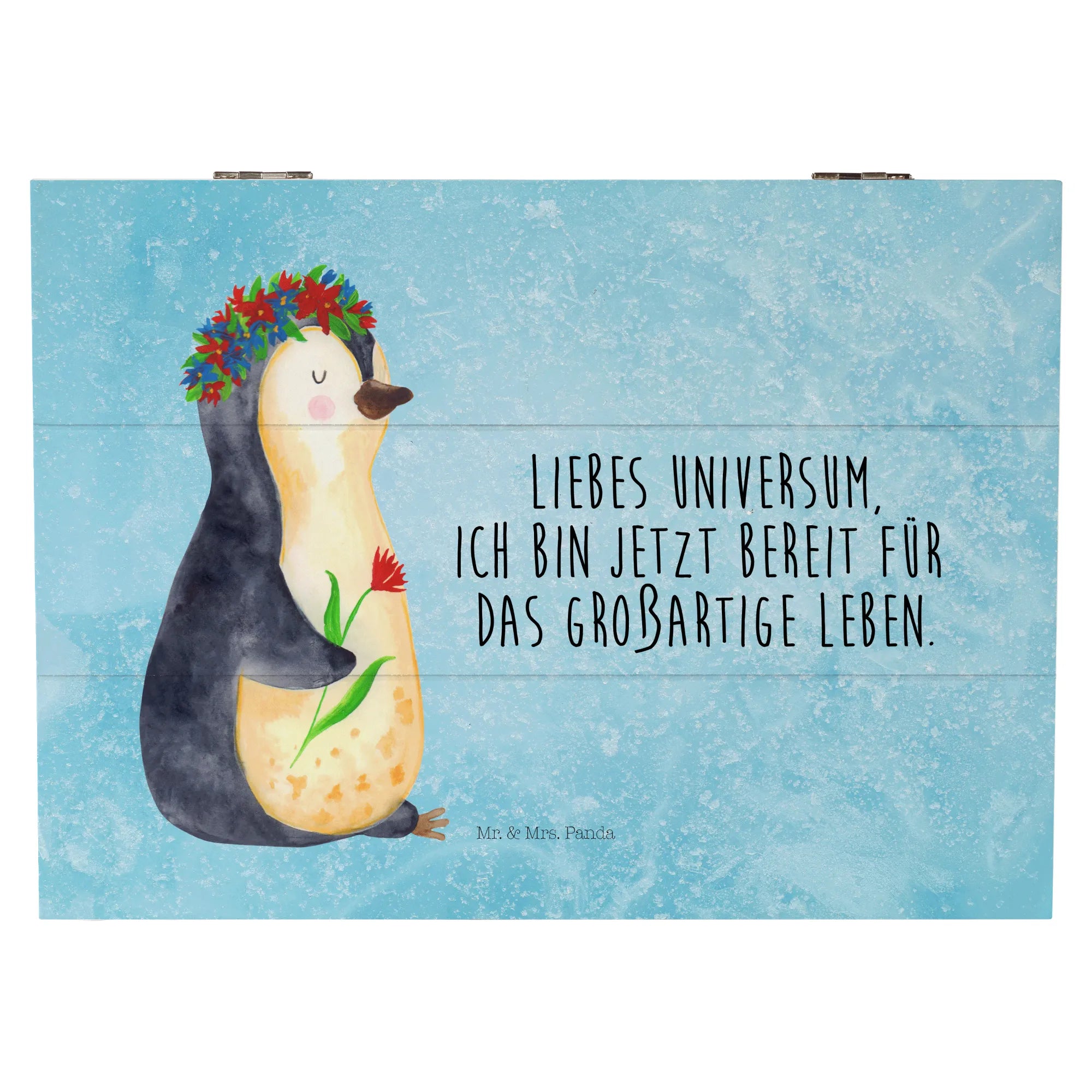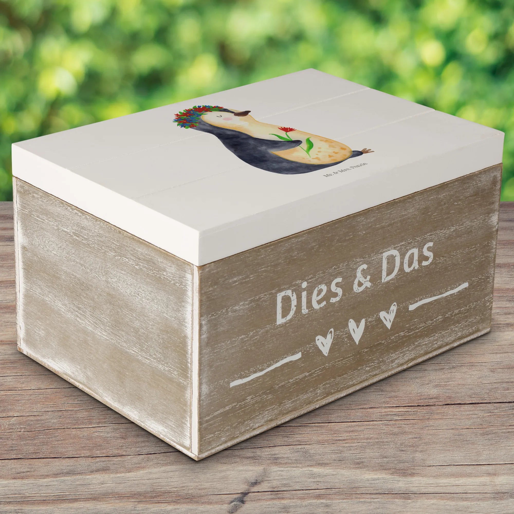 Die wunderschöne Holzkiste mit dem entzückenden Pinguin Blumenkranz-Motiv von Mr. & Mrs. Panda ist das perfekte Geschenk für all jene, die Lebensfreude und Erinnerungen schätzen. Diese Erinnerungskiste bietet nicht nur einen hübschen Platz für deine Schätze, sondern sorgt auch für ein Lächeln auf den Gesichtern deiner Liebsten.