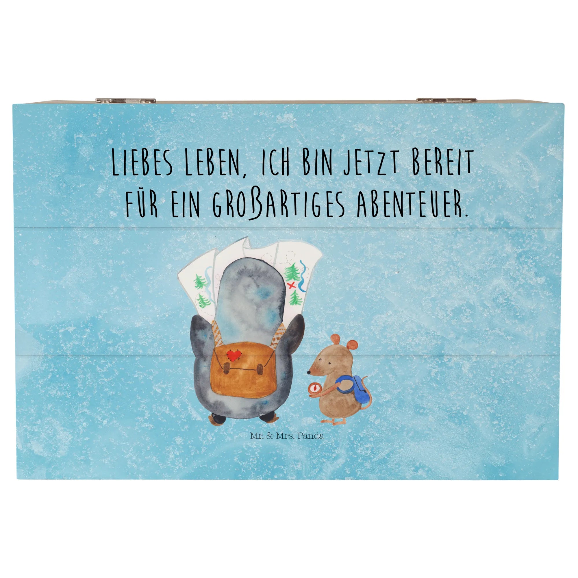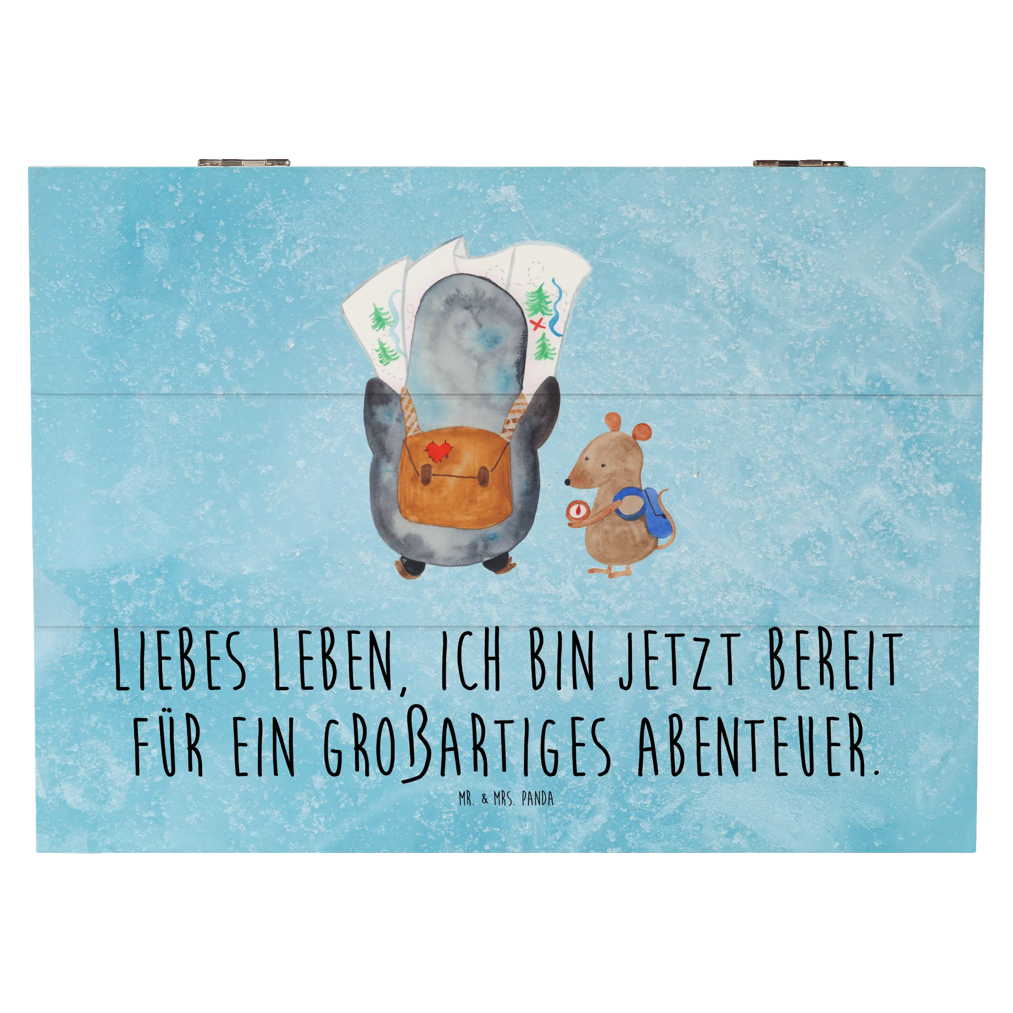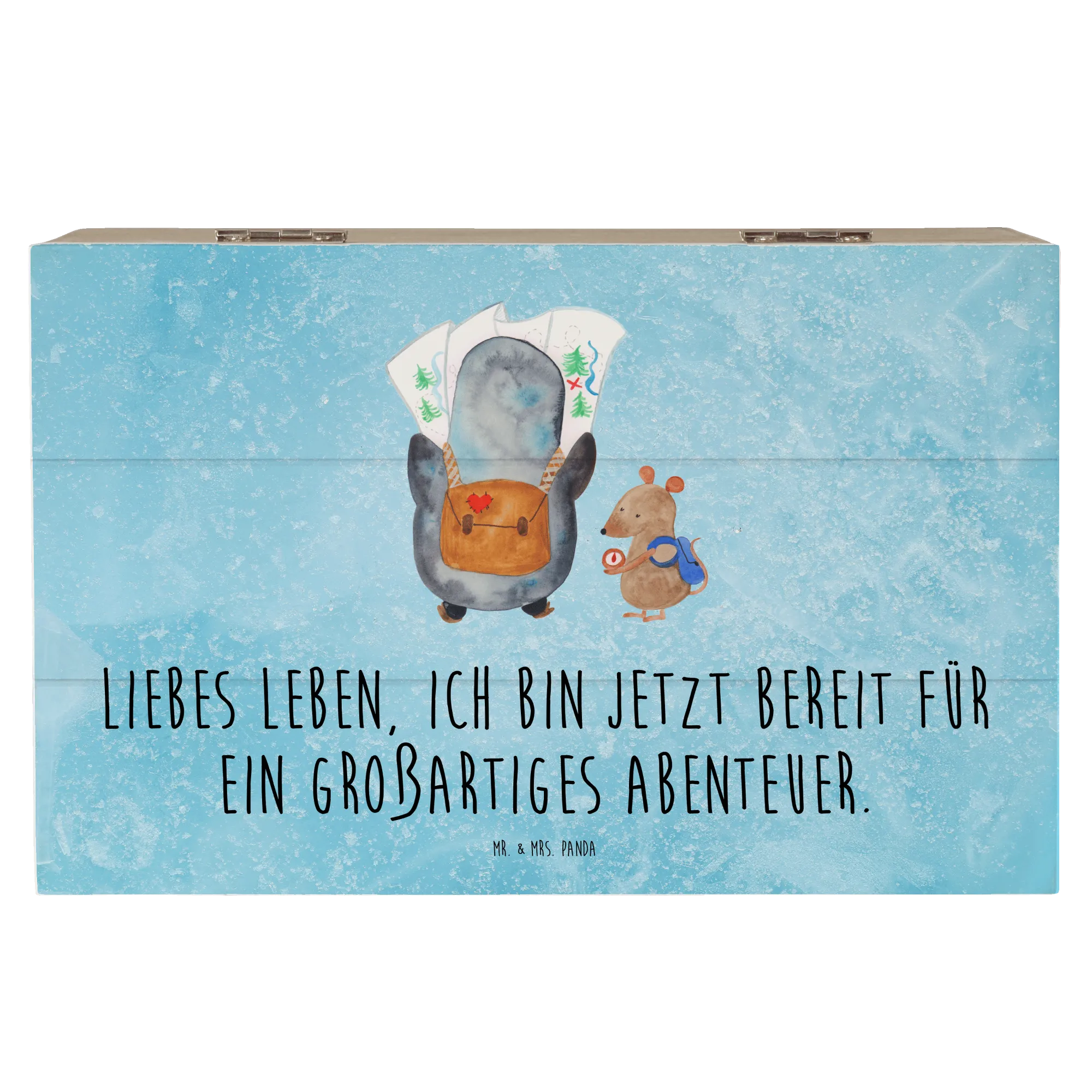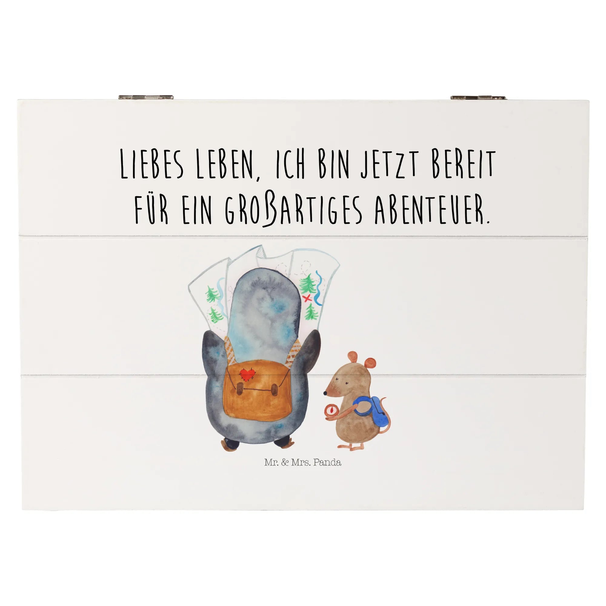 Mr. & Mrs. Panda Holzkiste „Pinguin & Maus Wanderer“ – eine zauberhafte Schatzkiste aus der Pinguin - Kollektion, ideal für alle, die Abenteuer lieben. 🐧🐭 Die niedlichen Gefährten planen gemeinsam ihren nächsten Ausflug: Der Pinguin schaut auf die Landkarte, die Maus prüft den Kompass. Dazu begleitet dich der Spruch: „Liebes Leben, ich bin jetzt bereit für ein großartiges Abenteuer.“