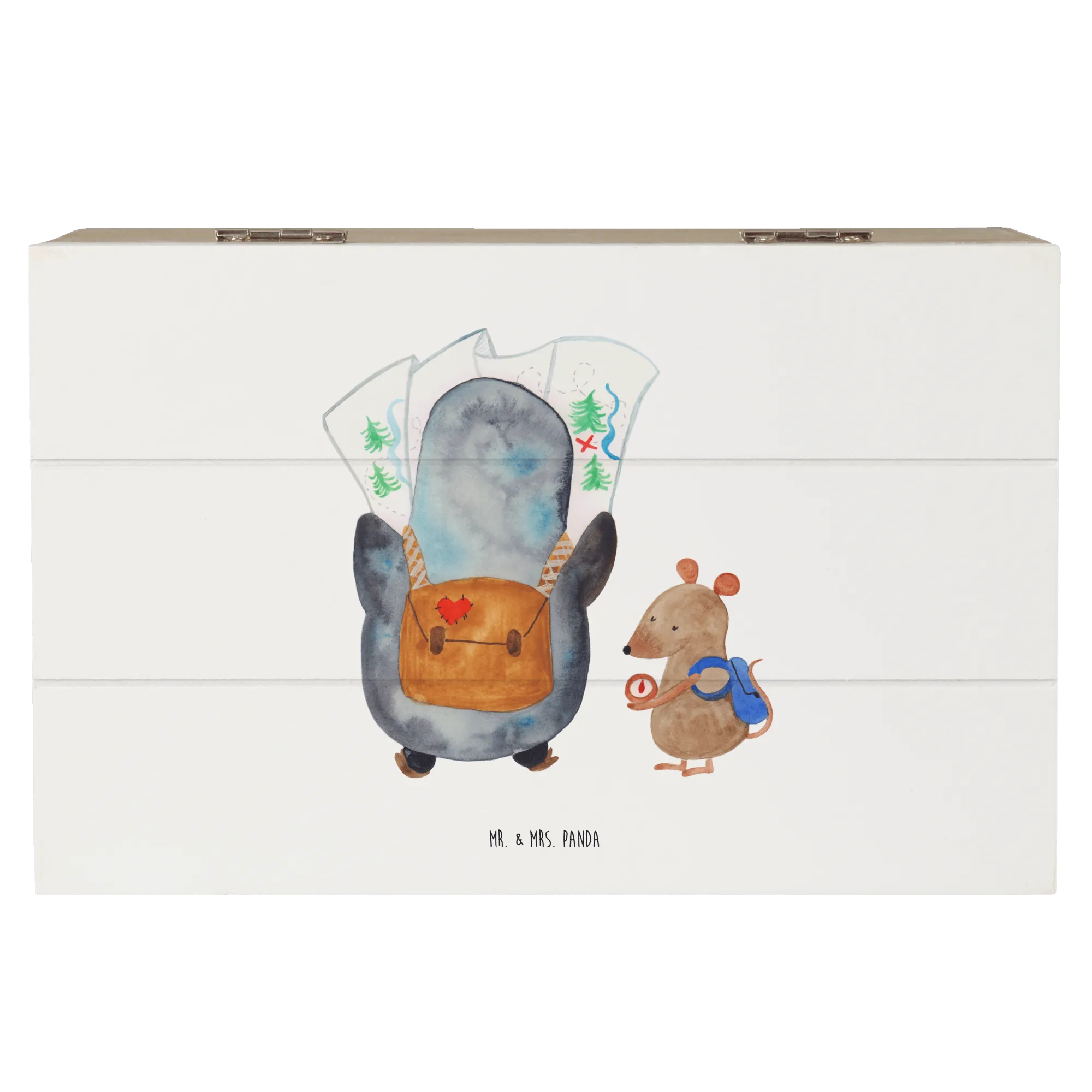 Die wunderschöne Holzkiste "Pinguin & Maus Wanderer" aus der Pinguin-Kollektion von Mr. & Mrs. Panda ist der perfekte Aufbewahrungsort für all deine wertvollen Schätze!