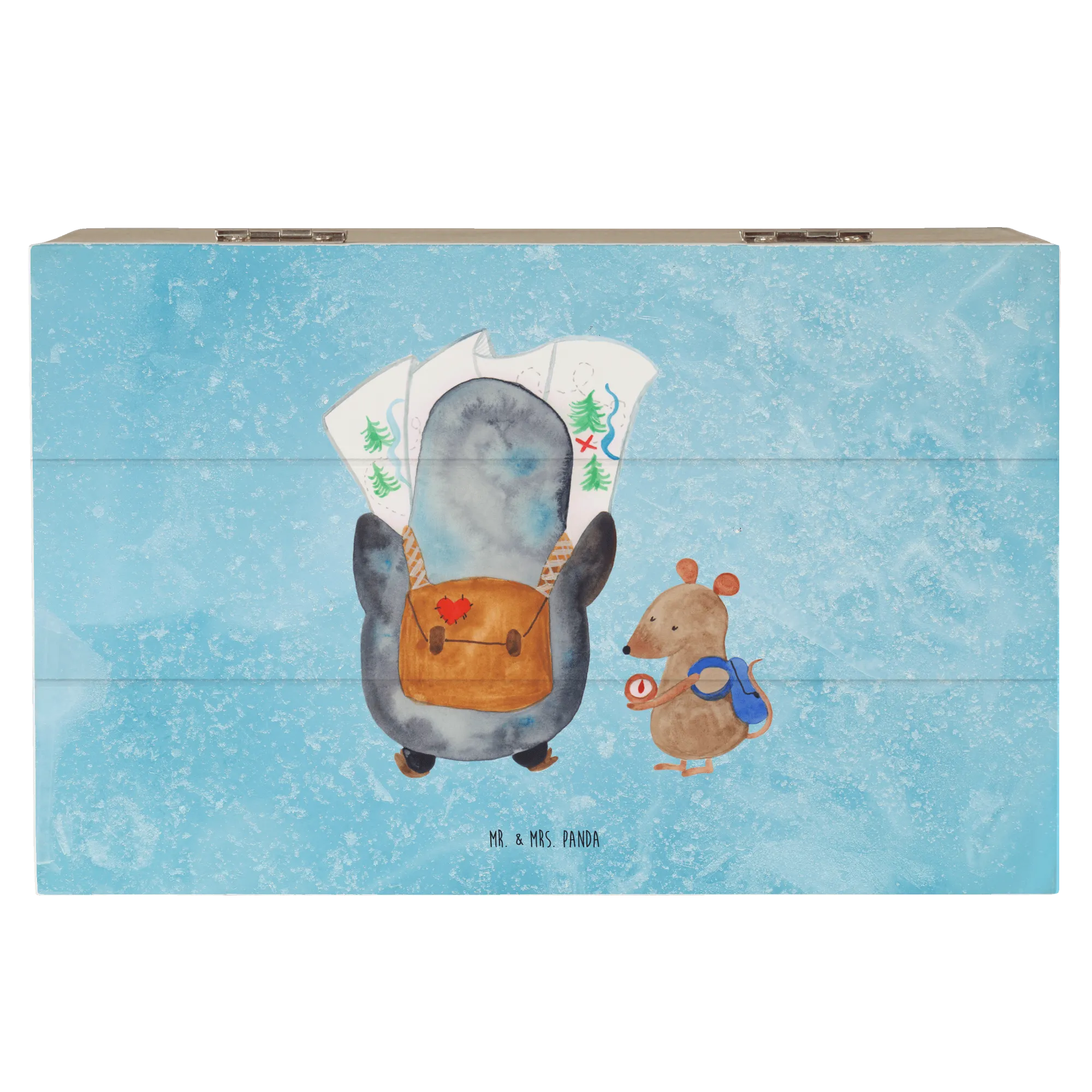 Entdecke die zauberhafte Holzkiste mit dem liebevollen Motiv Pinguin & Maus Wanderer von Mr. & Mrs. Panda!