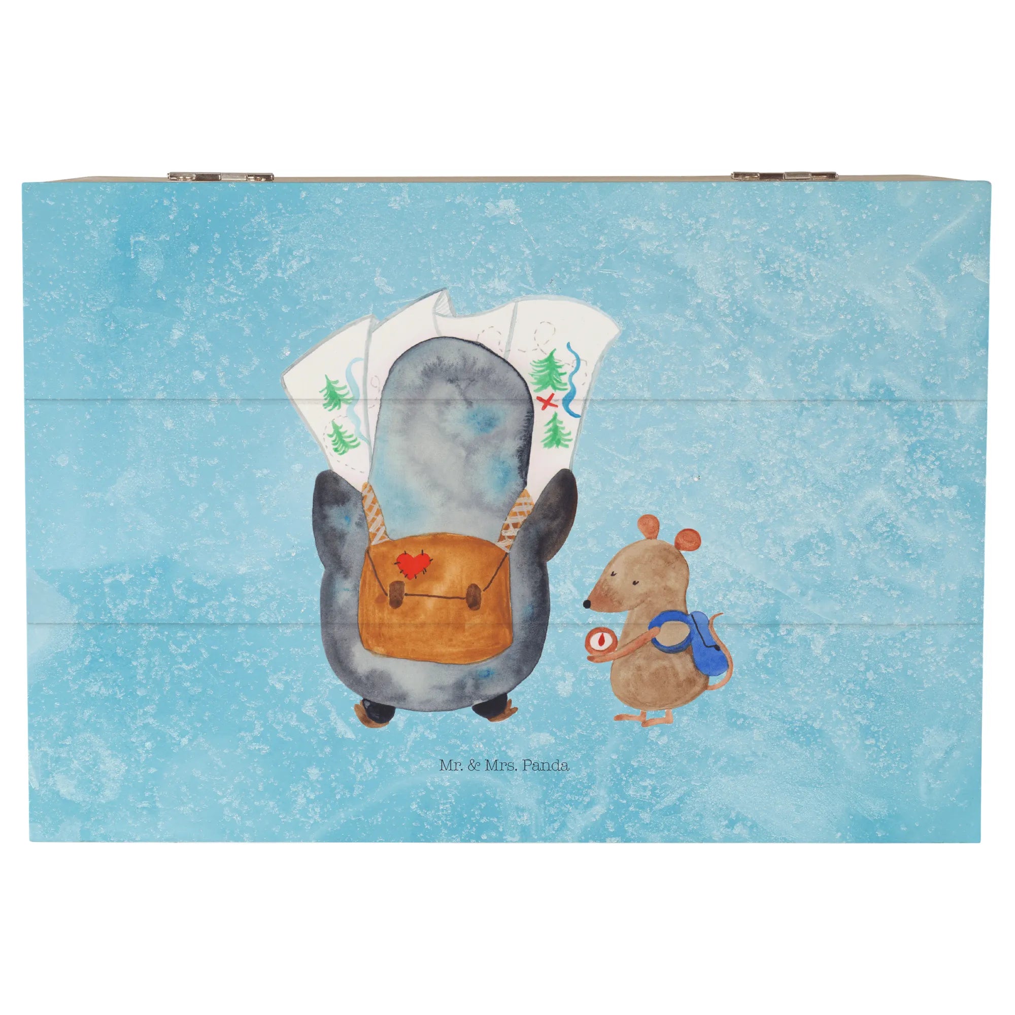 Mit den Maßen von 180 mm x 250 mm x 150 mm ist sie optimal als Erinnerungskiste für besondere Anlässe wie Kommunion oder Konfirmation geeignet. Die detailverliebte Illustration zeigt einen neugierigen Pinguin, der auf eine Landkarte schaut, während die schlaue Maus den Kompass überprüft. Handgezeichnet von Mr. & Mrs. Panda, strahlt dieses Design eine wundervolle Lebendigkeit aus!