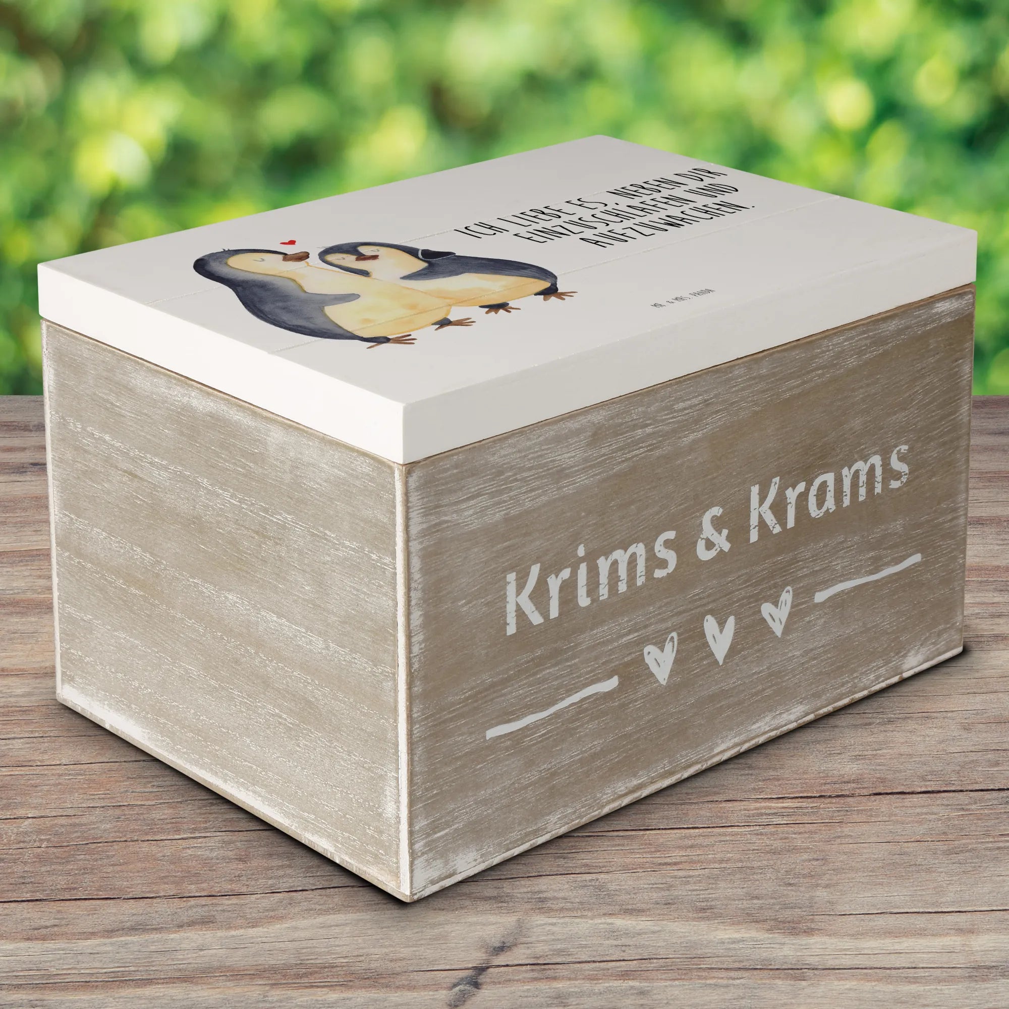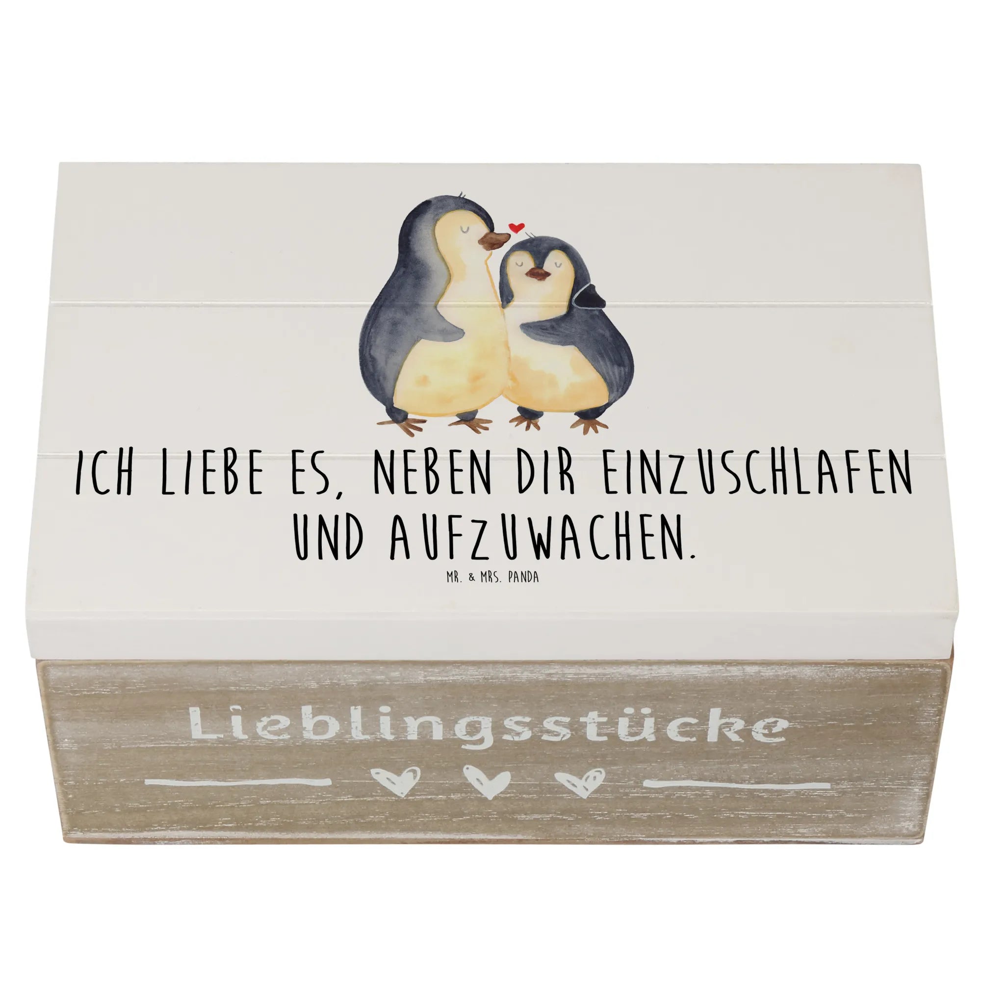 Die charmanten Pinguine, die sich liebevoll aneinander kuscheln und unter einem schwebenden Herzen dargestellt sind, vermitteln eine Botschaft der Liebe und Zuneigung. Der liebevolle Spruch "Ich liebe es, neben dir einzuschlafen und aufzuwachen." verleiht der Kiste einen besonderen emotionalen Wert und macht sie zu einem idealen Geschenk für den Valentinstag, den Hochzeitstag oder einen Jahrestag.