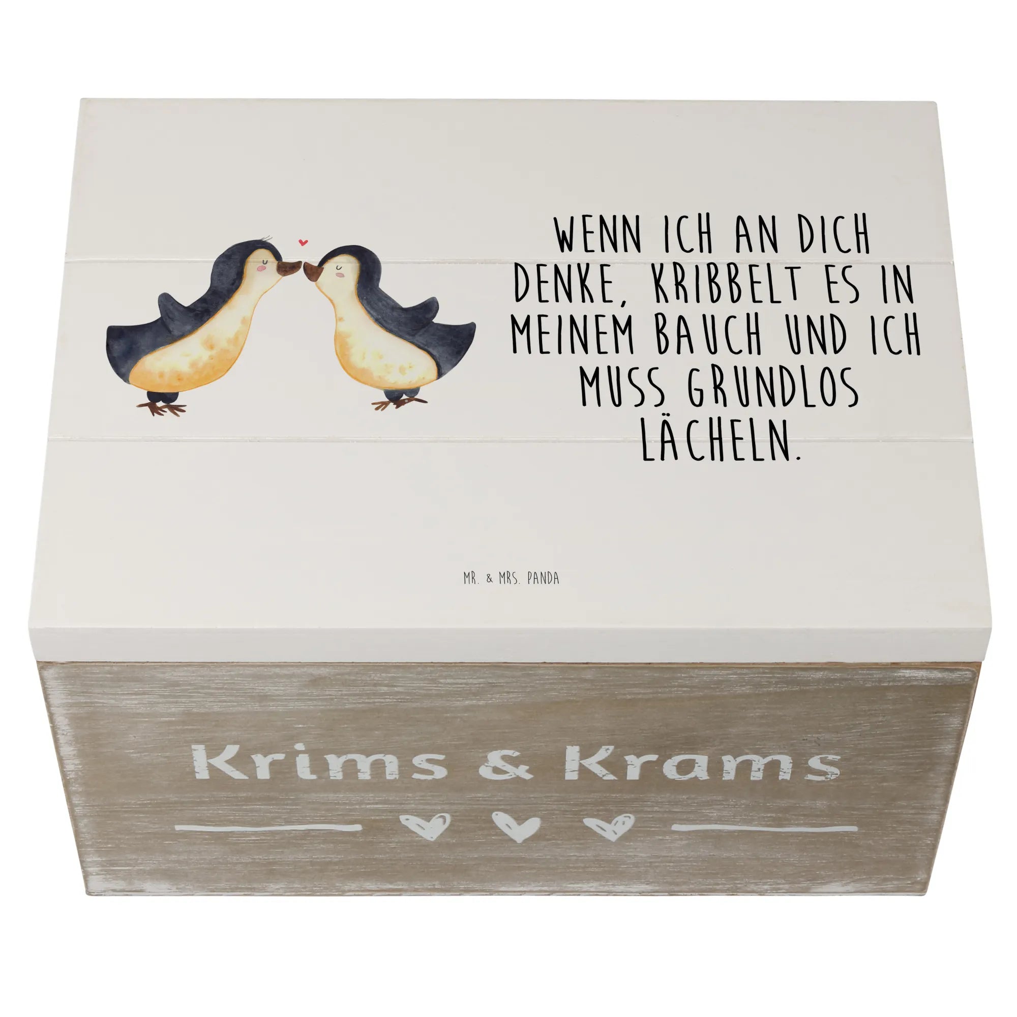 Das bezaubernde Design zeigt zwei niedliche Pinguine, die sich voller Zärtlichkeit umarmen und einen Kuss geben. Ein kleines Herz schwebt zwischen ihnen und symbolisiert die Liebe, die sie füreinander empfinden. Mit dem Slogan 'Wenn ich an dich denke, kribbelt es in meinem Bauch und ich muss grundlos lächeln' zaubert diese Kiste jedem ein Lächeln ins Gesicht.