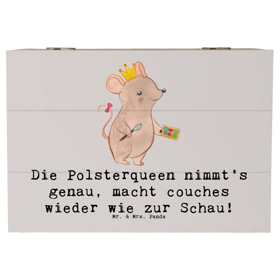 Die wunderschöne Holzkiste von Mr. & Mrs. Panda ist das perfekte Geschenk für alle, die die Kunst des Polsterhandwerks lieben. Mit einem liebevoll gestalteten Motiv der Polsterin und dem Spruch 'Die Polsterqueen nimmt's genau, macht couches wieder wie zur Schau!' wird diese Kiste zum Highlight in jedem Zuhause.